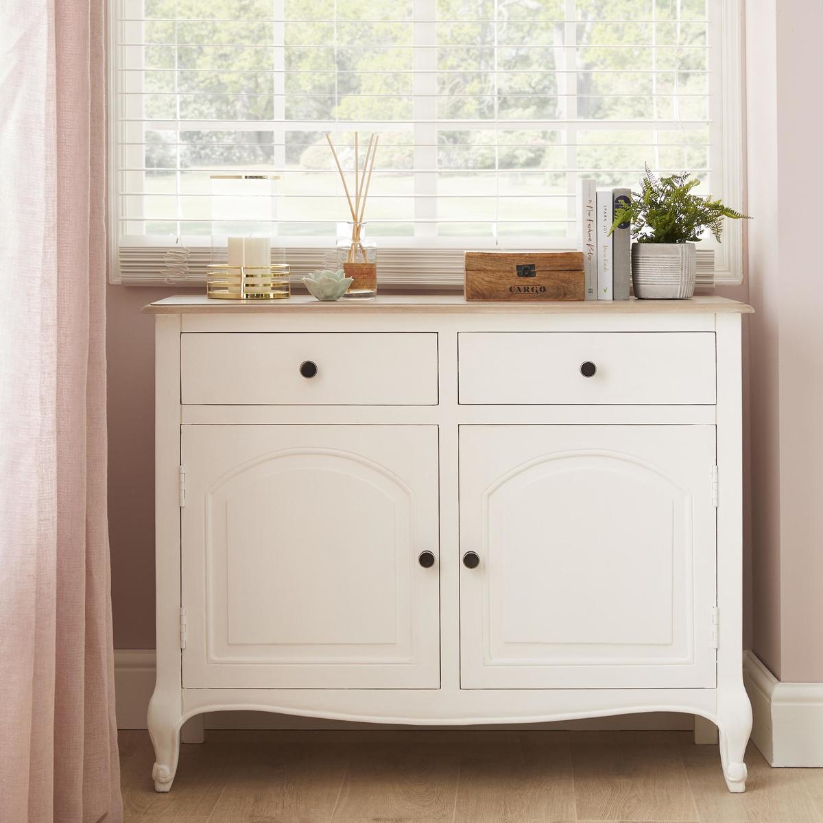 Dunelm Exclusive - Designed and Developed by Dunelm Featuring a beautiful Parisian-inspired design, the Amelie range is presented with intricate hand carved detail and a painted matte white finish with brush stroke effect. Constructed from solid parts of mango wood, this range comes with smooth running drawers with pull out stops and is finished with antique cast iron handles, offering your home a premium feel. Handmade in India this fully assembled small sideboard features two drawers and a two-door cupboard with hand carved details.