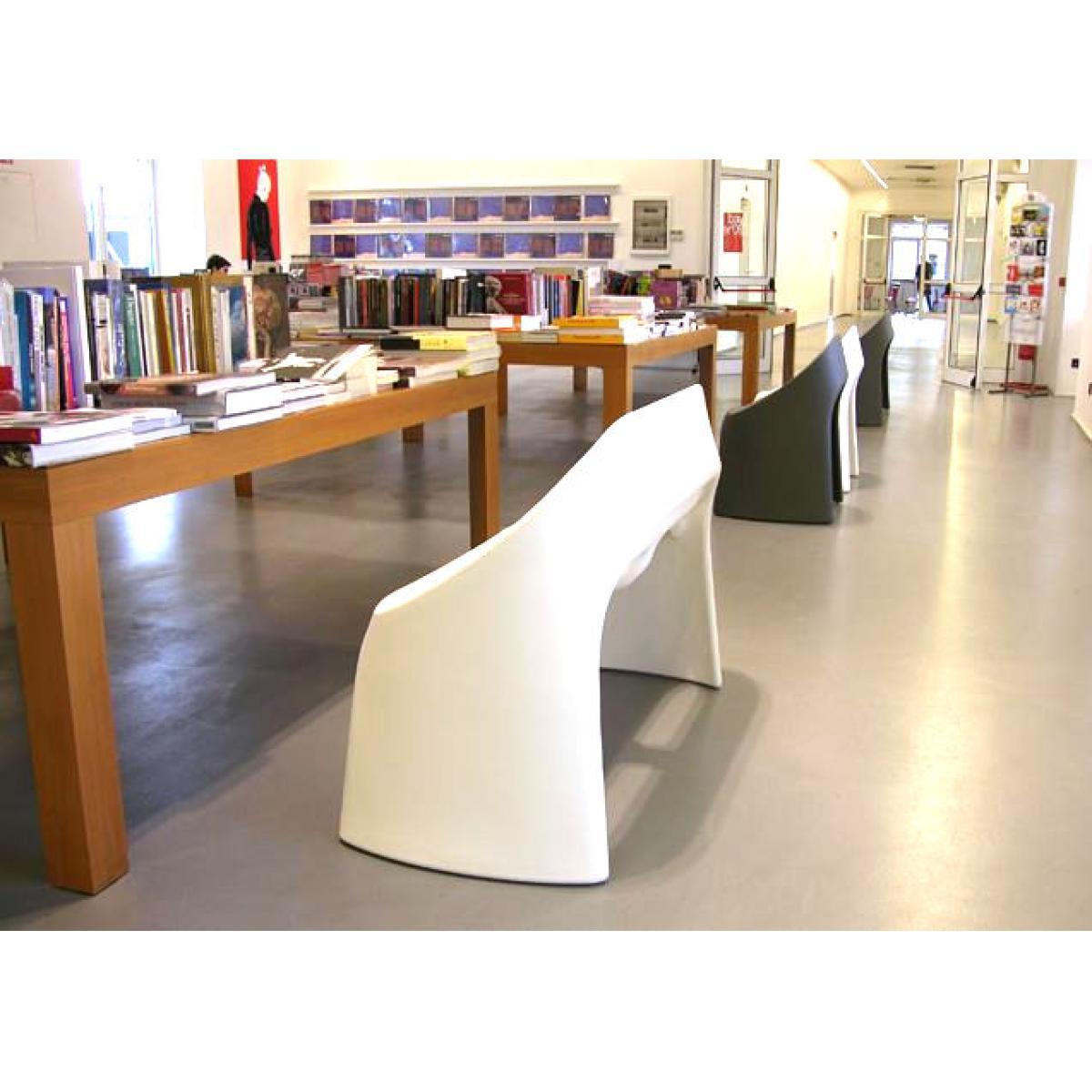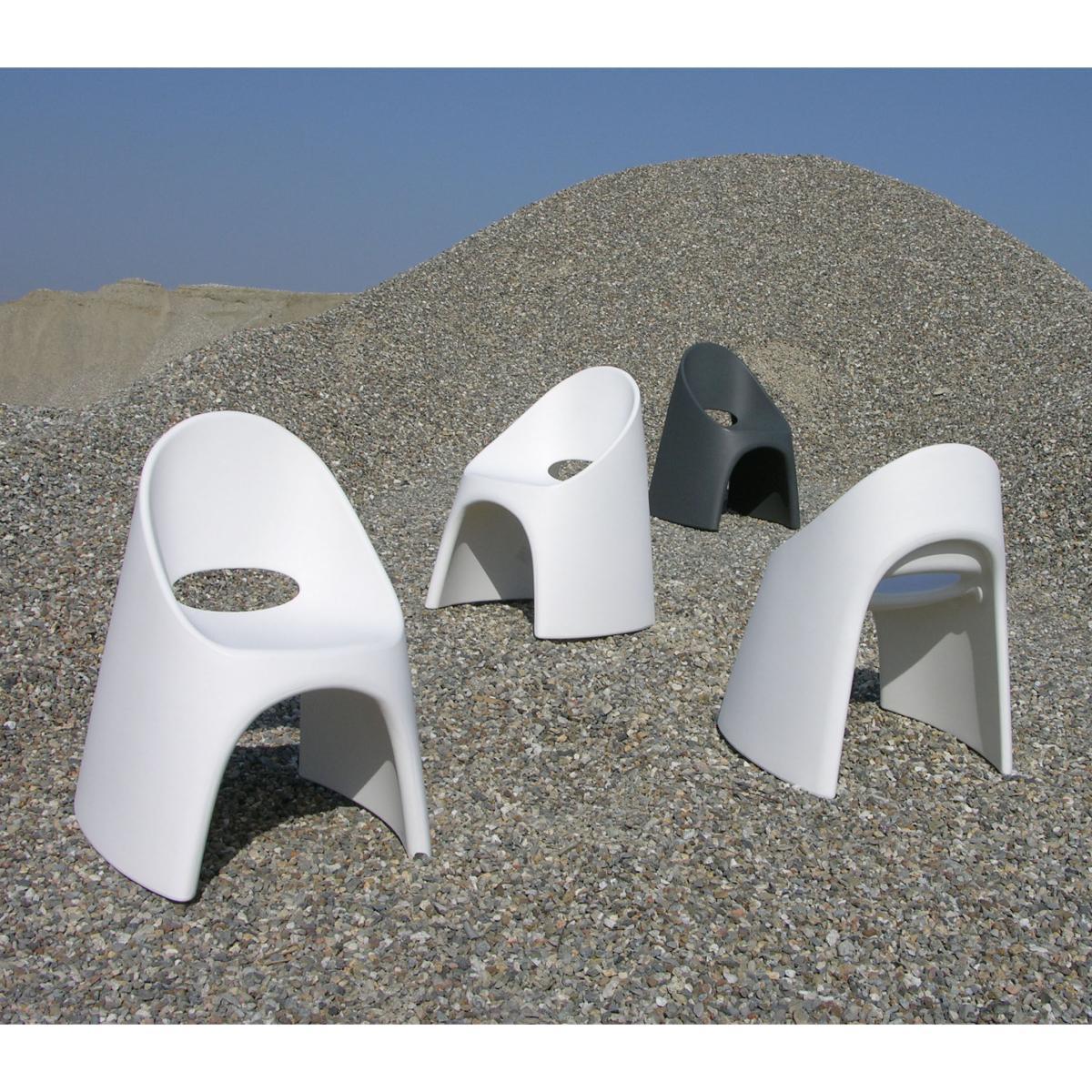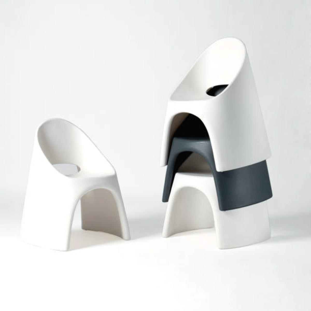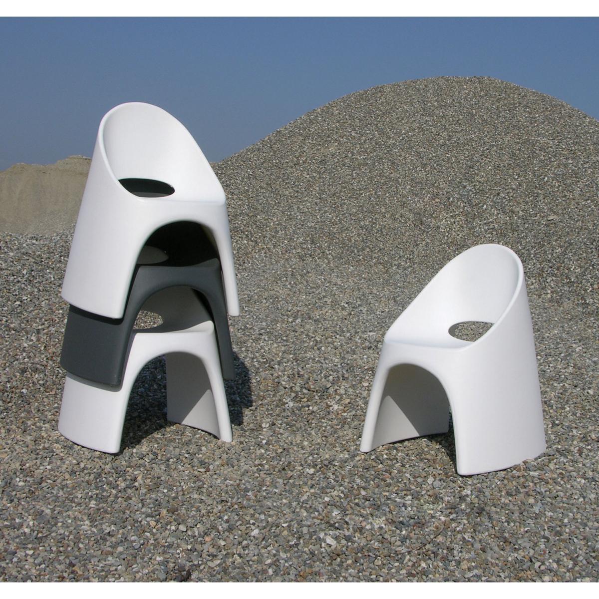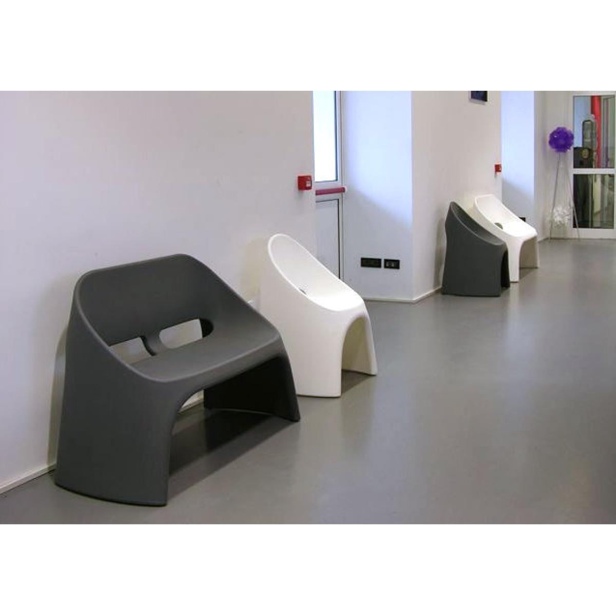 Reveal the fresh and very graphic line for this magnificent set - armchair and bench. This mono-block of polyethylene presents a welcoming silhouette with rounded edges. The open back allows comfort and ease. These are light, stackable, and can be used inside and out.