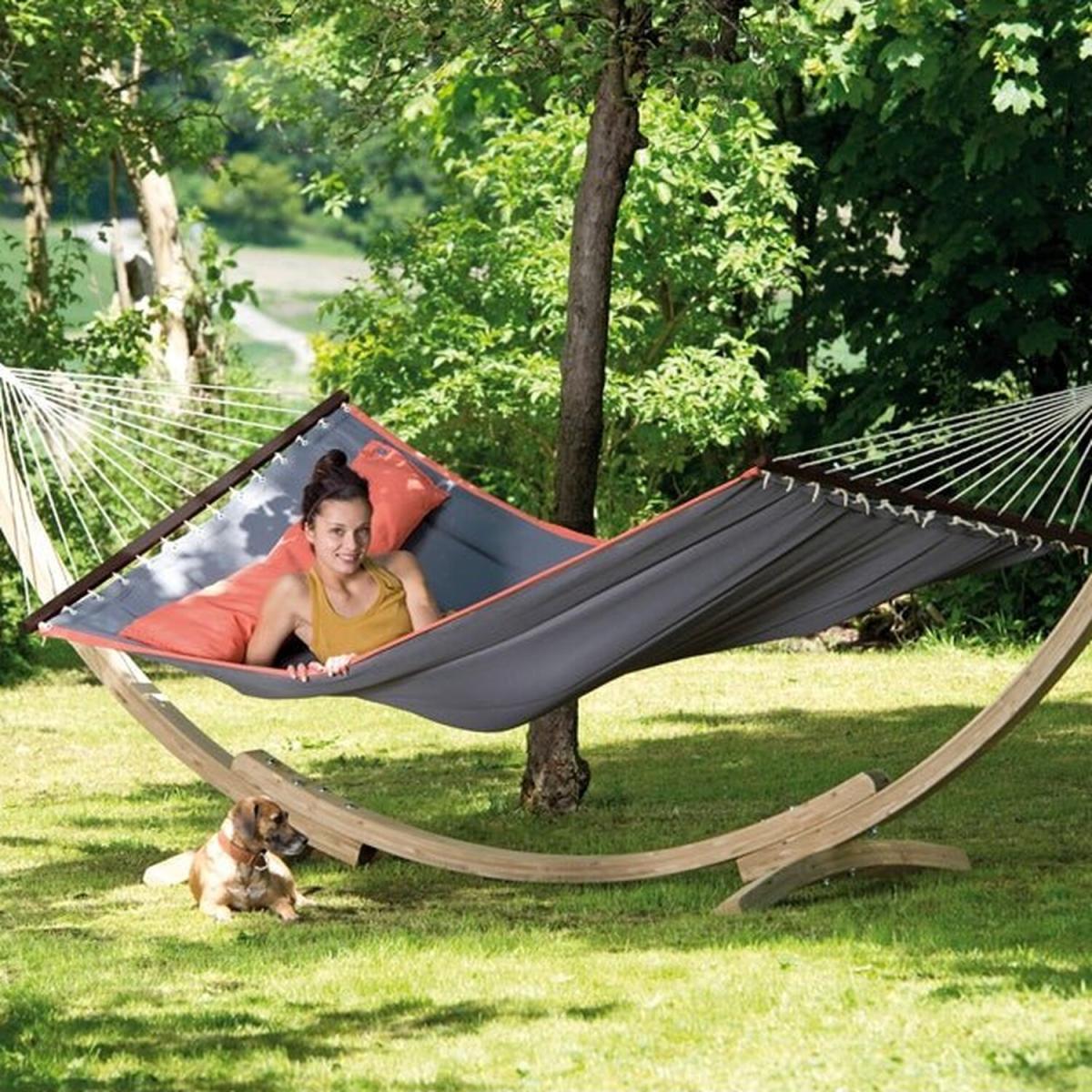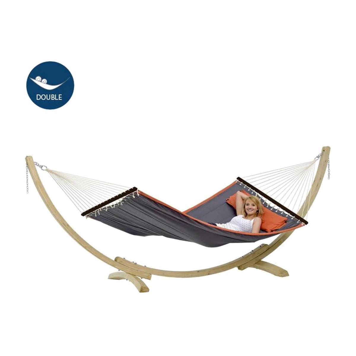 Spend quality time snuggled up as a family in this gorgeous hammock, which can be strung up between trees or from one of our compatible hammock stands. It is manufactured using extra strong fabrics. These large, softly padded rod hammocks are available in grey with a splash of orange detailing. Stylish and elegant design and hardwood spreader bars provide supreme strength and perfect comfort as a double hammock with plenty of additional room for a pet or child. The American Dream Hammock is durable, it can be left outside and is supplied with its own matching bag for storage and portability. The Apollo Hammock Stand has been specially treated so it can be left outside even withstanding our typical British weather! A great quality combination of stand and hammock, the ideal classy centrepiece for your garden.