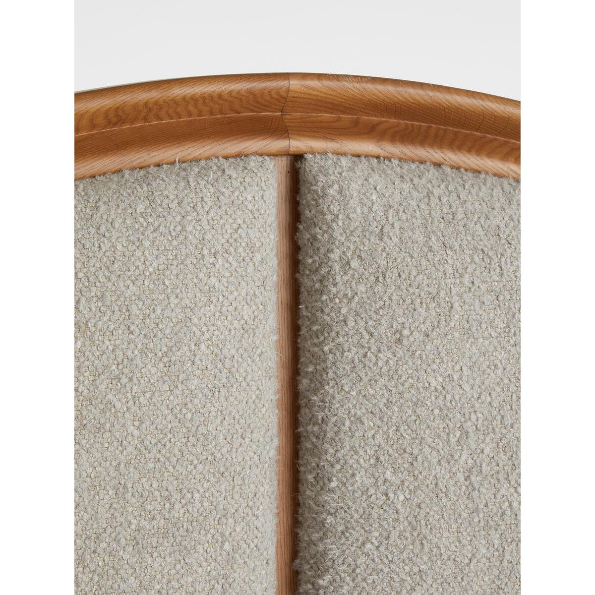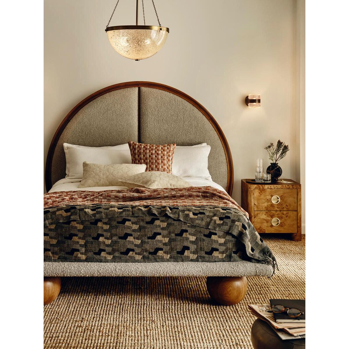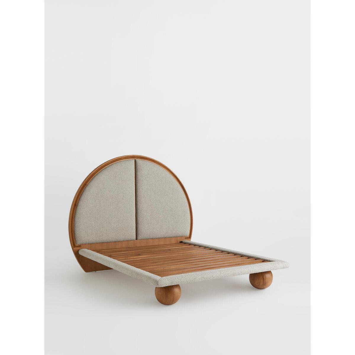 Inspired by Soho House Amsterdam, our oak Amery bed isupholstered in a textured boucle fabric, with carved detail thatruns along the linen-blend headboard. The bed is mounted onto solidwooden spheres, making it a statement piece for any bedroom. Oak bed. Rails upholstered in boucle. UK super king size. Solid wooden spheres. Grey linen-blend headboard. Carved wooden detail runs through headboard. Channel detail on the outer edge. Inspired by Soho House Amsterdam.