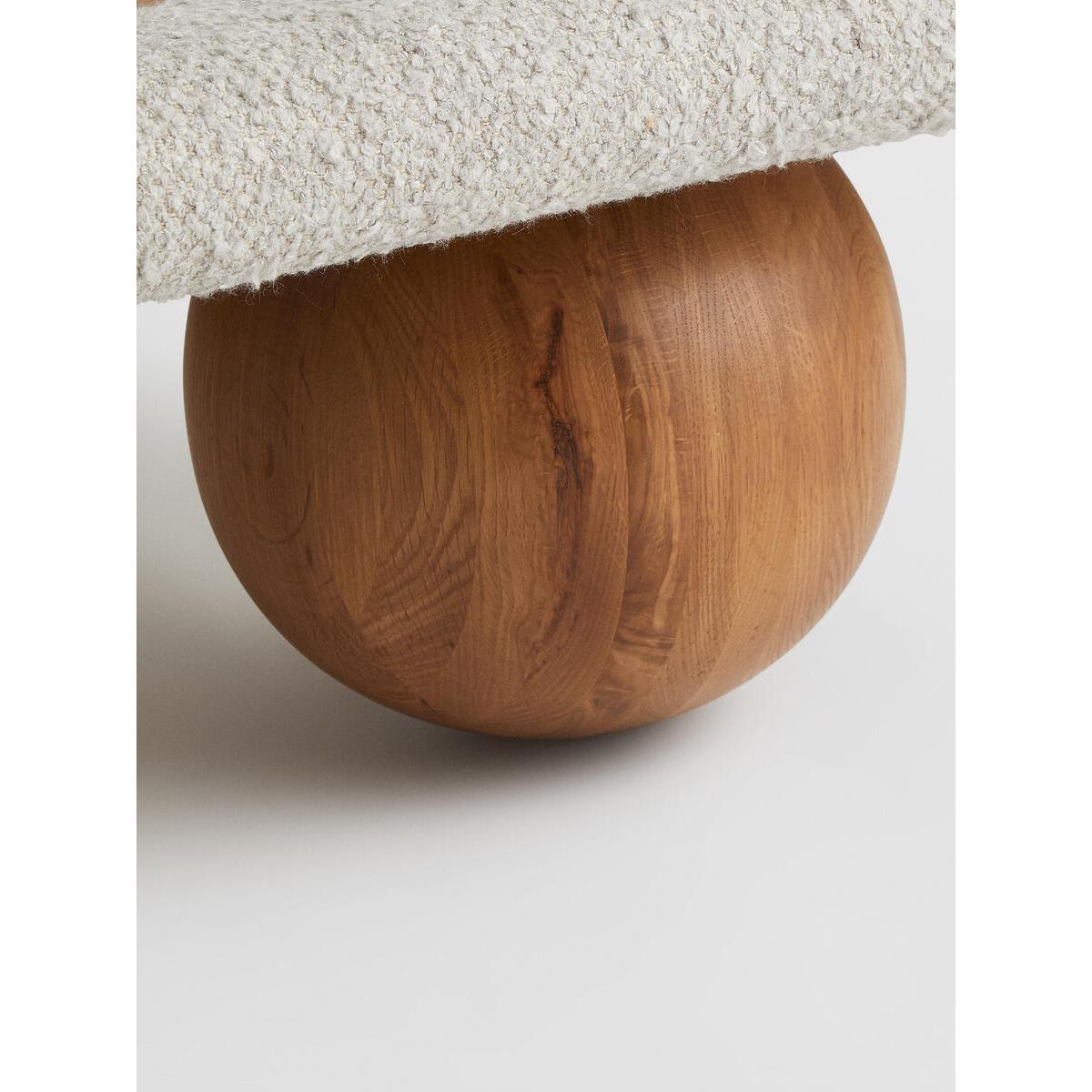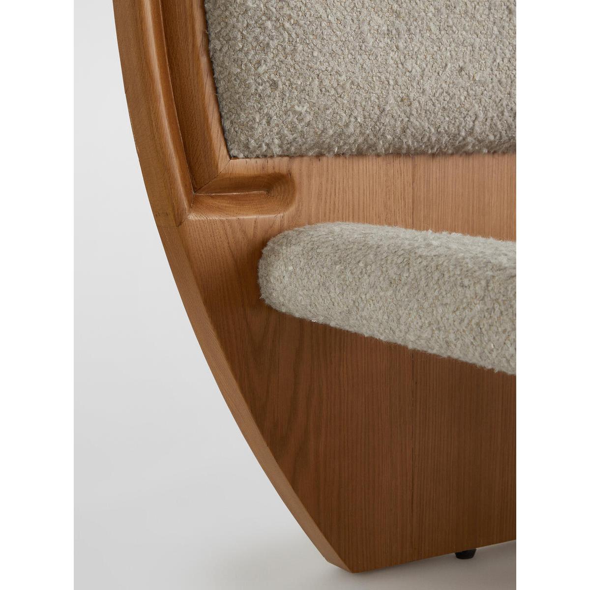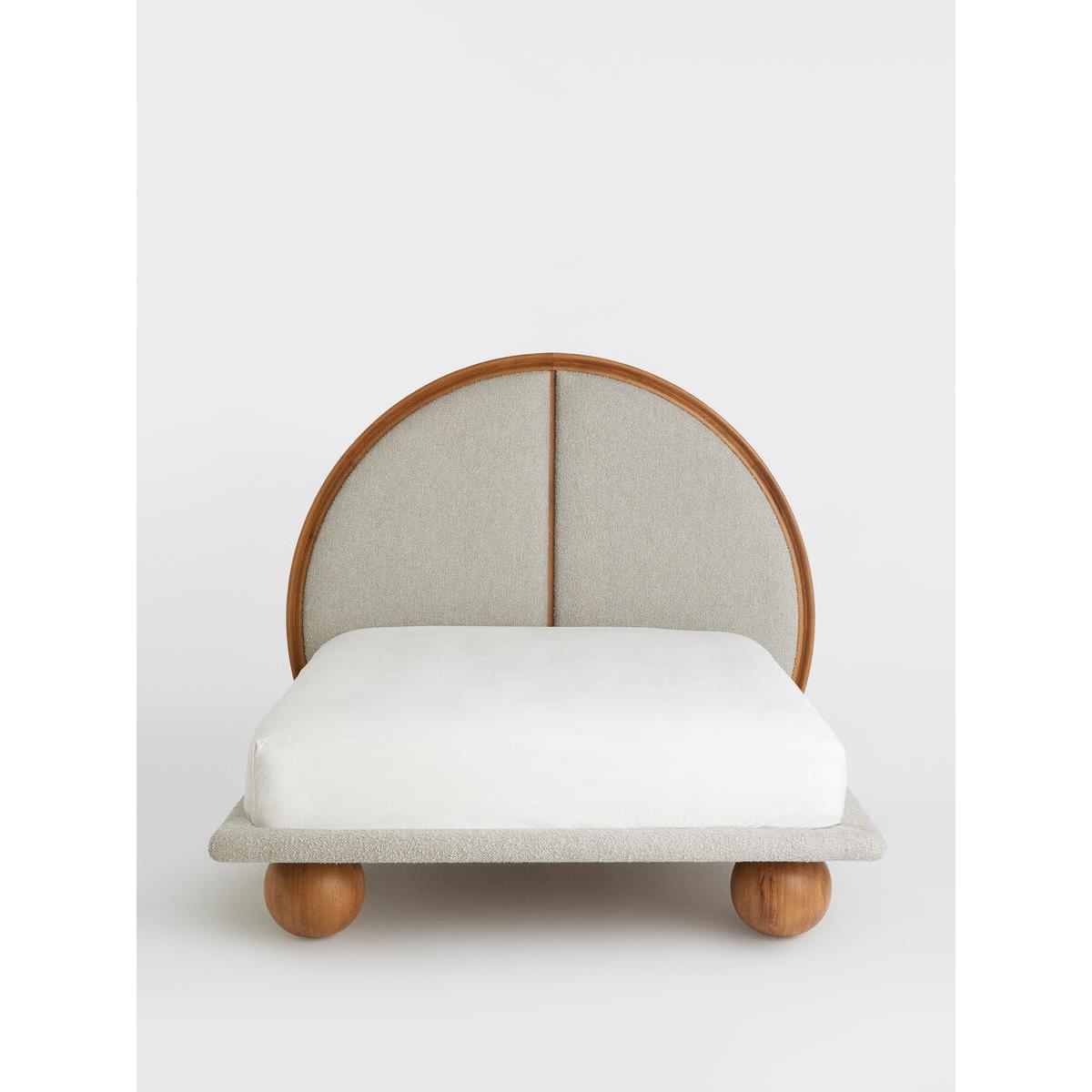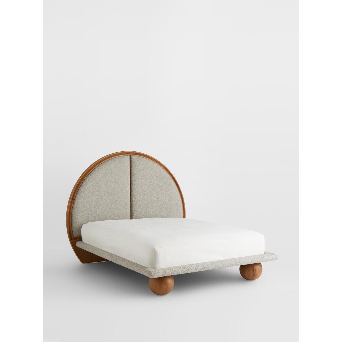 Inspired by Soho House Amsterdam, our oak Amery bed isupholstered in a textured boucle fabric, with carved detail thatruns along the linen-blend headboard. The bed is mounted onto solidwooden spheres, making it a statement piece for any bedroom. Oak bed. Rails upholstered in boucle. UK super king size. Solid wooden spheres. Grey linen-blend headboard. Carved wooden detail runs through headboard. Channel detail on the outer edge. Inspired by Soho House Amsterdam.