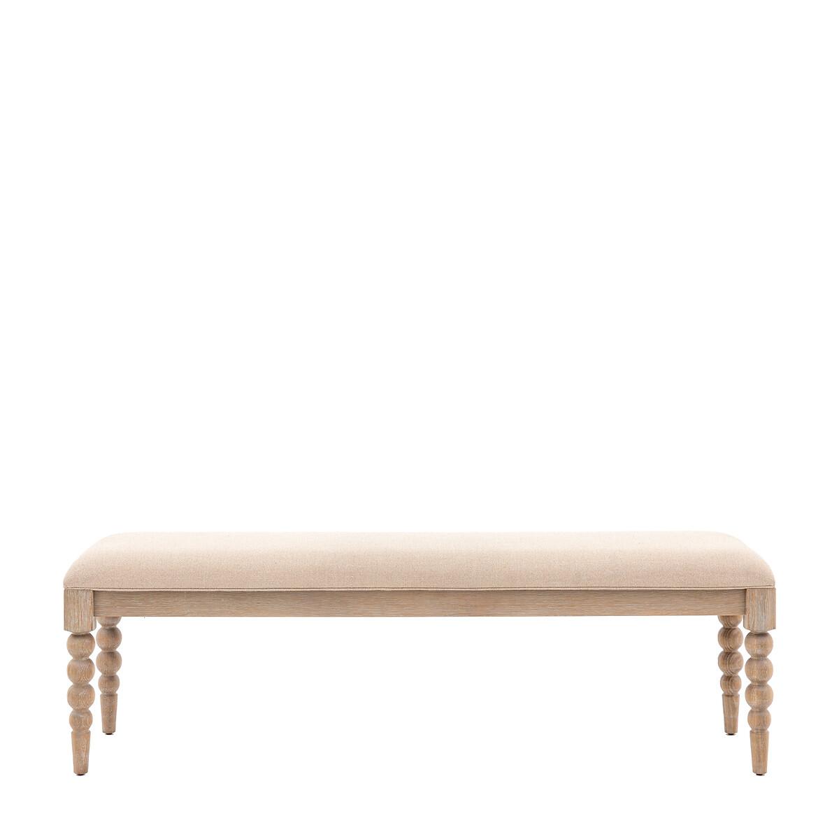 Traditional with a twist - literally! The eye-catching legs on this beautiful dining bench feature hand-crafted bobbing detail which is created by turning the wood on a lathe, a task carried out by the finest craftsmen, and a little play on the classic barleytwist look. Crafted from the finest solid oak and oak veneers, a very subtle lime wash tone to the finish creates a soft and mellow look, which perfectly pairs with beautiful biscuit coloured fabric for the upholstered seat. This would also work perfectly in luxury traditional style bedrooms as an end of bed bench. Product Details • Seats 3 • Solid oak legs with pale lime wash finish • Linen upholstery • Partial assembly required - legs/feet only. Product Composition - Oak 70% / Oak Veneer Plywood 12% / Pine 18% Product Dimensions - 40 cm x145 cm x47 cm , Weight - 12.5 KGSeat Height - 70 cm. Seat Width between arms - 145 cm. Seat Depth - 40 cm Leg / Feet Height - 39.5 cm Clearance to Floor - 39.5 cm Package Dimensions - 152 cm x 47 cm x 21 cm, Weight 16.5 kg. This product will be dispatched by one of our trusted suppliers. You’ll be contacted by their selected courier about your delivery. Please note: this product cannot be delivered to all Offshore Islands, Northern Ireland or Republic of Ireland. GALLE01