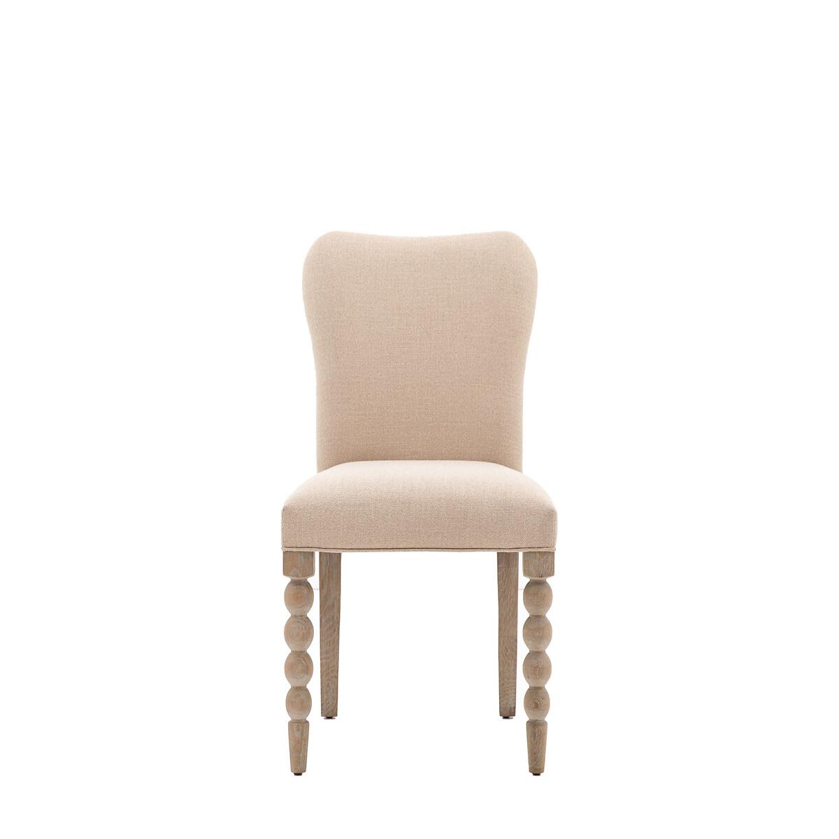 Featuring a fully upholstered seat and beautiful oak legs, this set of 2 stunning dining chairs will make a classy addition to any dining room. A play on theclassic barleytwist look, the front legs feature hand-crafted bobbing detail which is created by turning the wood on a lathe, a task carried out by the finest craftsmen. The wood has a very subtle lime wash tone to the finish which is soft and mellow, and looks beautiful paired with biscuit coloured fabric for the upholstered seat. A subtle handle at the back of the chair makes it easy to manoeuvre. Product Details • Set of 2 • Solid oak legs with pale lime wash finish • Linen upholstery • Partial assembly required - legs/feet only. Product Composition - Oak 47% / Acacia 39% / Plywood 14% Product Dimensions - 60 cm x47 cm x92 cm , Weight - 15 KGSeat Height - 43 cm. Seat Width between arms - 47 cm. Seat Depth - 41 cm Leg / Feet Height - 44 cm Clearance to Floor - 44 cm Package Dimensions - 103 cm x 88 cm x 52 cm, Weight 20 kg. This product will be dispatched by one of our trusted suppliers. You’ll be contacted by their selected courier about your delivery. Please note: this product cannot be delivered to all Offshore Islands, Northern Ireland or Republic of Ireland. GALLE01