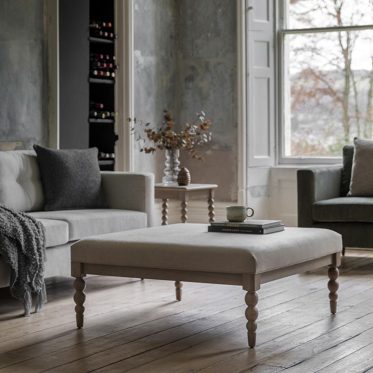 The eye-catching legs on this beautiful coffee table feature hand-crafted bobbing detail which is created by turning the wood on a lathe, a task carried out by the finest craftsmen. The table is made from oak with a very subtle lime wash tone to the finish which is soft and mellow, paired with biscuit coloured fabric for the upholstered seat. Matching pieces are available. Product Details • Crafted using solid oak supported by oak veneer MDF for additional support • Pale lime wash finish • Turned feet made from solid oak • Fully assembled. Product Composition - Oak 66% / Oak Veneer MDF 14% / Plywood 10% / Pine 10% Product Dimensions - 100 cm x100 cm x40 cm , Weight - 19.5 KGLeg / Feet Height - 32.5 cm Clearance to Floor - 32.5 cm Package Dimensions - 107 cm x 107 cm x 25 cm, Weight 25 kg. This product will be dispatched by one of our trusted suppliers. You’ll be contacted by their selected courier about your delivery. Please note: this product cannot be delivered to all Offshore Islands, Northern Ireland or Republic of Ireland.