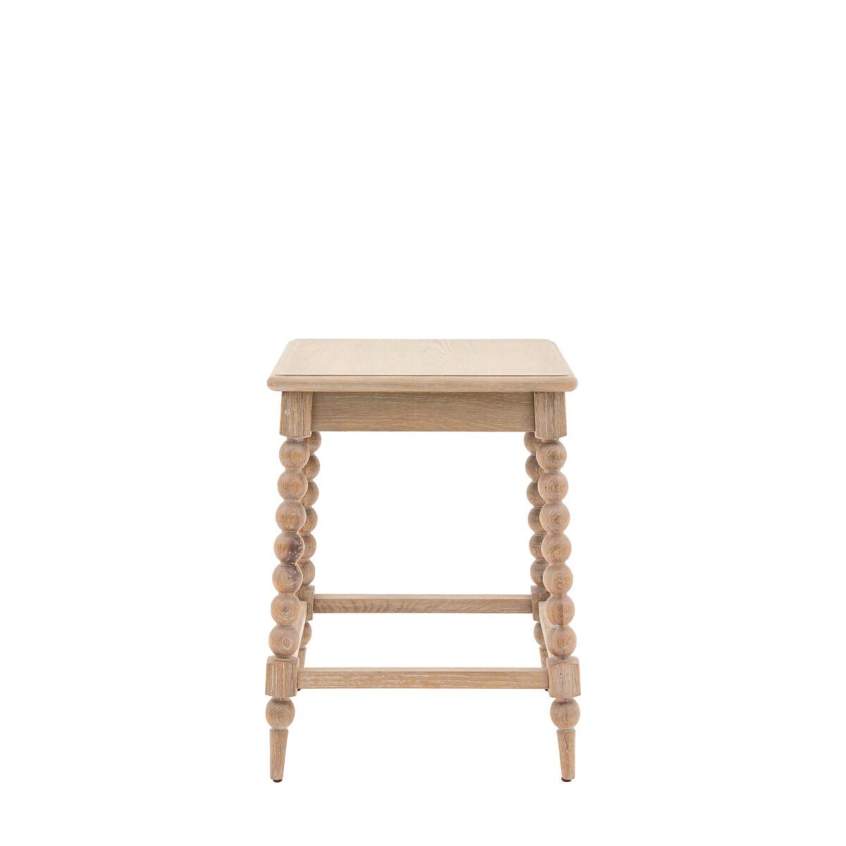 This stunning side table would make a stylish, classy addition to any interior. The play on a classic look emphasises the hand-crafted bobbing detail down each leg. This eye-catching design feature is created by turning the wood on a lathe, a task carried out by the finest craftsmen. The table is made using beautiful oak solids and veneers where practical, with a very subtle lime wash tone to the finish which is soft and mellow. Matching pieces are available. Product Details • Product Composition - Oak 75% / Oak Veneer MDF 15% / Plywood 10% Product Dimensions - 45 cm x45 cm x59 cm , Weight - 8.5 KGLeg / Feet Height - 56.9 cm Clearance to Floor - 56.9 cm Package Dimensions - 69 cm x 52 cm x 52 cm, Weight 13 kg. This product will be dispatched by one of our trusted suppliers. You’ll be contacted by their selected courier about your delivery. Please note: this product cannot be delivered to all Offshore Islands, Northern Ireland or Republic of Ireland.