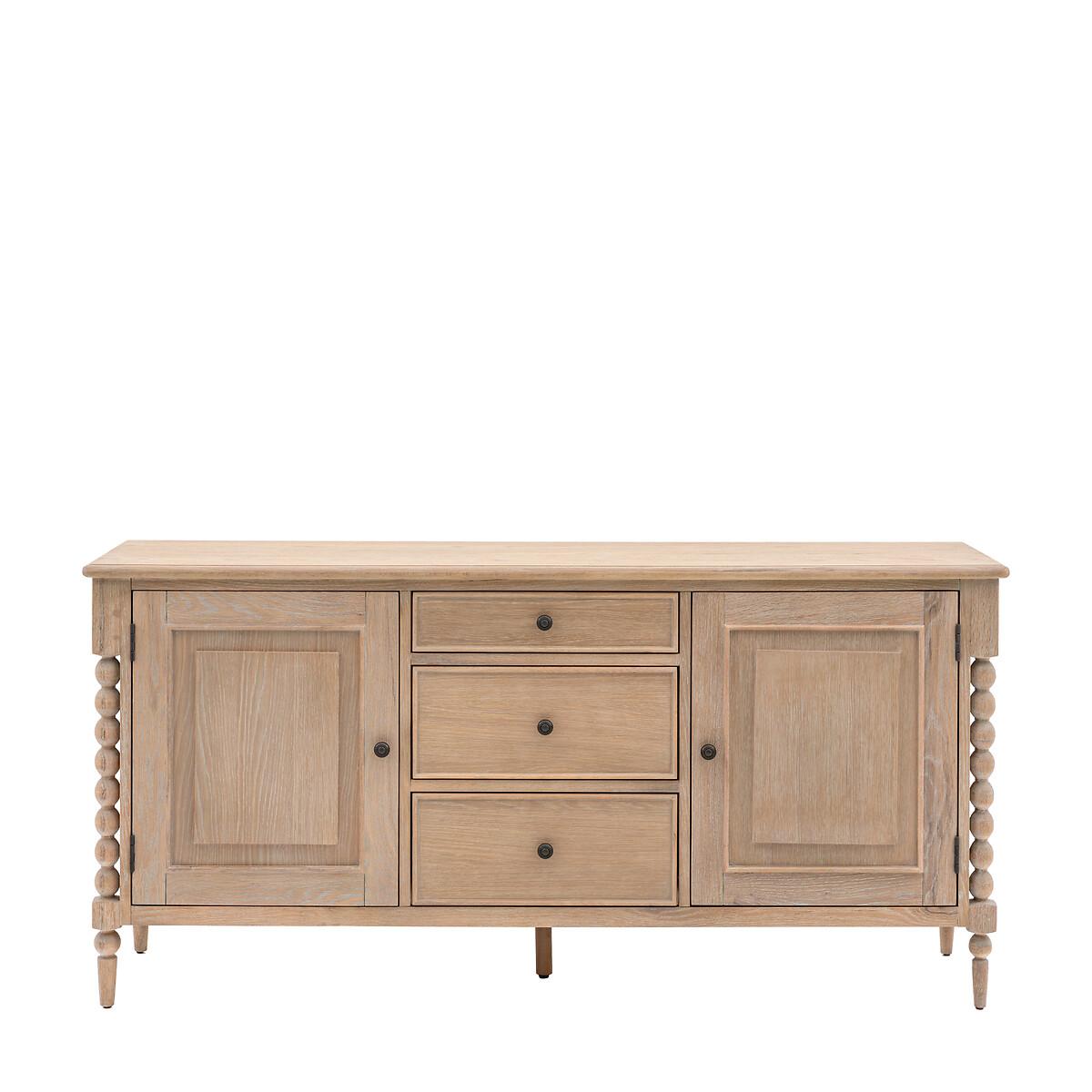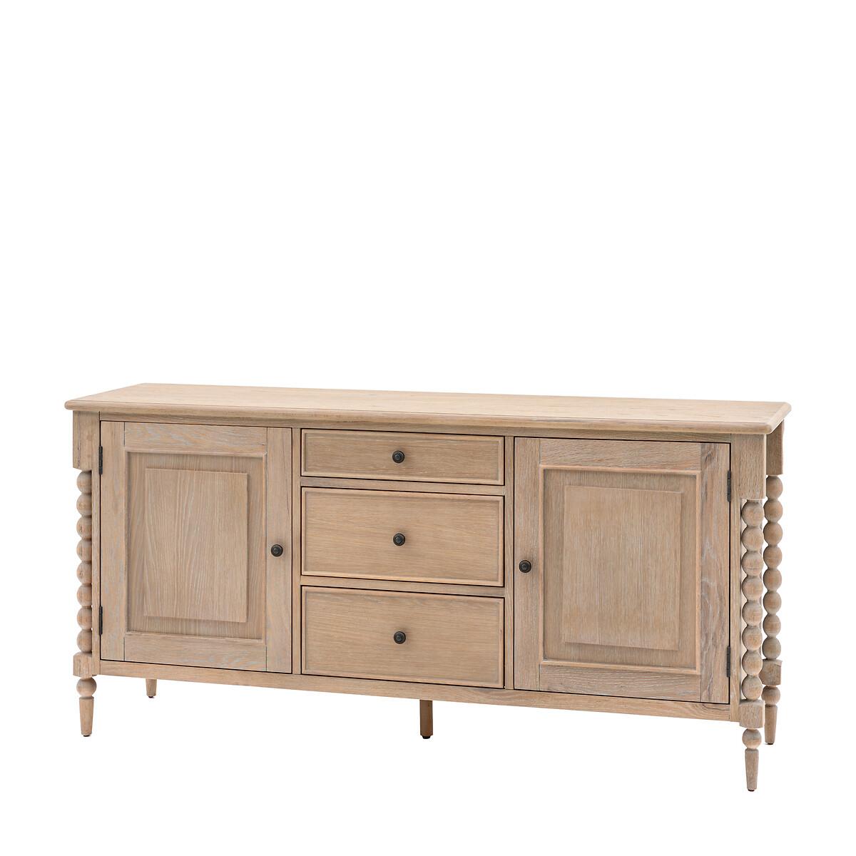 A play on a classic barleytwist look, this sideboard features a carved pompom effect created with hand-crafted bobbing detail down each corner. This elegant design feature is created by turning the wood on a lathe, a task carried out by the finest craftsmen. Made using solid oak, a durable wood with a beautiful grain, it is finished with a very subtle lime wash tone to create a soft and mellow look. Product details • Three drawers • Two cupboards with central shelf (adjustable) • Crafted using solid oak supported by oak veneer MDF for additional support • Pale lime wash finish • Rounded vintage brass metal knobs • Turned feet made from solid oak • Central support leg for added stability • Fully finished back • Anti topple kit included • Fully assembled. Product Composition - Oak 67% / Oak Veneer MDF 15% / Plywood 8% / Pine 10% Product Dimensions - 45 cm x 166 cm x 80 cm , Weight - 61 KGLeg / Feet Height - 7.5 cm Clearance to Floor - 7.5 cm. Internal Cupboard Size - W47.5 x D40.5 x H56.5 cm Distance between shelves - Adjustable Package Dimensions - 173 cm x 90 cm x 52 cm, Weight 74 KGThis product will be dispatched by one of our trusted suppliers. You’ll be contacted by their selected courier about your delivery. Please note: this product cannot be delivered to all Offshore Islands, Northern Ireland or Republic of Ireland. GALLE01