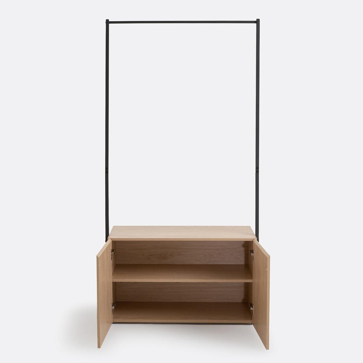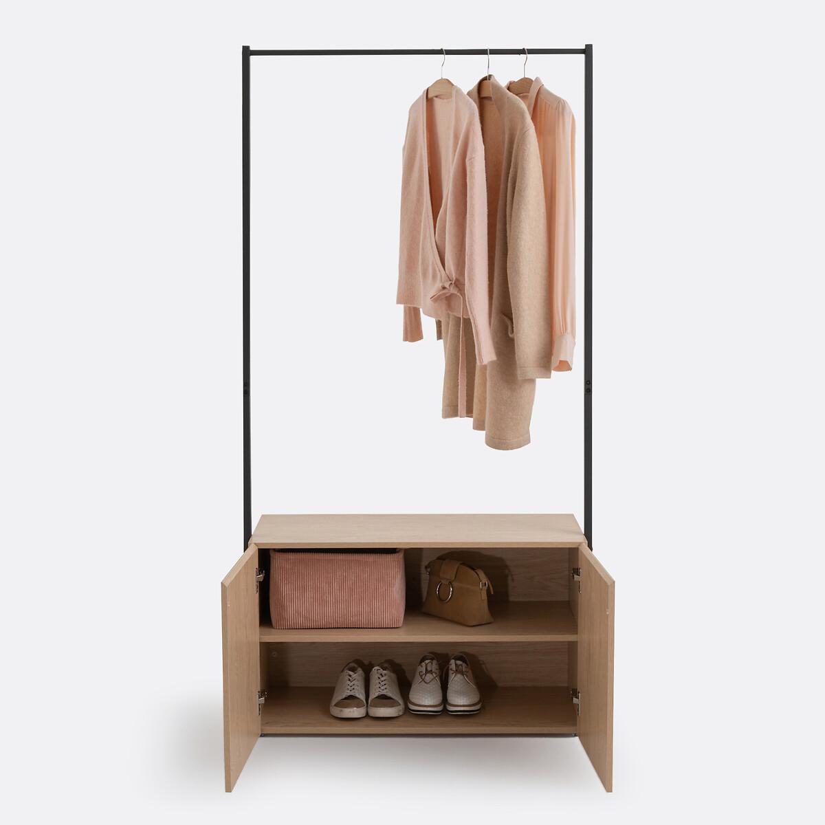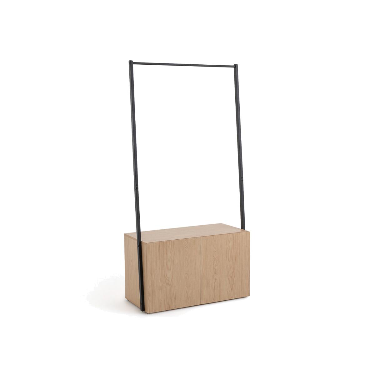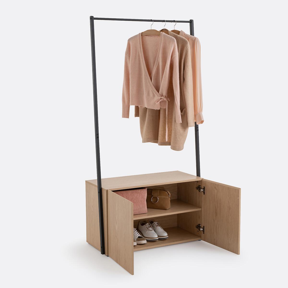Looking for a smart piece of furniture for your hallway? In addition to its inclined hanging rail, it has a cupboard to store your shoes or other fashion accessories: a simple and practical solution. The contrast between its metal structure and its oak decorative boxes elevates any interior. You'll love returning home. Product Details • Structure and hanging rail in black metal with matt effect epoxy finish • Unit and shelf in melamie particle board with natural oak decor. Dimensions • Length: 90cm • Height: 175cm • Depth: 40cm • Weight: 18kgDelivery:. Assembly required. Available for home delivery. Dimensions and weight of parcel • 1 parcel • L100 x H16.5 x D49.5cm. 20kg