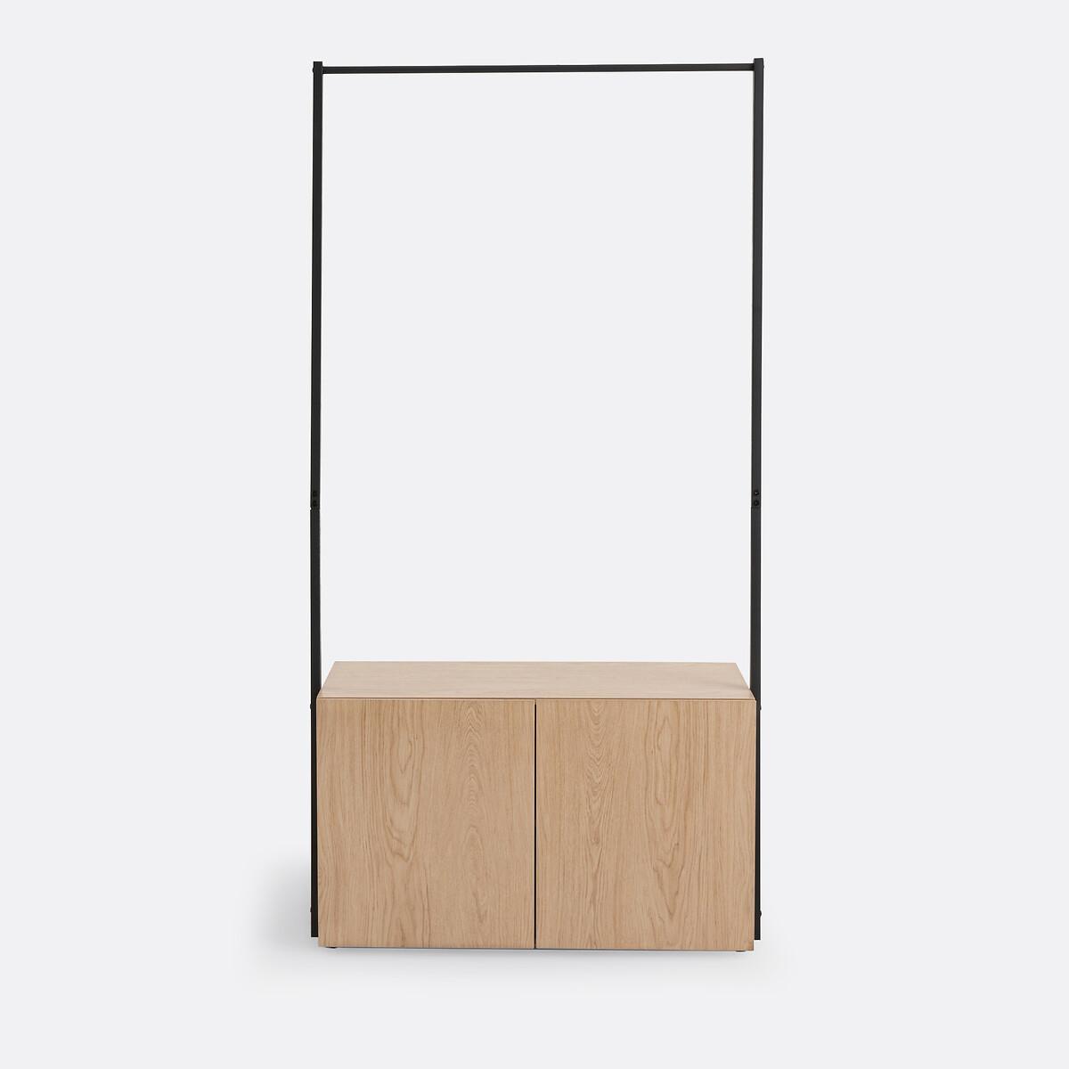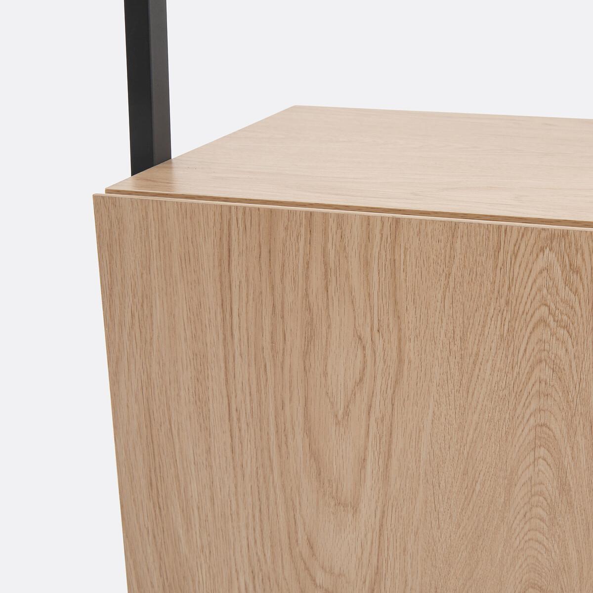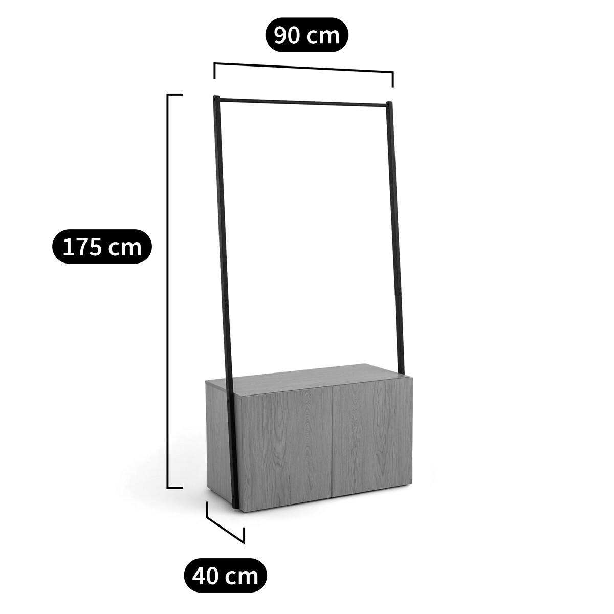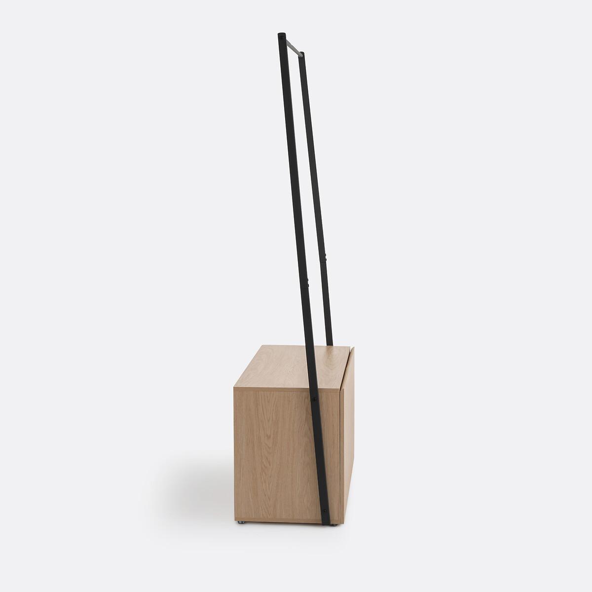 Looking for a smart piece of furniture for your hallway? In addition to its inclined hanging rail, it has a cupboard to store your shoes or other fashion accessories: a simple and practical solution. The contrast between its metal structure and its oak decorative boxes elevates any interior. You'll love returning home. Product Details • Structure and hanging rail in black metal with matt effect epoxy finish • Unit and shelf in melamie particle board with natural oak decor. Dimensions • Length: 90cm • Height: 175cm • Depth: 40cm • Weight: 18kgDelivery:. Assembly required. Available for home delivery. Dimensions and weight of parcel • 1 parcel • L100 x H16.5 x D49.5cm. 20kg