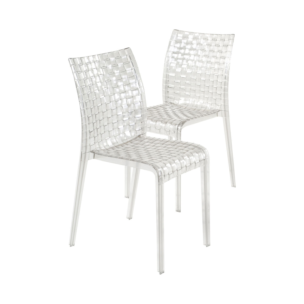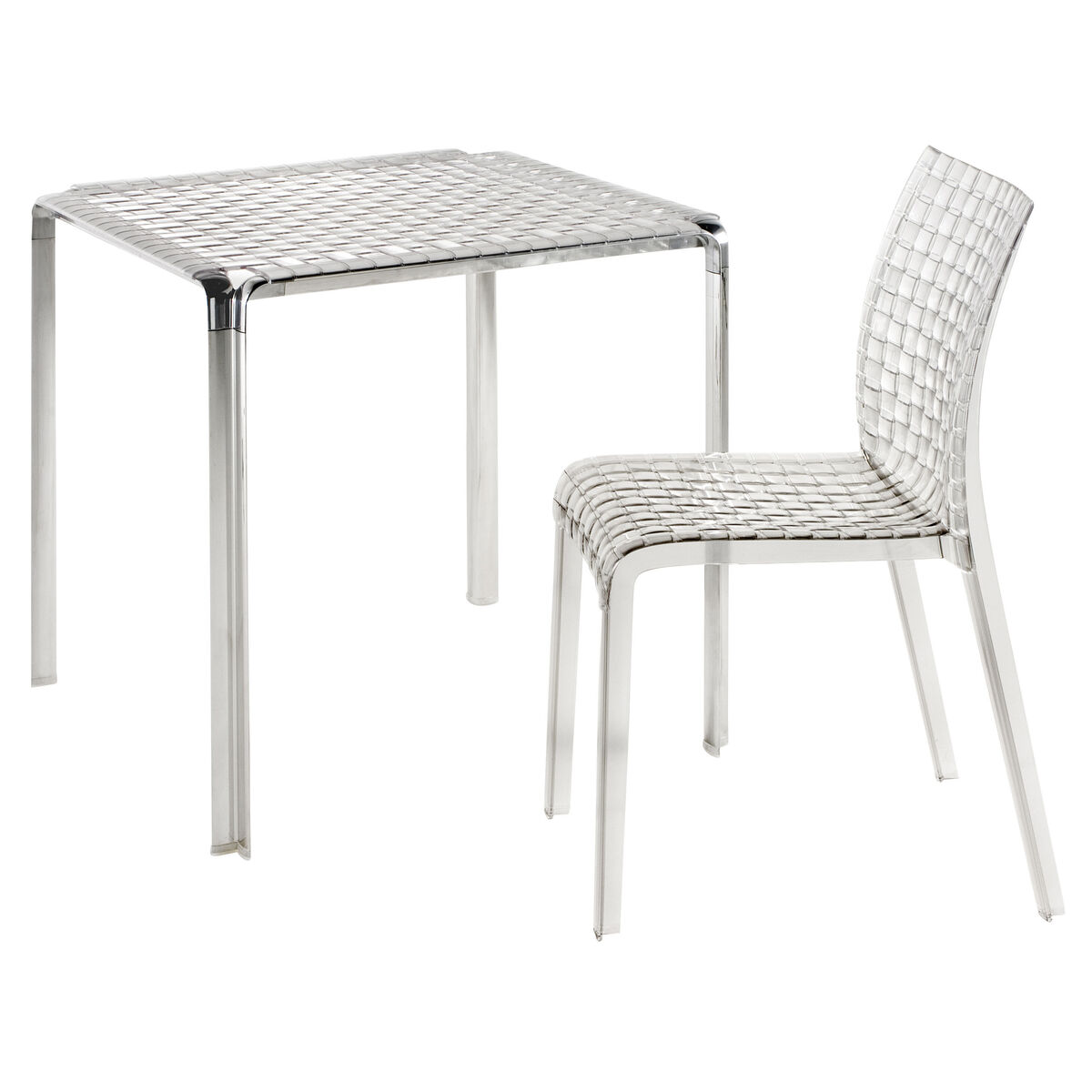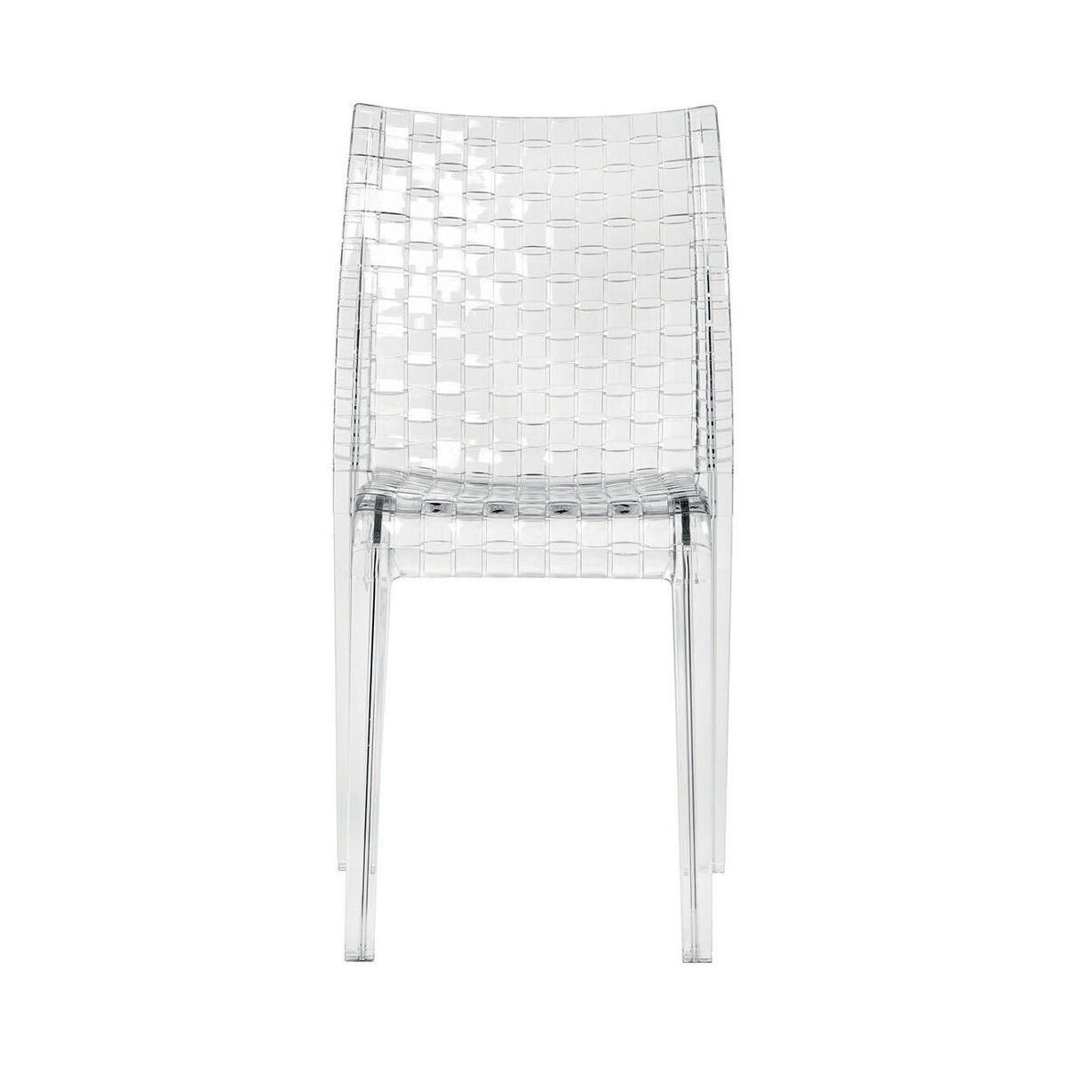 "Inspired by the weave of a fabric, but made from polycarbonate in a single mould, Ami Ami (""weaving"" in Japanese), is the new chair designed by Tokujin Yoshioka, a new addition to the Kartell team. Ami Ami was born out of the desire to reproduce woven effects, the typical stylistic hallmark of Japanese culture. The simple square lines contrast with the rich decorative motif, visible on both the inner and outer surfaces and created using a complex process. Ami Ami combines references to Oriental culture with the use of innovative materials like polycarbonate and is available in a range of delicate colours - amber, mother of pearl, smoke grey, opaline and transparent - and the saturated shades of white, red and black. The chair is accompanied by a table with aluminium legs and a 70x70 cm square polycarbonate top entirely covered with the same woven motif. ".