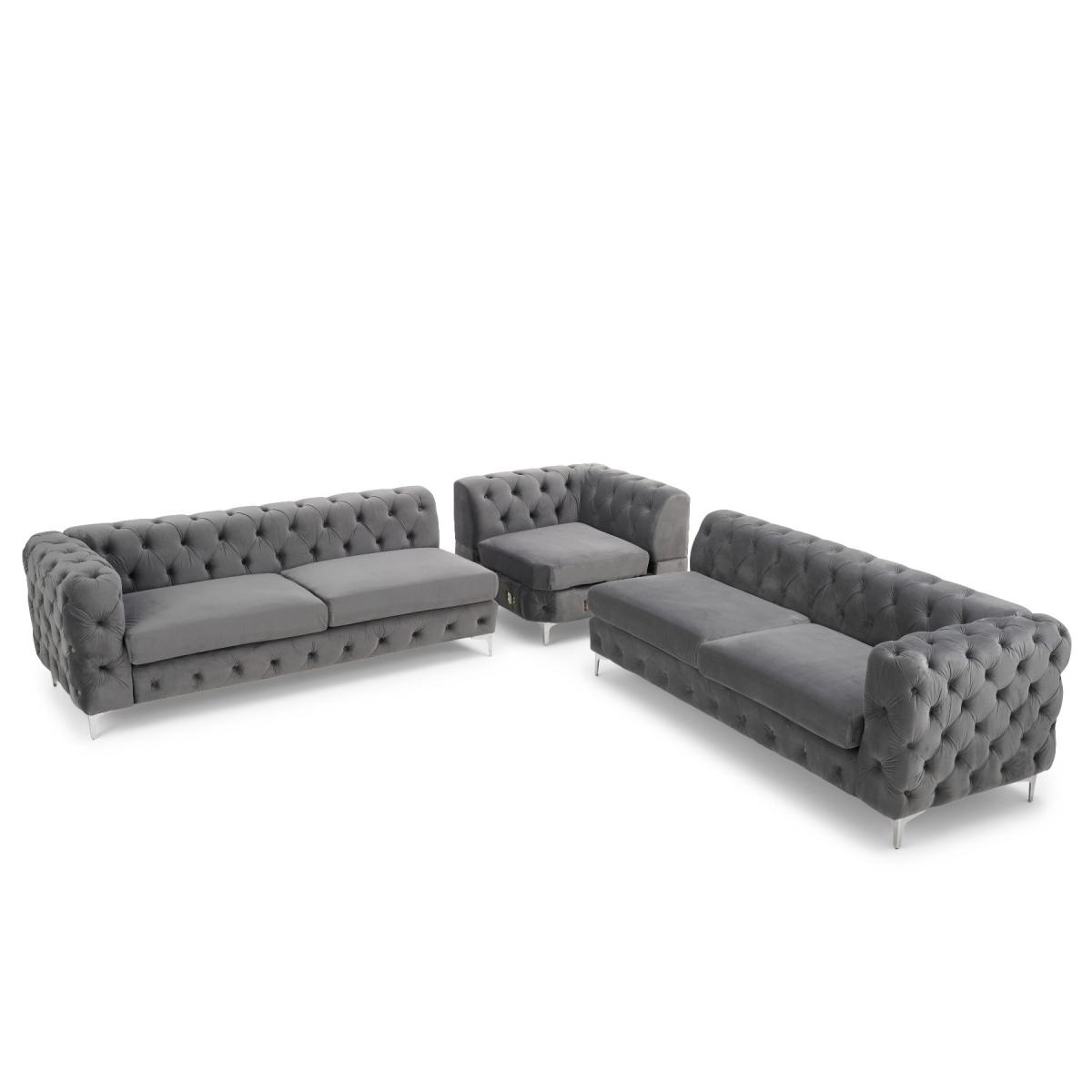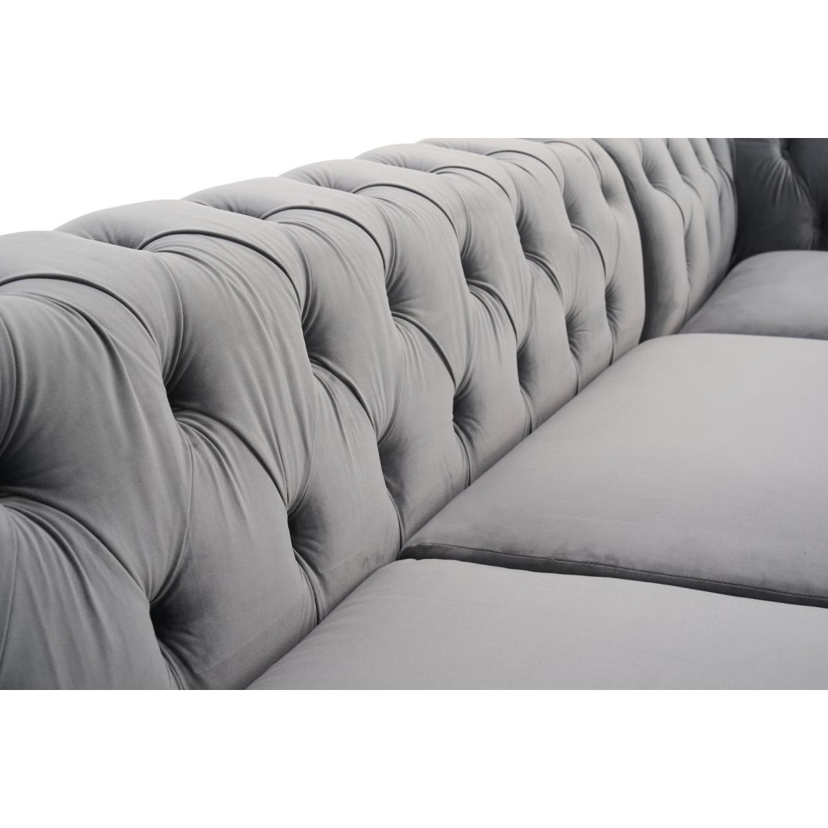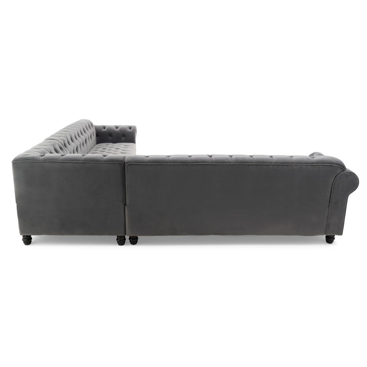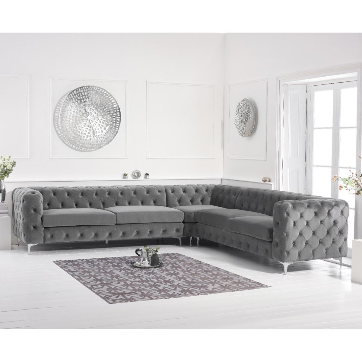 The Amira Grey Velvet Corner Sofa combines a classic chesterfield design with modern trends, perfect for stylish homes and living rooms.