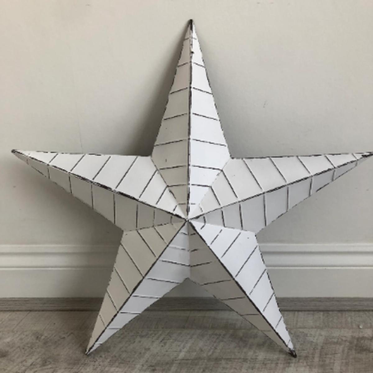 These whitewashed metal barn stars will come with distressed markings and will individually have their own character. There may be small marks and small scratches to the paint as they are made to be distressed with an aged appearance. A medium-sized white washed rough luxe metal barn star. 52cm x 49.5cm
