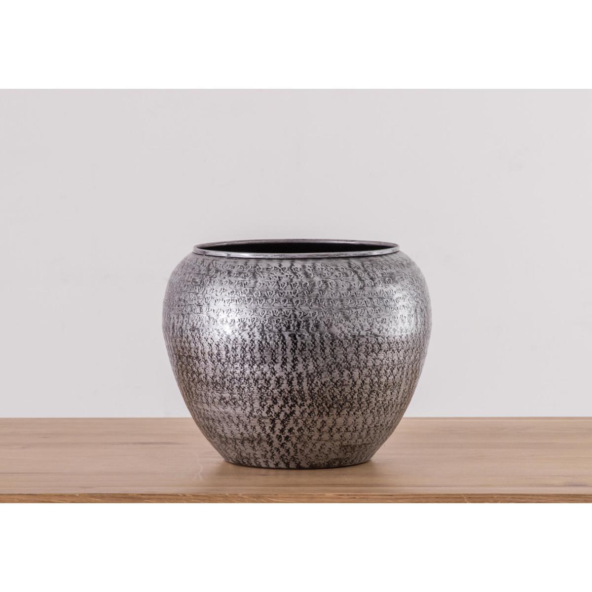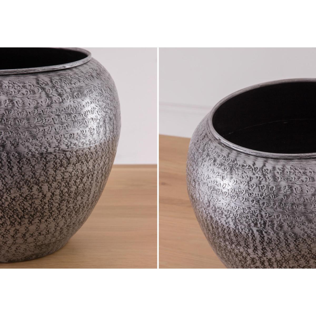 Simply stylish, the Amoli Antiqued Silver Planter is sure to stand out in your home. With a classic conical orb shape crafted from Dark Grey Nickel and with a hammered design running throughout, the piece is both functional and attractive as a stand alone statement piece.
