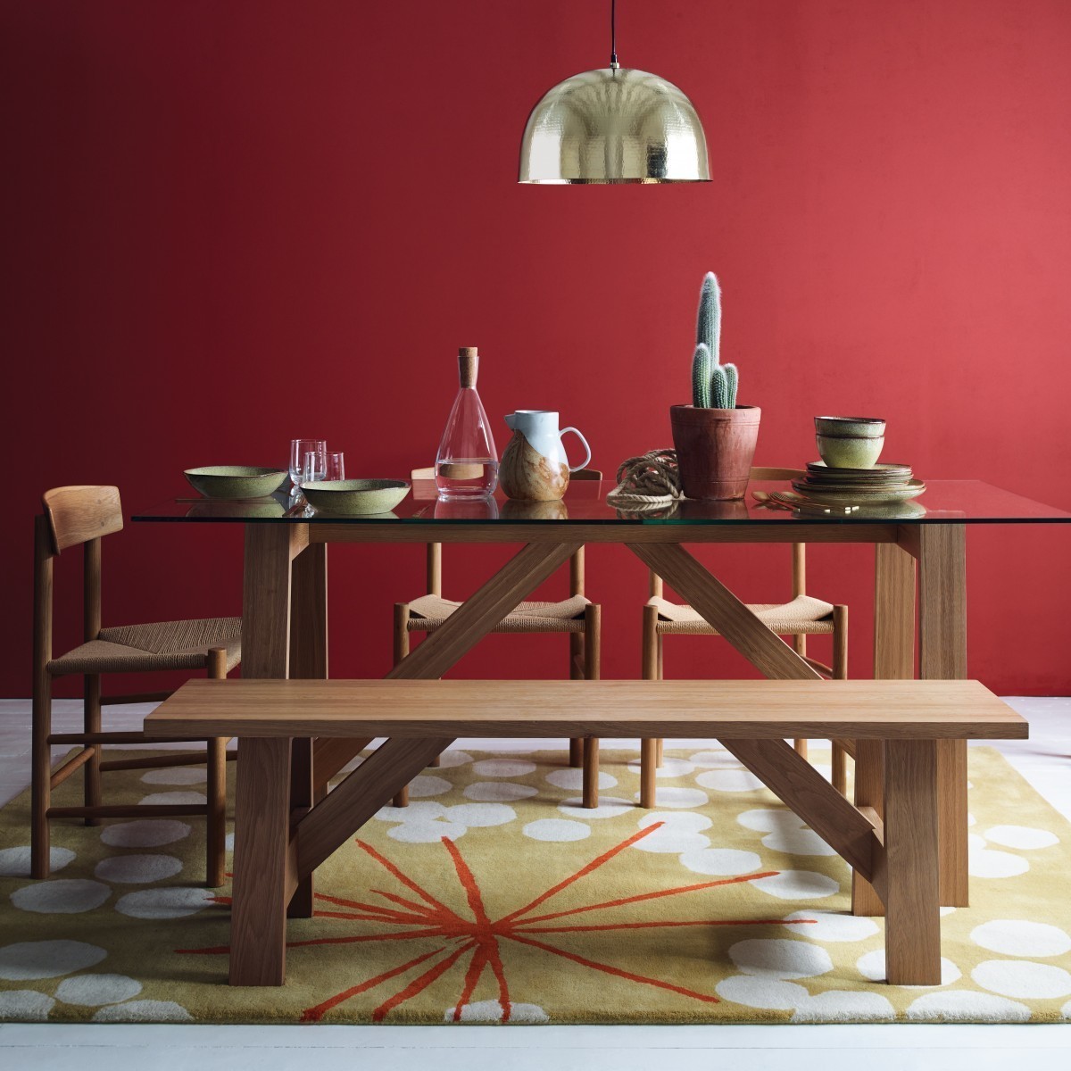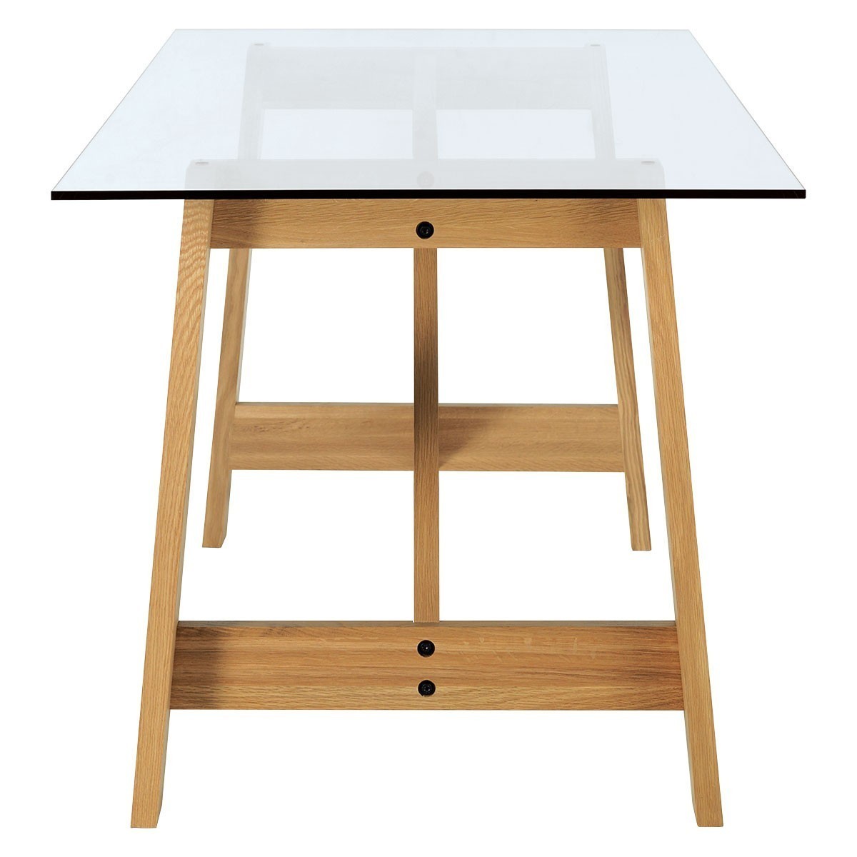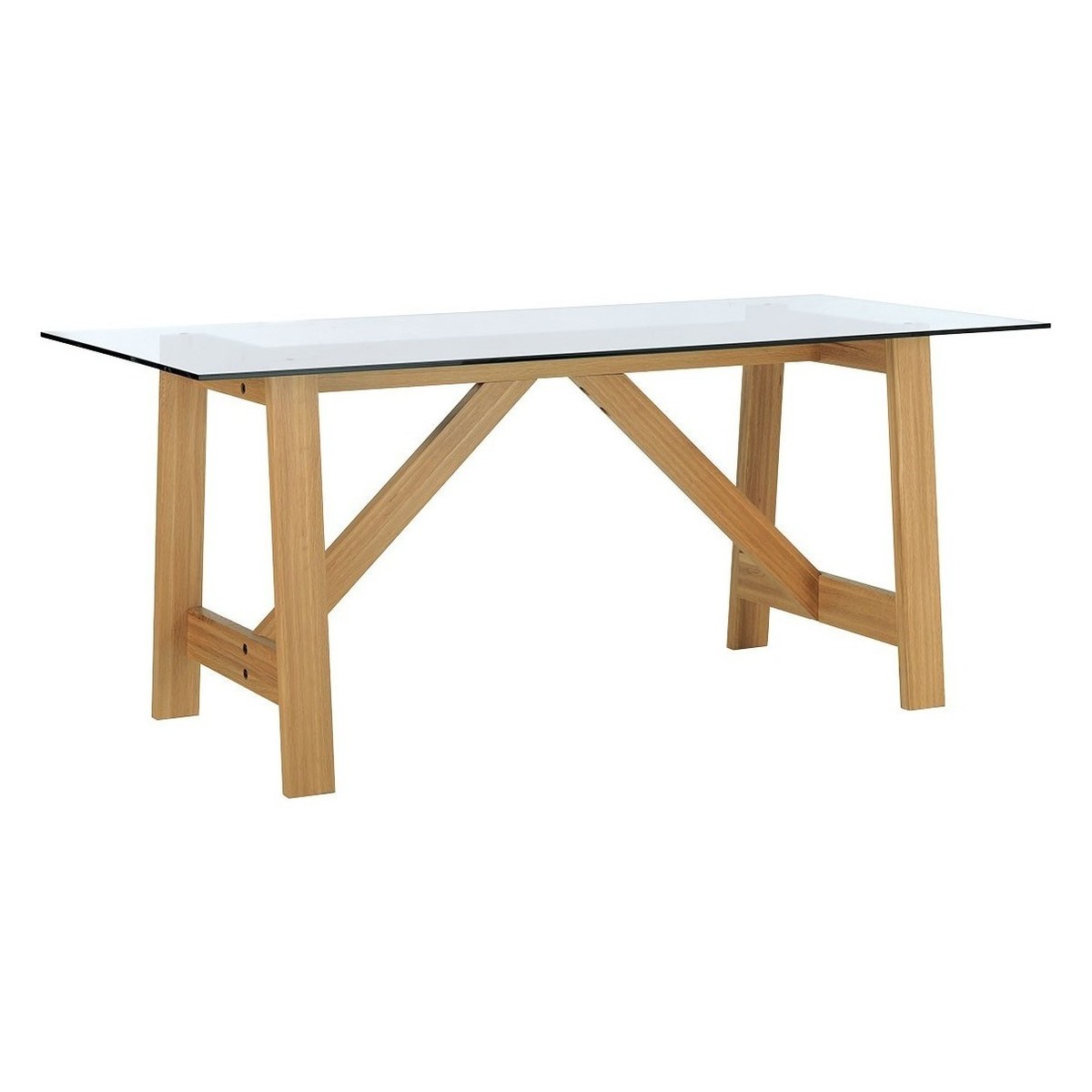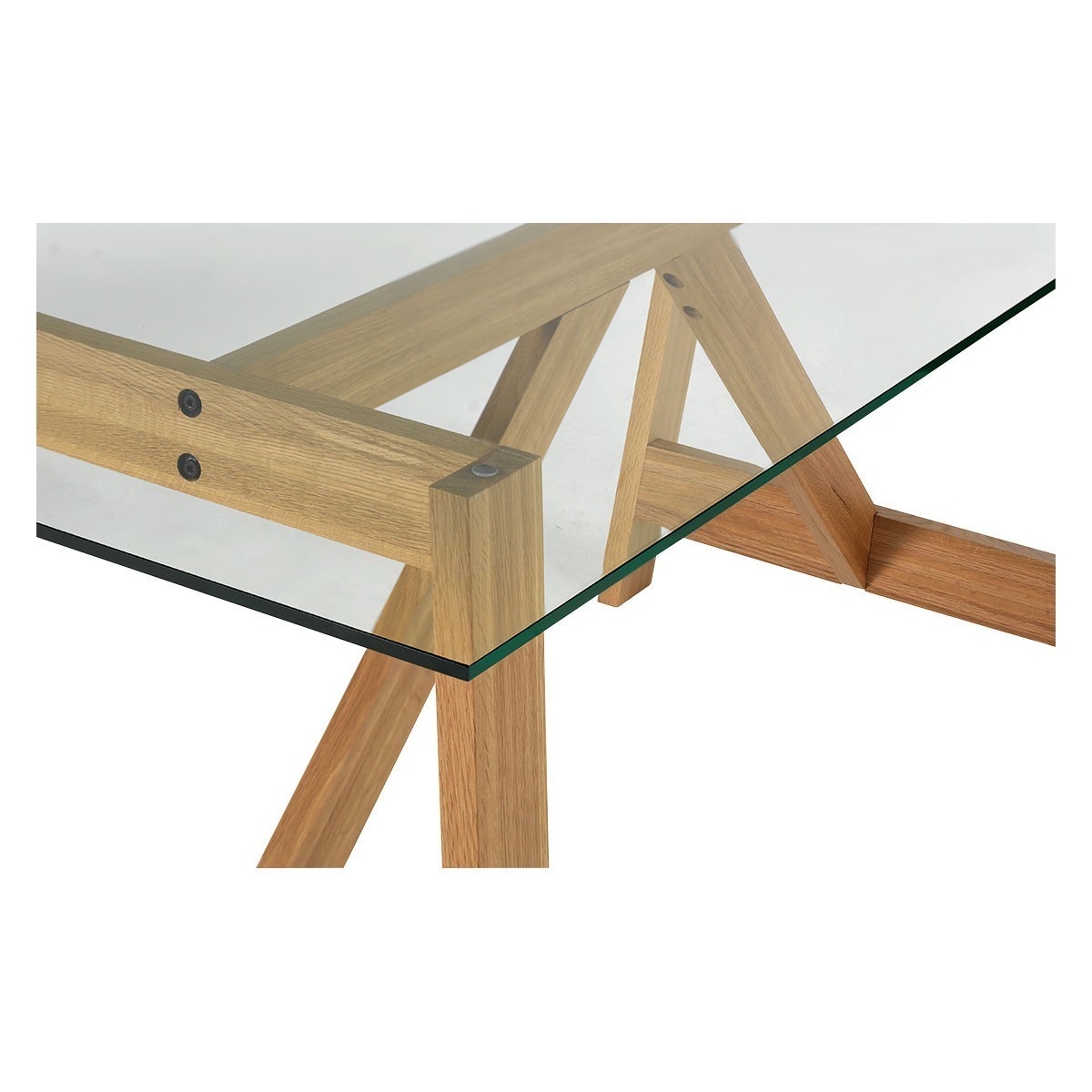 Inspired by classic A-frame designs, the Amos 6 seater oak dining table with glass top combines a strong, structural shape with skilled craftsmanship.;The table's tempered glass top showcases the design's impeccably crafted angles and allows light to flow unimpeded, giving a room an airy, spacious feel.;A contemporary update on a classic design, the Amos dining table is exclusive to Habitat and available in a choice of sizes with a matching bench for flexible, relaxed dining.