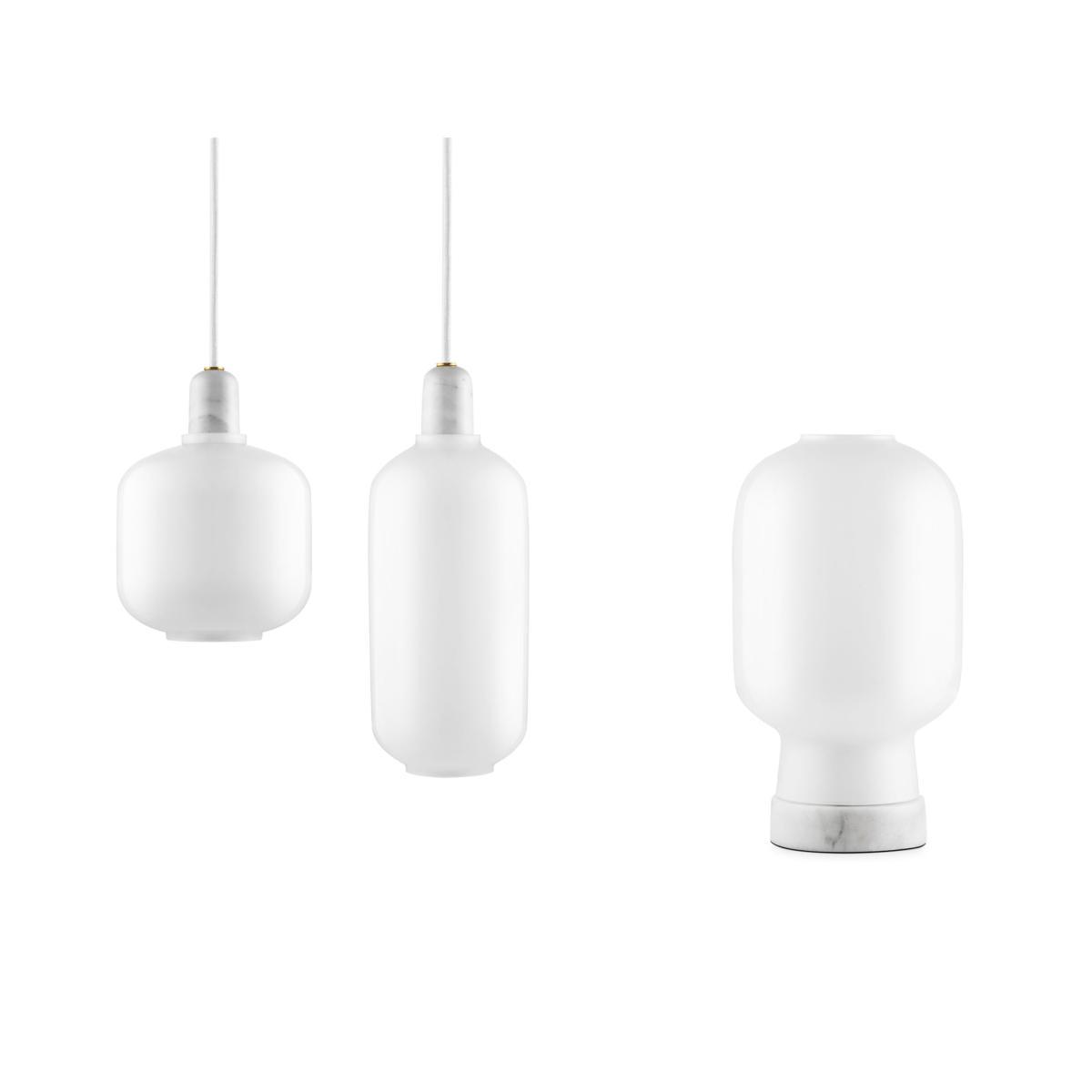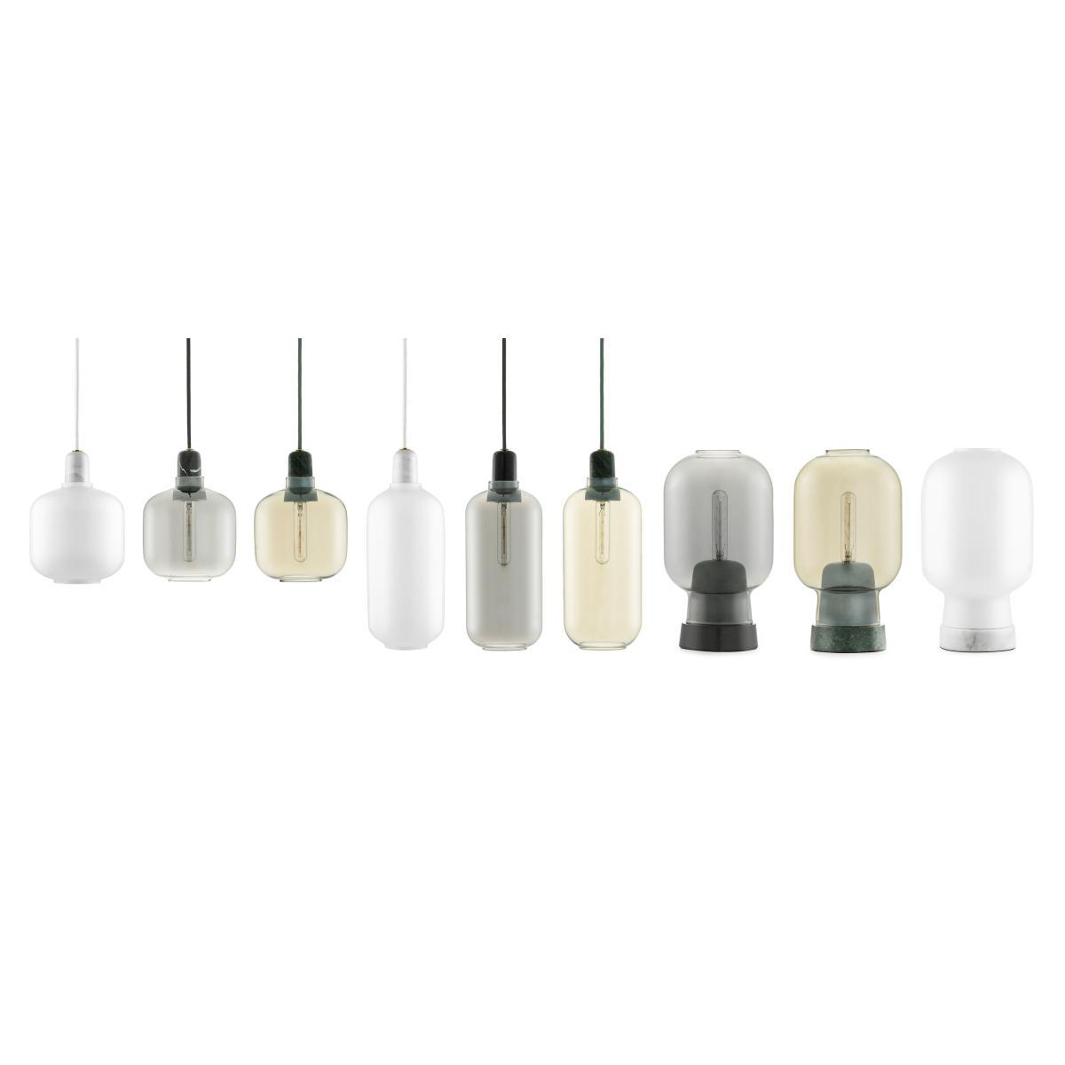 Amp is a range of small lamps inspired by old tube amplifiers from the 1960s. The unique shapes and classic materials of marble and glass add a nostalgic and at the same time, contemporary feel to Amp. The bulb emits a stunning glow though glass lampshades, making a stunning contrast to the heavy marble. The designer has visually highlighted the essential details, such as the way the shade rests on the socket. This draws attention to the fact that the shades can easily be removed for changing bulbs and cleaning. The transparent glass shade lets the light shine from the decorative light bulb in all directions. Amp takes up less space visually, allowing for many different applications in the home. Hang one Amp Lamp in the hallway, in a corner of the living room, or create a cluster of Amp Lamps over your dining room table for modern ballroom effect. The Amp Lamps come with a matching textile cord. The table lamp is supplied with a dimmer switch for adjustable lighting.