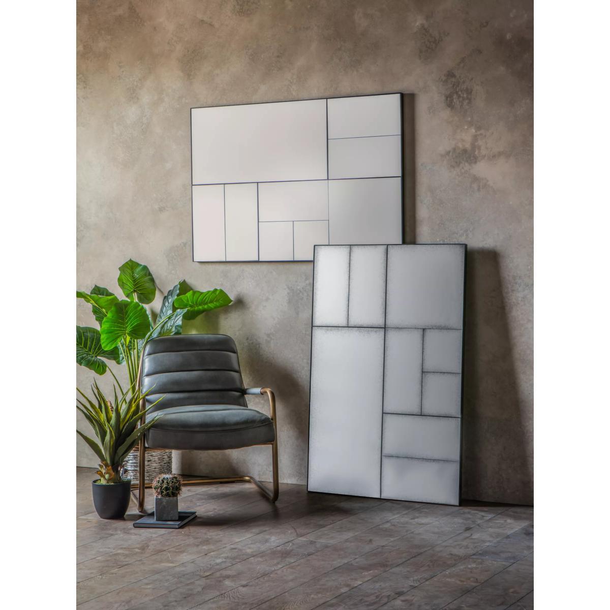 Making a contemporary statement on a wall, individual mirrored pieces are set into a structural metal outer frame. The Ampla mirror suits any room or hallway and is ready to wall mount, horizontally or vertically, by the D-ring fittings on the back.
