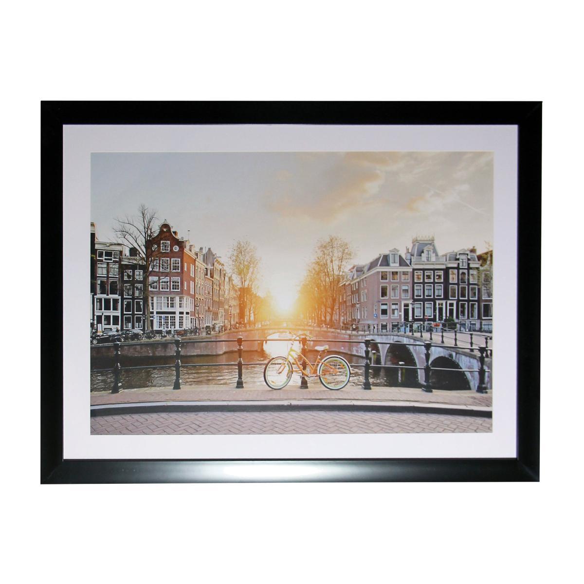 Bring home the beauty of Amsterdam with this photographic representation of its iconic bridge. Featuring canals and colourful facades, this sunset print is perfect for any home. Hang your new wall hanging using our helpful top tips, click. Here. To view.