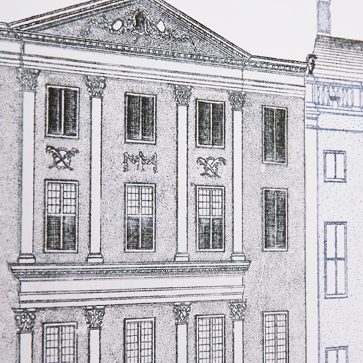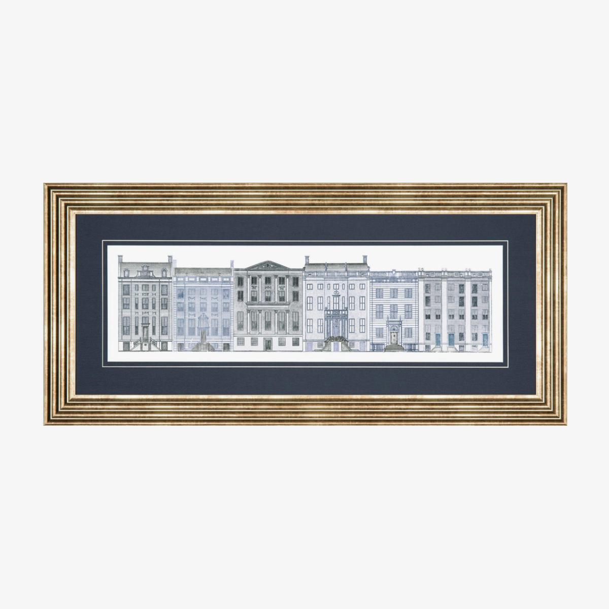 This piece showcases a beautifully detailed sketch of the iconic Amsterdam canal houses, capturing the essence of the city's timeless elegance. Rendered in a serene blue colour palette and encased in a gold frame, it exudes both sophistication and tranquillity.