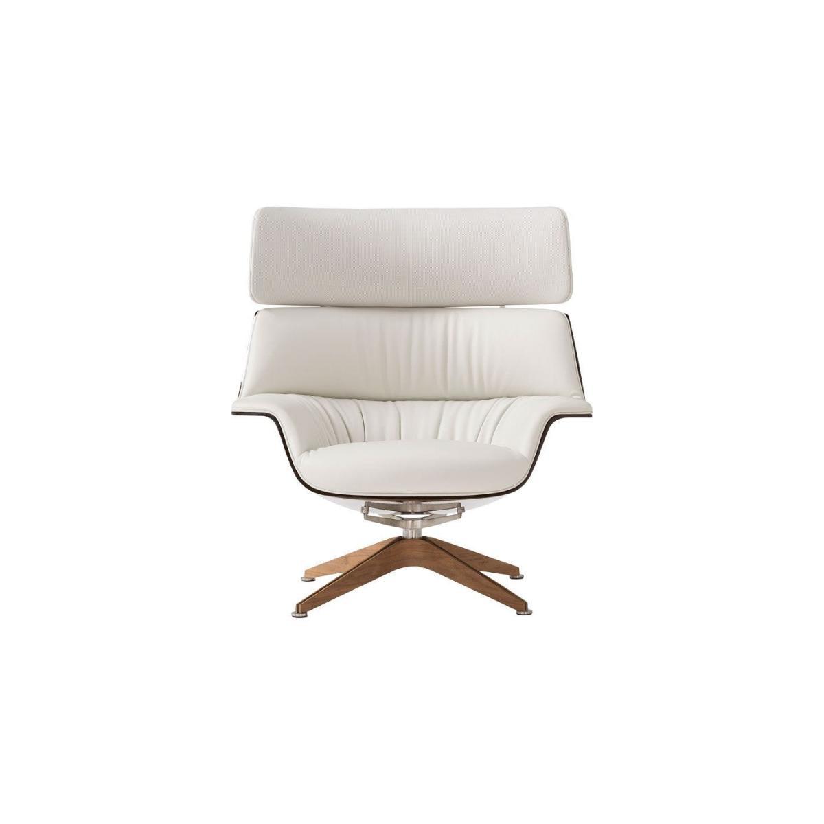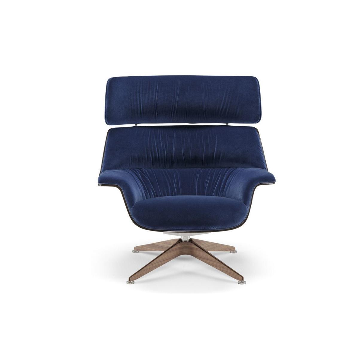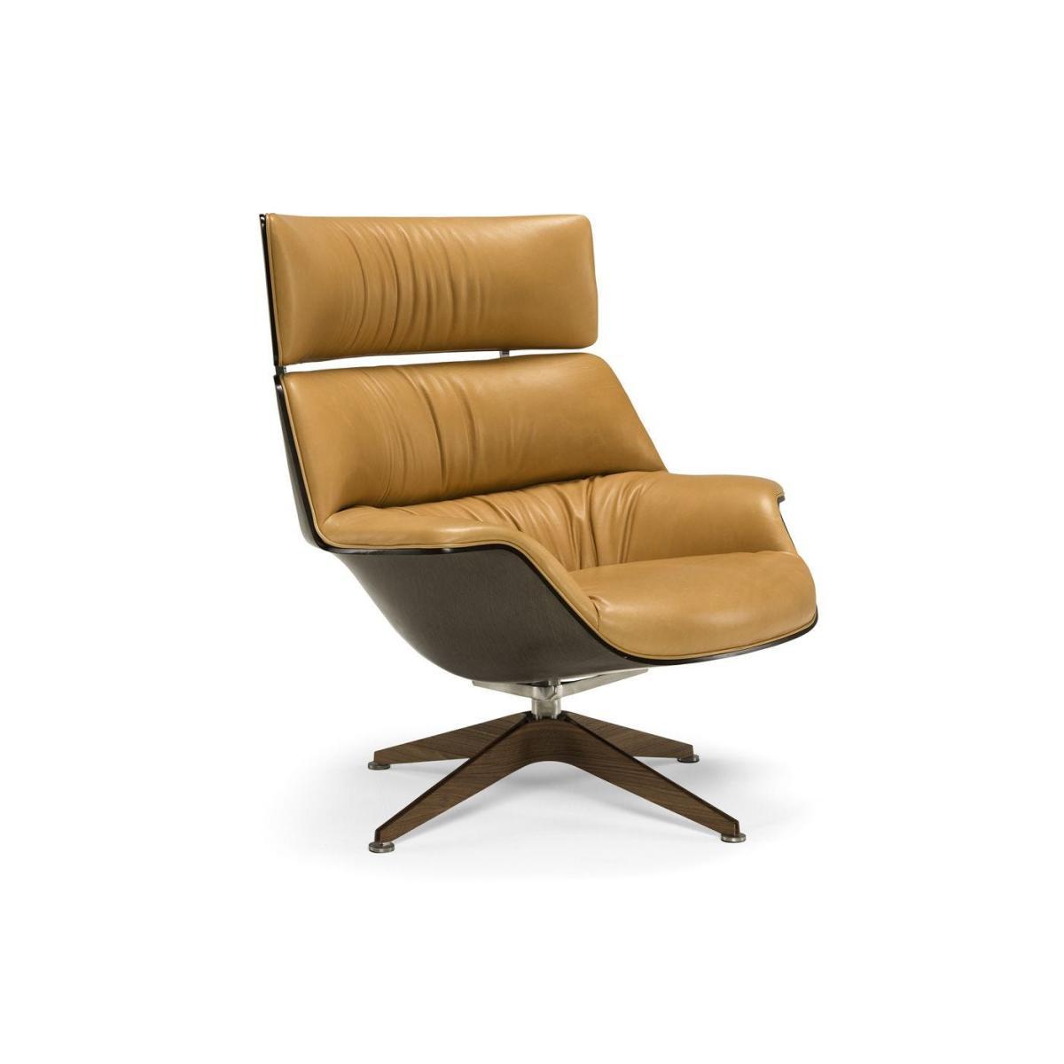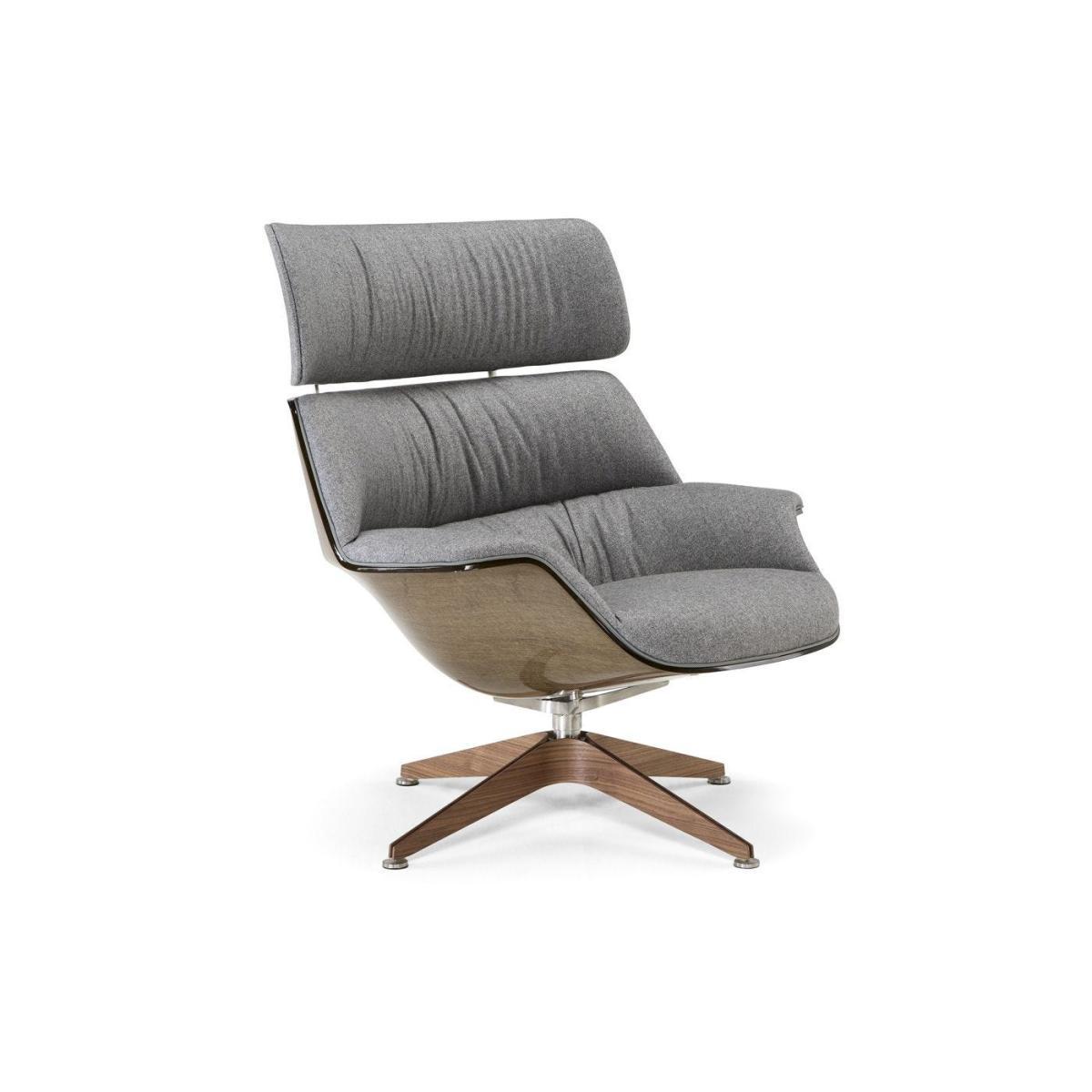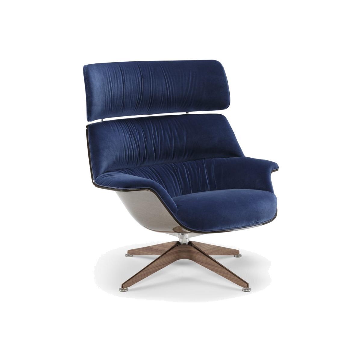 Coach is a comfortable and generous armchair, featuring soft and enveloping lines. The shell in linen composite embraces the seat and wide backrest, upholstered in leather or fabric to give the maximum comfort. The base is available in two options an elegant star-shaped base in stainless steel and walnut.