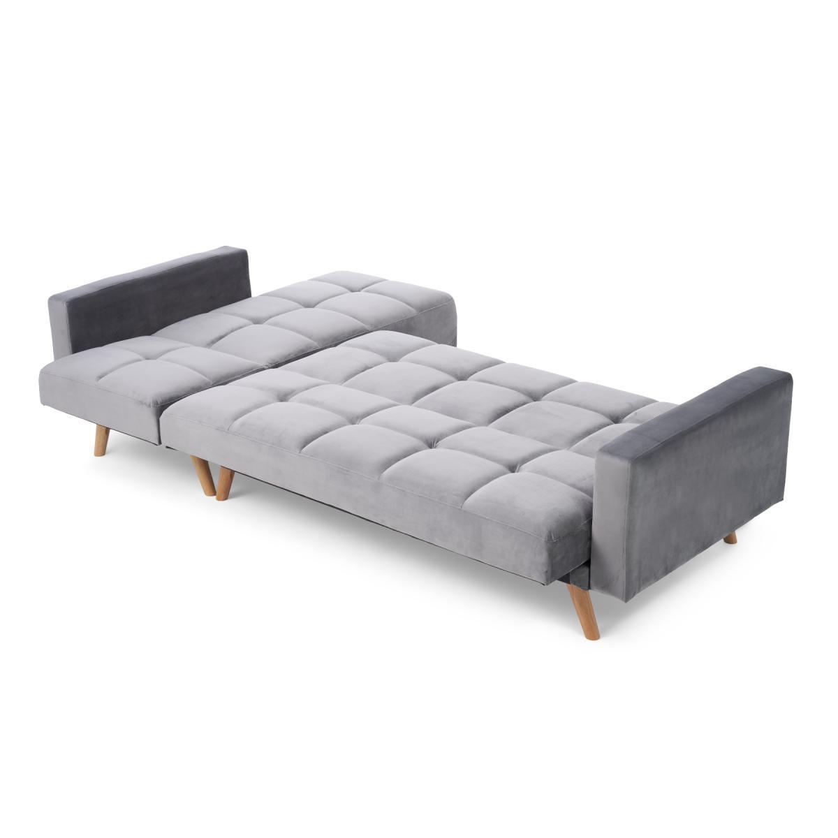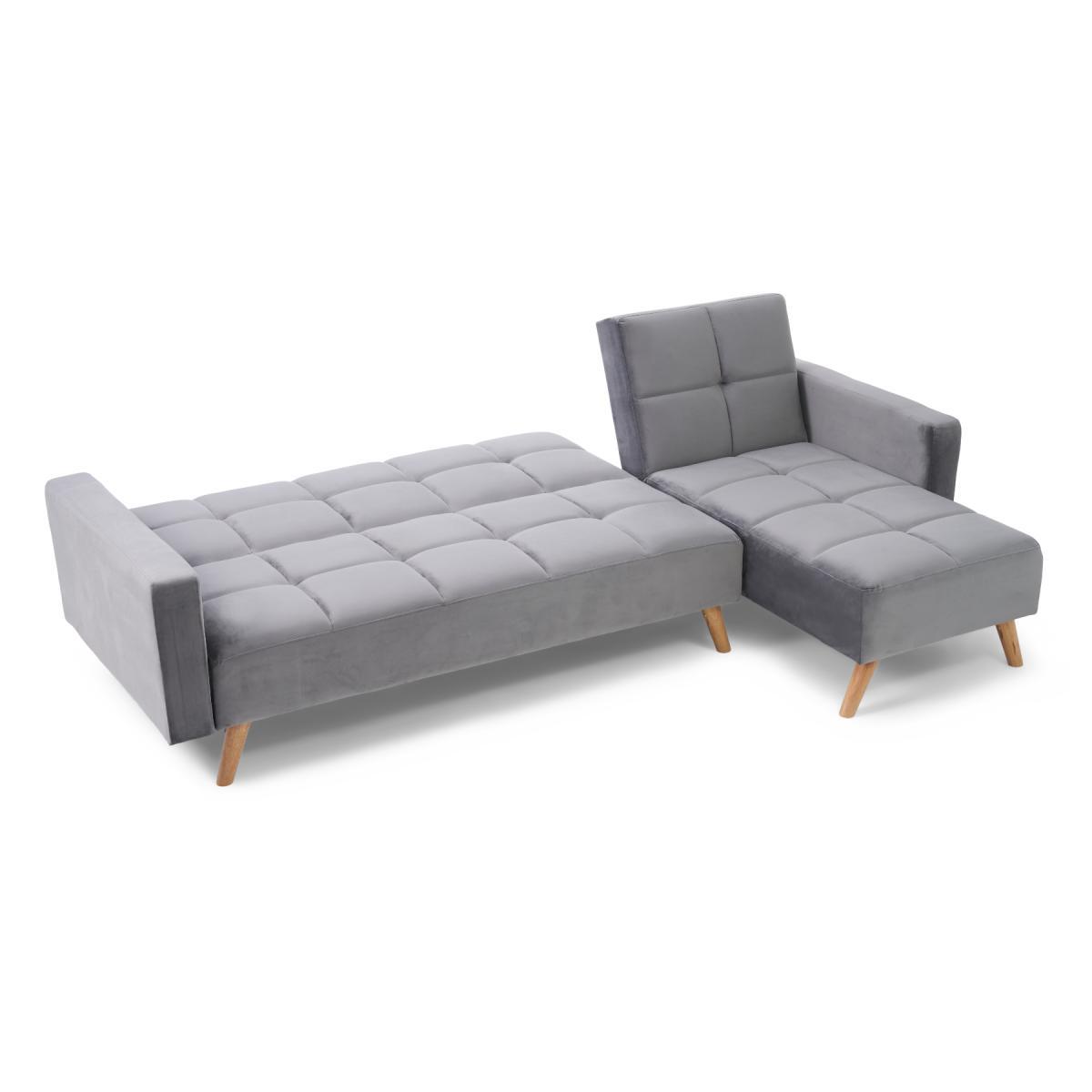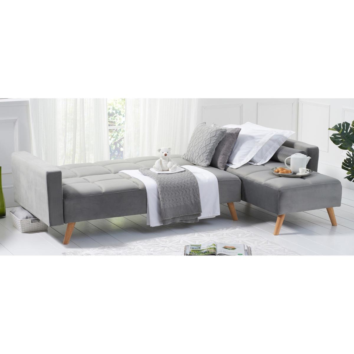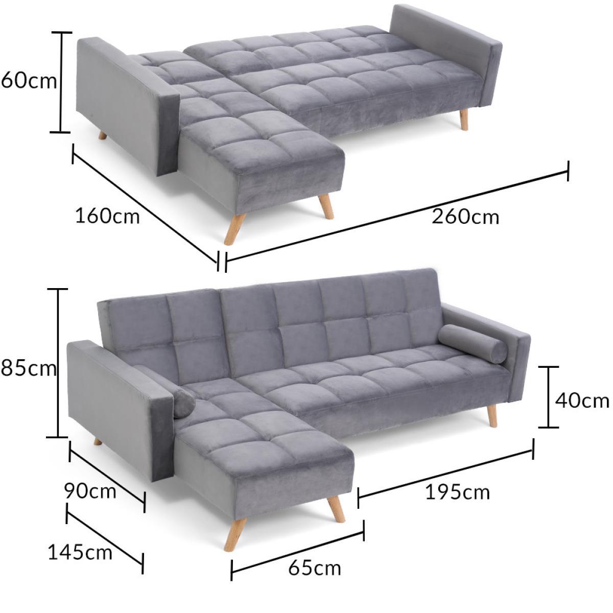 Retro and modern in design, the sleek Ana Chaise Right Hand Sofa Bed features clean lines, stylish tufted stitching to the low backrest and a separate chaise end. Turning into a handy bed via a smooth clicking mechanism to the back seat, it’s supported by contemporary tapered light oak legs. Retro and sleek in silhouette Linen is light and soft to the touch. Works as a family-friendly 3 Seater, as well as a functional bed. Folds down to create a comfy bed element when needed. Also available: Grey Velvet Left Facing Chaise Sofa, Grey Linen Right Facing Chaise Sofa, Grey Velvet Right Facing Chaise Sofa*Comes with 2 free scatter cushions. Additional Measurements:Seat Depth:55cm Seat Width: 230cm. Seat Height:20cm Armrest Width:14cm Backrest Height:50cm Floor to Seat Height:40cm Leg Thickness:5cm Chaise Depth:160cm Chaise Cushion Depth:110cm