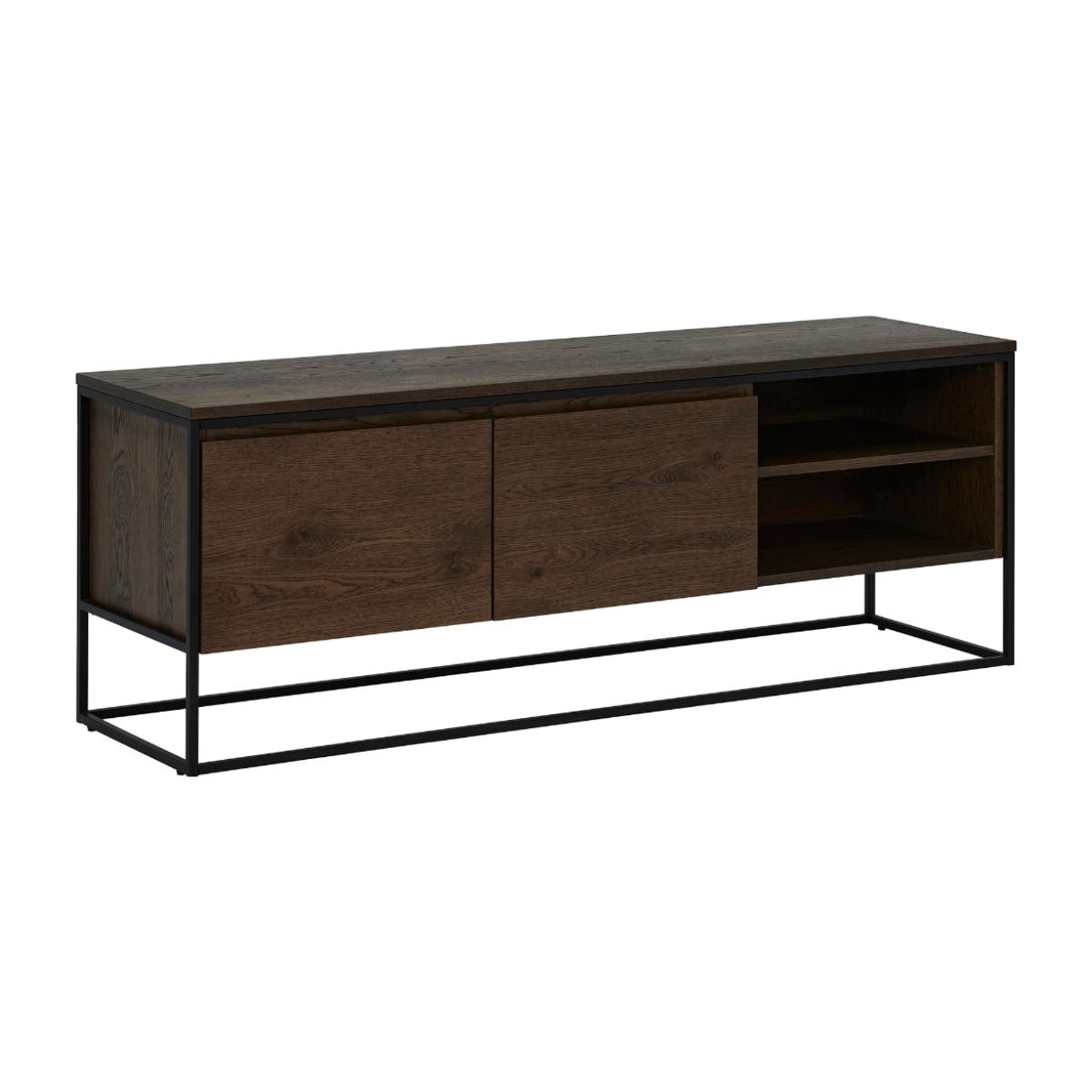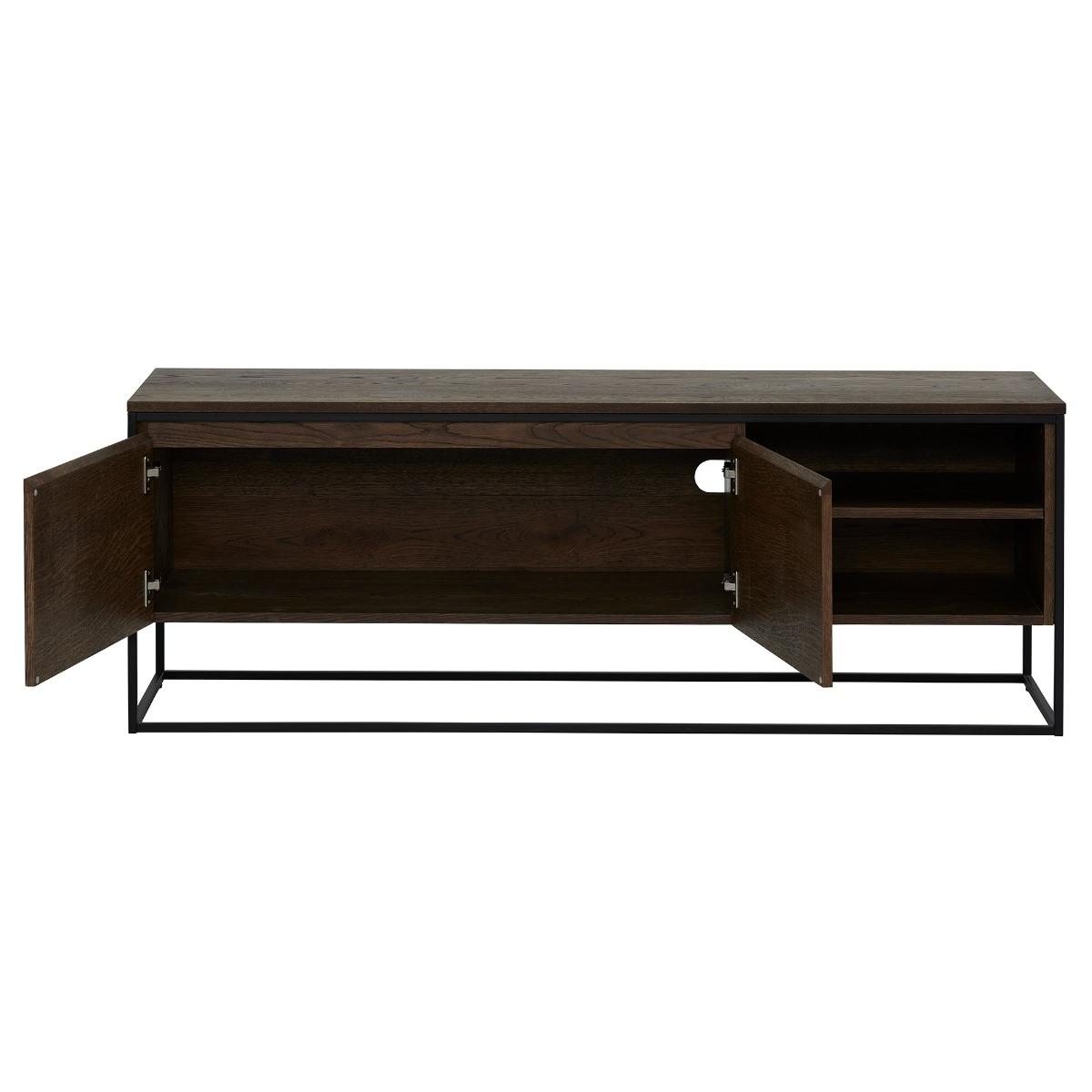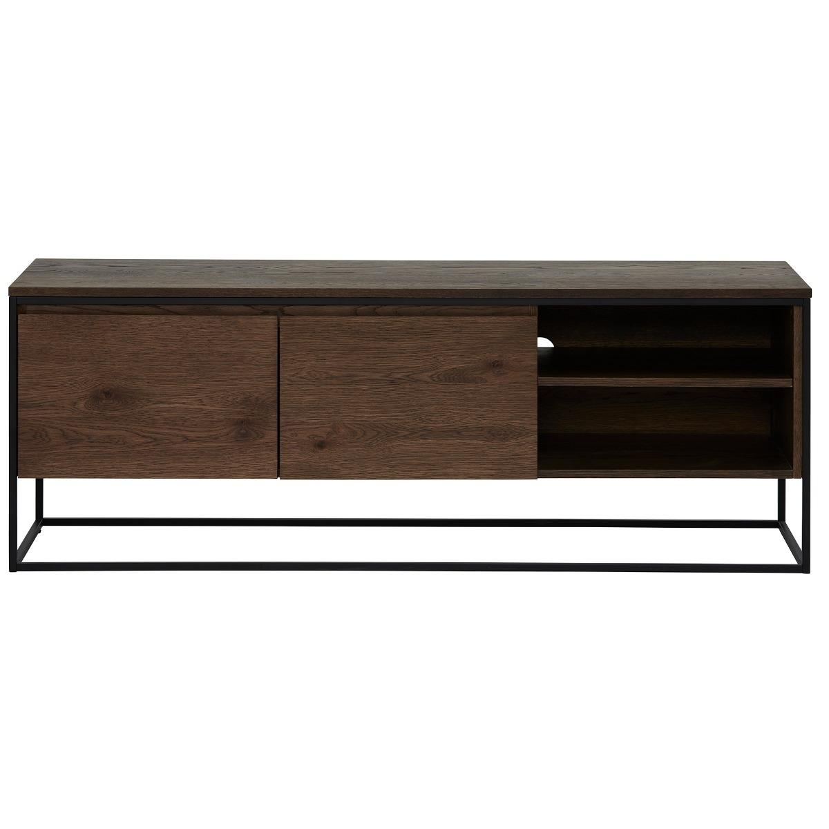 Design. The Anaheim TV Unit is made from oak with a deep brown finish for a contemporary look. With a large cupboard and two shelves, Anaheim is perfect to store your DVD’s, games and TV box, complete with a cable hole in the back to keep wires neat. Complete your living space with other furniture from the Anaheim range for a coherent look.