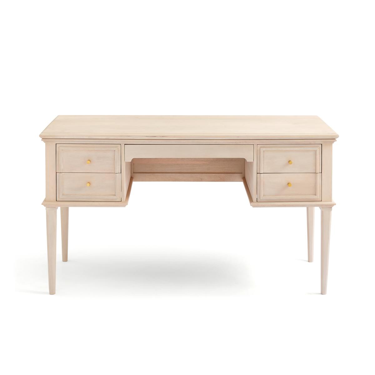 With four spacious drawers, this desk not only offers a charming aesthetic but also practical storage space to keep your essentials organized and at your fingertips. The gracefully curved legs and ornate drawer handles add a touch of sophistication to your home office or bedroom. Finished in a delicate white wash, this desk boasts a classic vintage look that's perfect for multiple room styles.