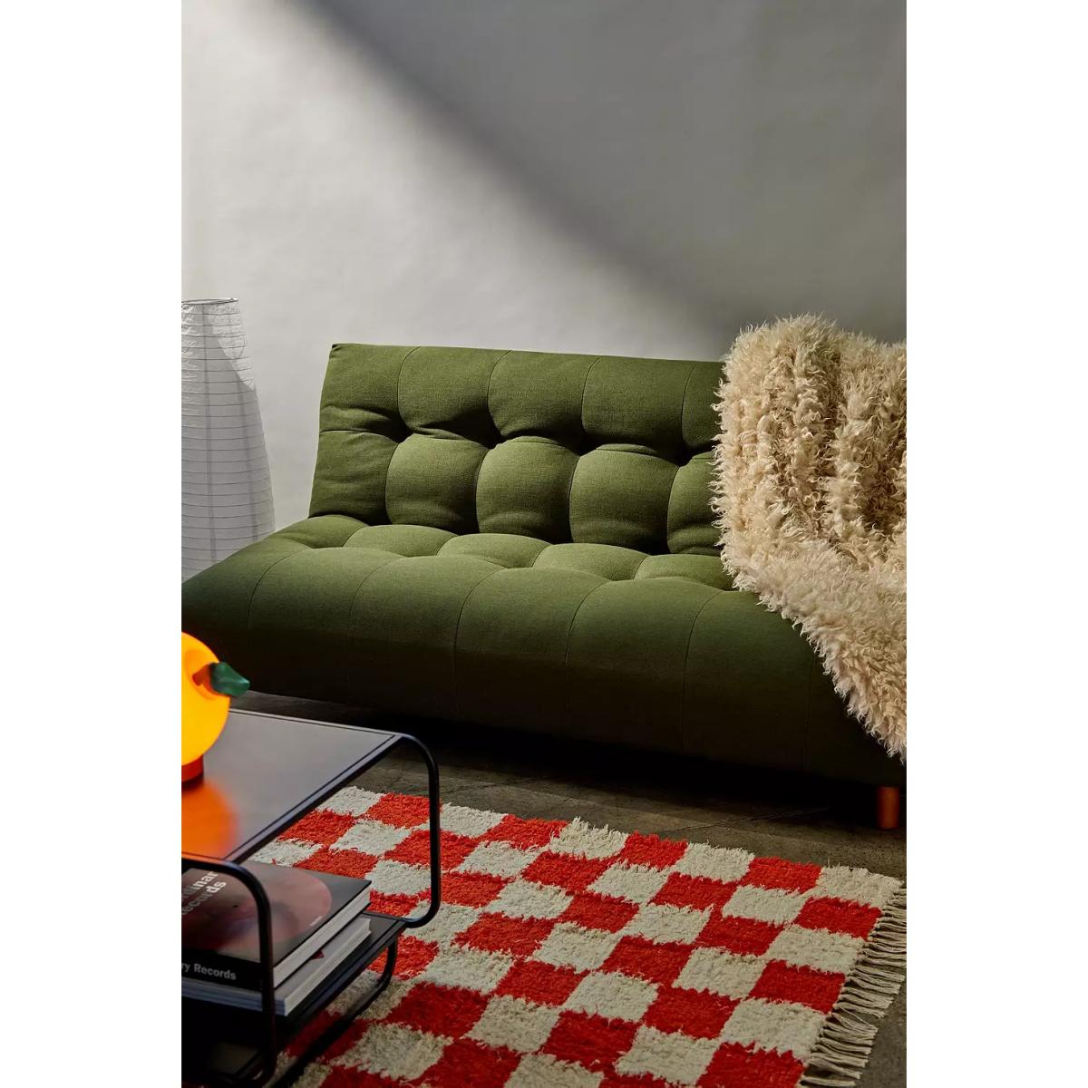 Plush and comfy sofa to fill your space with a statement seating solution. Features a soft textile upholstered fabrication with a pintucked design, arm-less silhouette and soft round ages. Designed to a low height and short wooden legs. Converts to bed in easy motion. **Content + Care** \- Textile, Eucalyptus wood \- Spot clean