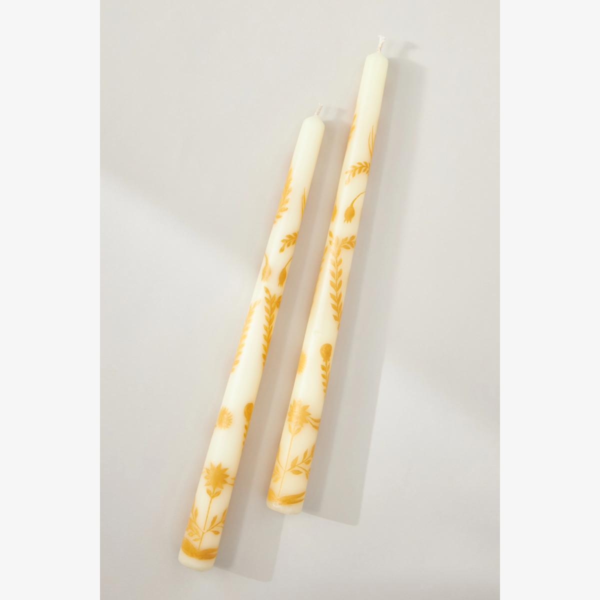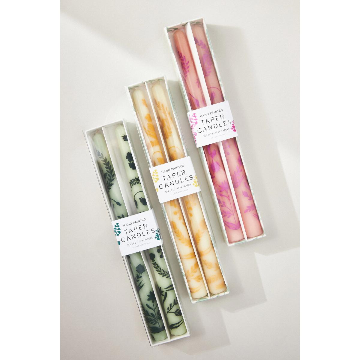 Decorated with hand-painted floral designs, these taper candles add endless charm to your tabletop displays. *For the best burn experience, keep the following in mind:* * The first time you light your candle, allow it to burn until the wax pool melts all the way to the edge; for a larger candle, this may take several hours. Wax has "memory," so if it is extinguished with a partial pool, that will prevent a full, even pool from forming in the future. * Trim your wick each time you light the candle, removing any "bloom" from the previous burn. We recommend lighting a wick that is 1/4-1/2" in length. * Ensure that your candle is placed on a heat-safe surface. * Do not allow wick trimmings, dust, or other materials to accumulate in the wax pool. * To ensure safety and longevity, be sure to check the bottom of your candle for additional instructions, including details on when to discontinue use. * Exclusively for Anthropologie * Set of two * 10-hour burn time each * Sasol wax; fil-tec candle wick * Imported