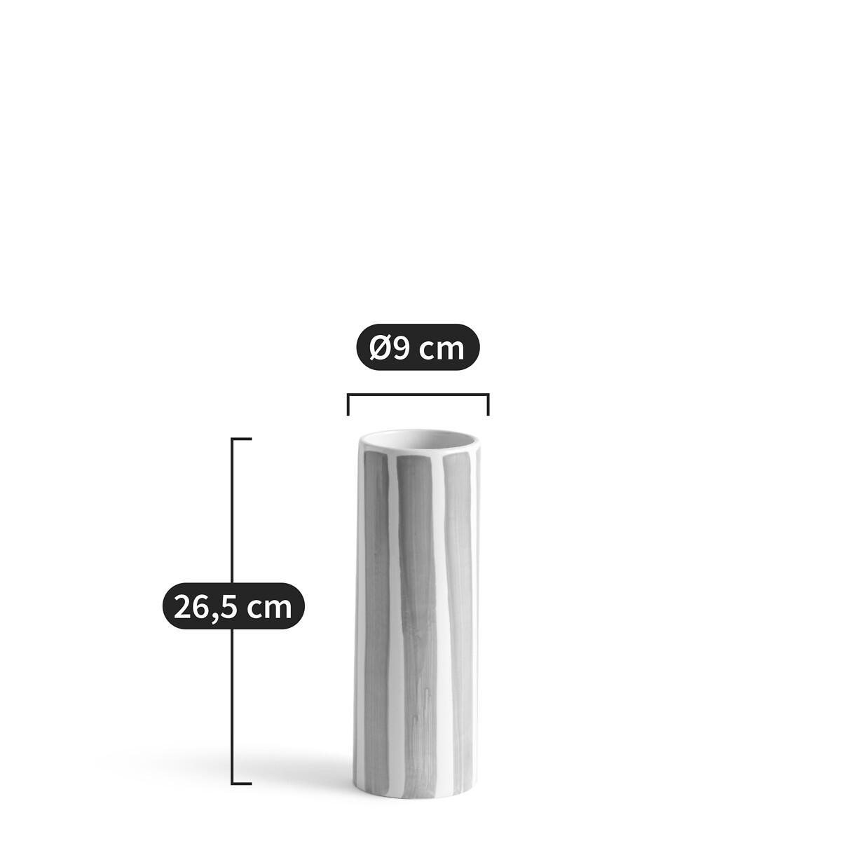 I love this vase for its sleek, modern shape and the subtle striped pattern that adds visual interest without overpowering a space. It works beautifully in contemporary and minimalist interiors, especially when paired with neutral tones or light wood furniture. Practical styling tips include using it as a standalone statement piece on a side table or mantel, or filling it with fresh or dried flowers for colour and texture. Its tall, slender form makes it ideal for narrow spaces or to complement taller accessories, helping to create a balanced, curated look.
