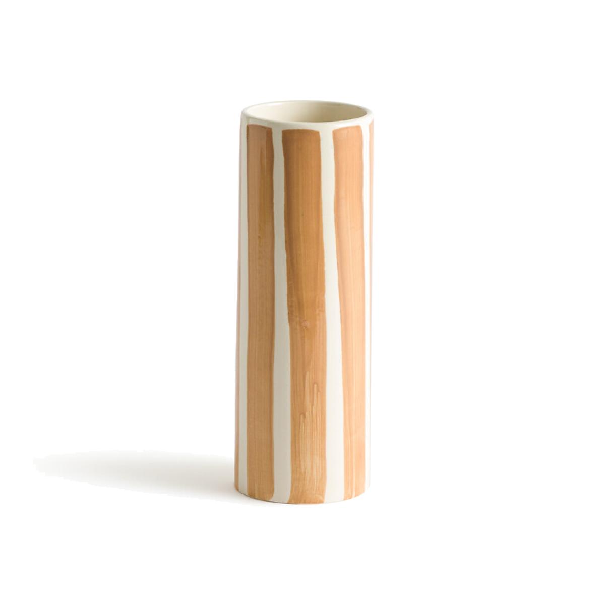 I love this vase for its simple yet striking striped design, which makes it a versatile piece that can enhance a variety of interiors. It works particularly well in minimalist or Scandinavian schemes, where its earthy tones and clean lines can add warmth and texture. Practical styling tips include using it as a standalone statement on a sideboard or mantel, or combining it with fresh or dried flowers for a natural touch. Its generous height also makes it ideal for showcasing tall stems like pampas or eucalyptus, helping to create visual interest without overwhelming the space.
