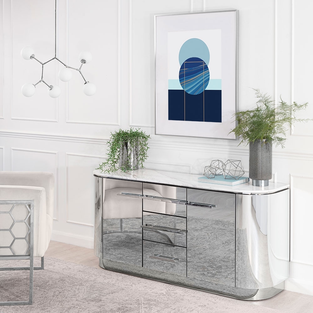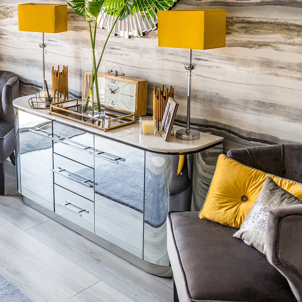 I love the Anastasia Sideboard for its sleek, contemporary look combined with the touch of glamour that the chrome details bring. It's a versatile piece that works well in modern or minimalist interiors, especially those with a monochrome or neutral colour palette. Practical styling tips include using it as a focal point for decorative accessories like vases or sculptures, while keeping surfaces clutter-free to highlight its reflective finish. It also offers functional storage, so it’s perfect for organising dining essentials or everyday bits in living rooms or dining areas. The reflective chrome surface can help bounce light around larger spaces, adding a sense of openness and brightness.