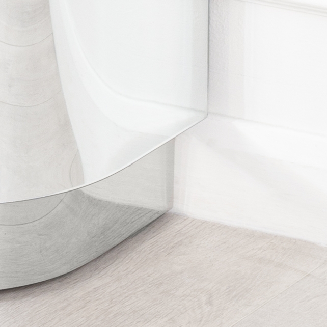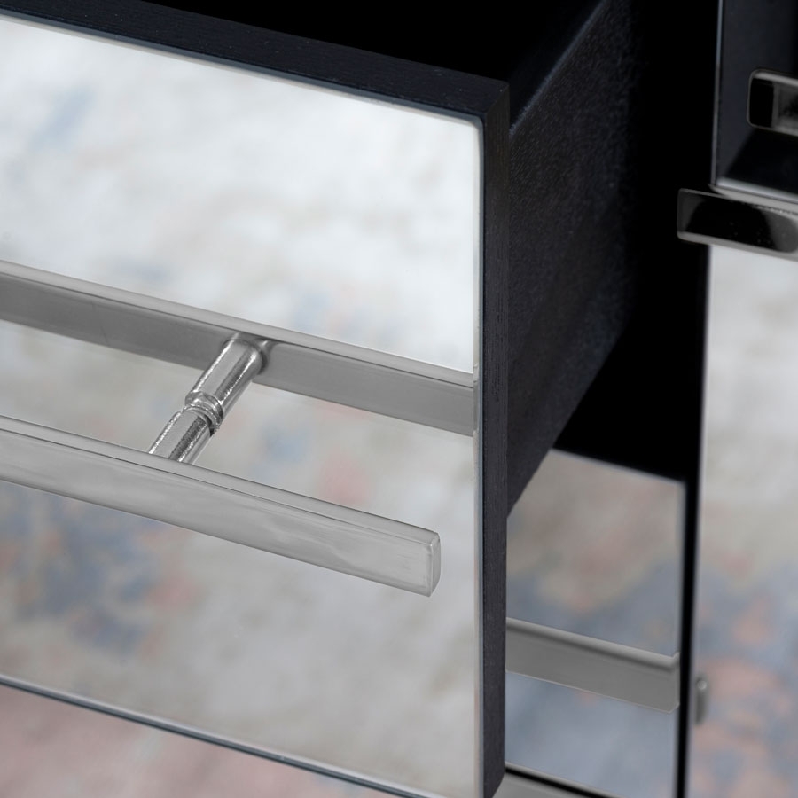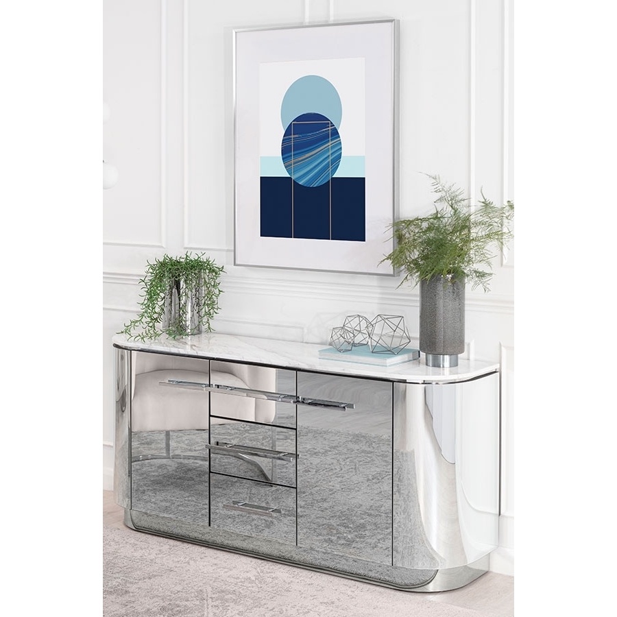 A unique, statement sideboard with distinctive curved shape Exterior finished in in extremely strong toughened mirror Polished marble top Mirror polished stainless steel plinth, handles and shadow gap detail Two spacious cupboard areas with height adjustable glass shelves Three drawers with soft close runners Black stained ash interior