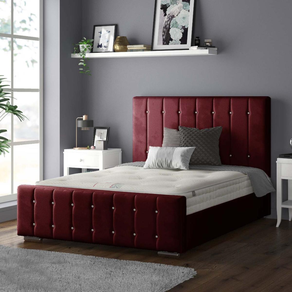 Anastasia Striped Plush Velvet Bed Frame with Diamonds - Burgundy / Superking