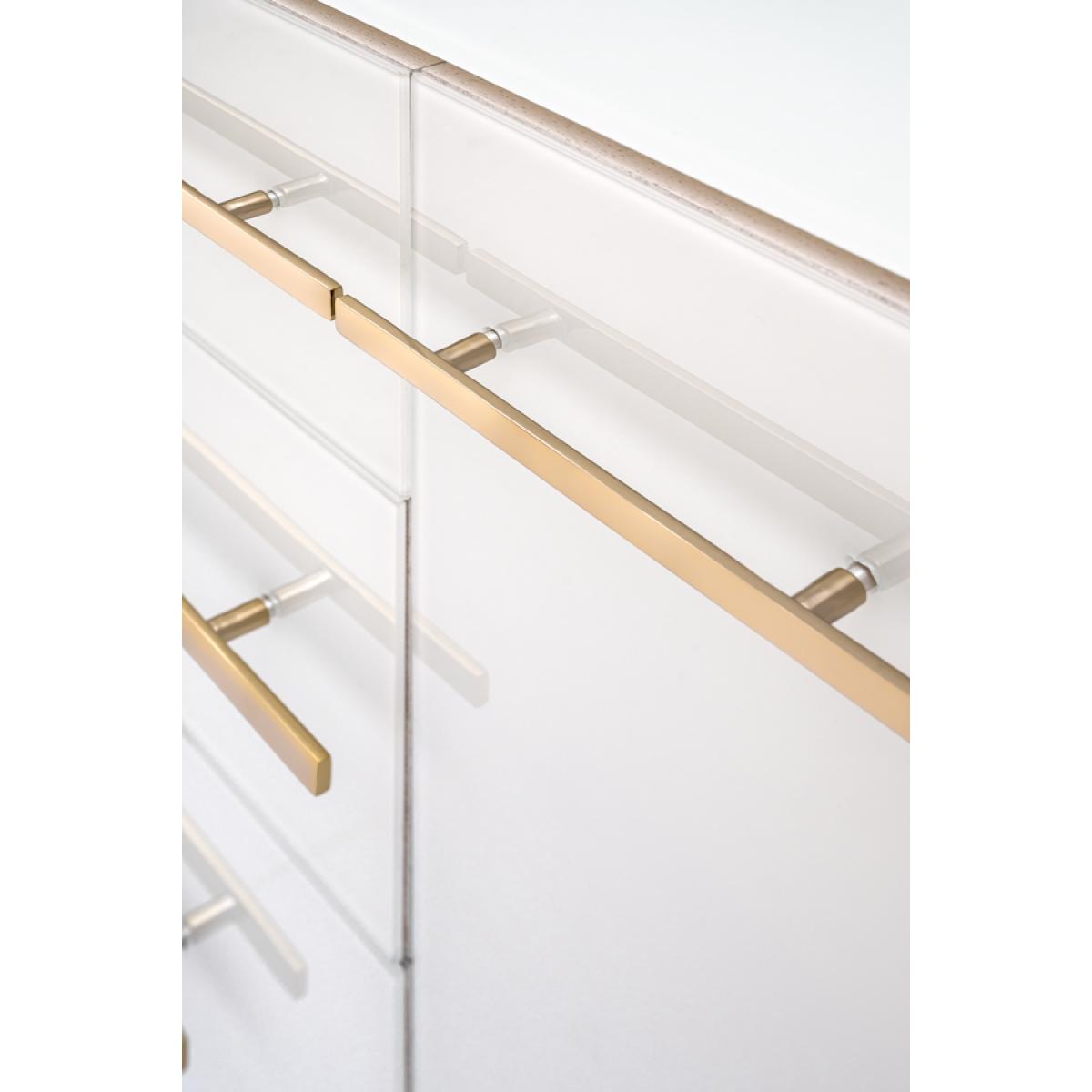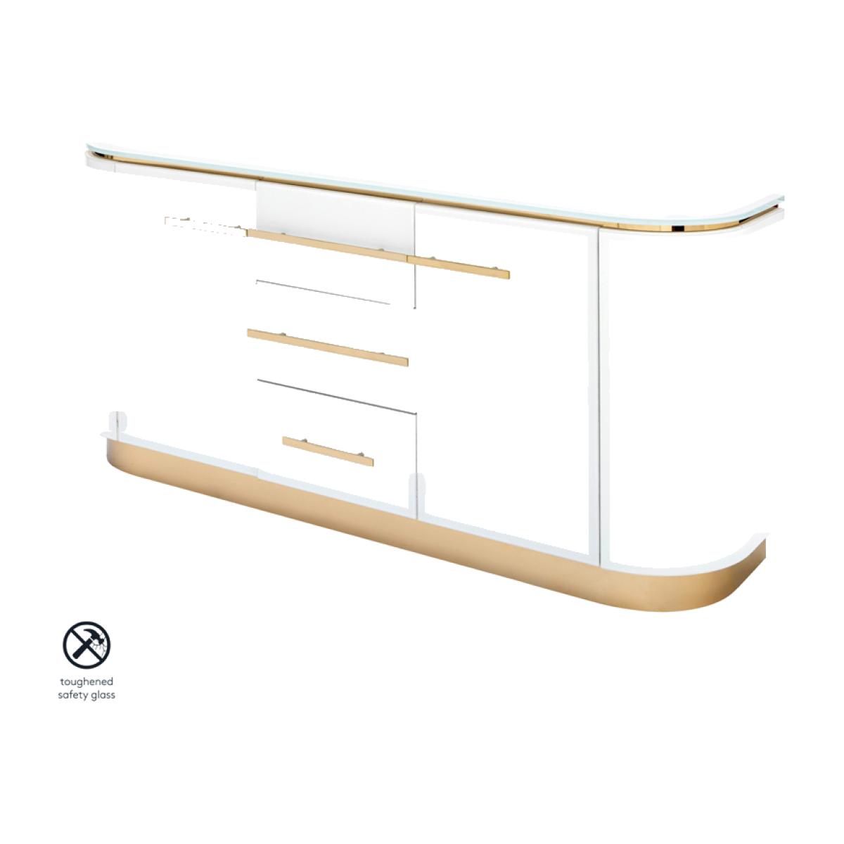 A unique, statement sideboard with distinctive curved shape. Exterior finished in extremely strong toughened white glass. Stainless steel plinth, handles and shadow gap detail with brass finish. Two spacious cupboard areas with height adjustable glass shelves. Three drawers with soft close runners. White painted interior. Simple assembly required.