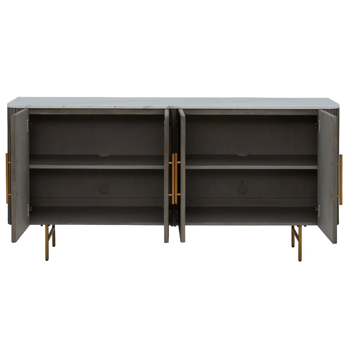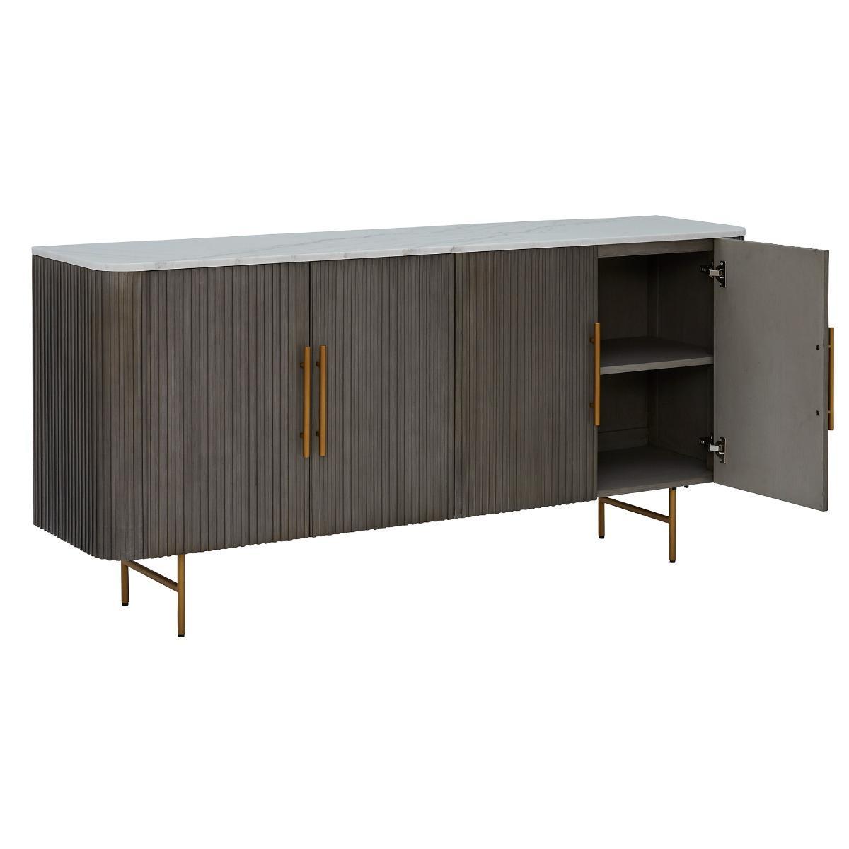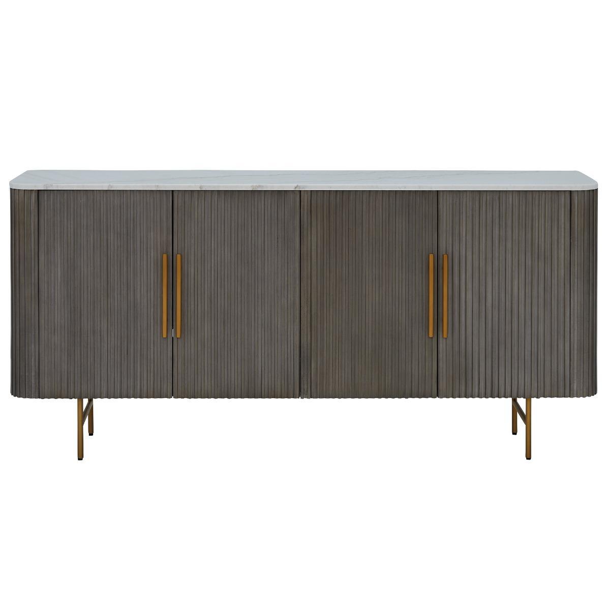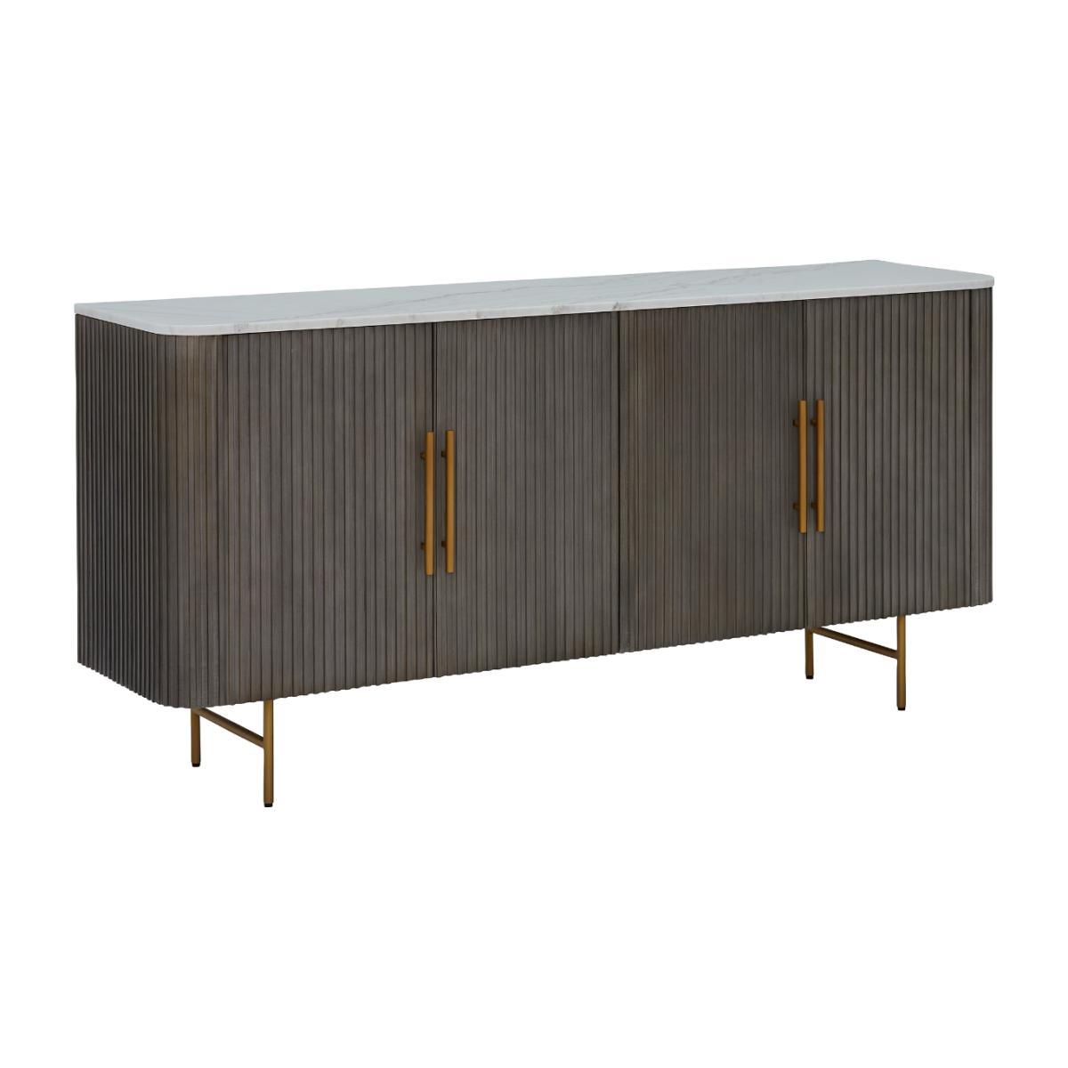 I love how this Anatolia sideboard’s fluted front and slim brass legs add texture and lightness to a room, while the white marble-effect top provides a practical surface for lamps or greenery. The four-door design hides away clutter and offers generous storage, making it as useful as it is stylish. It works particularly well in modern, mid-century or contemporary schemes - pair it with a bold rug and simple artwork above. For styling, balance height by combining a low tray, a medium vase and a taller lamp or sculpture, and use baskets inside the cupboards to keep smaller items neatly organised.