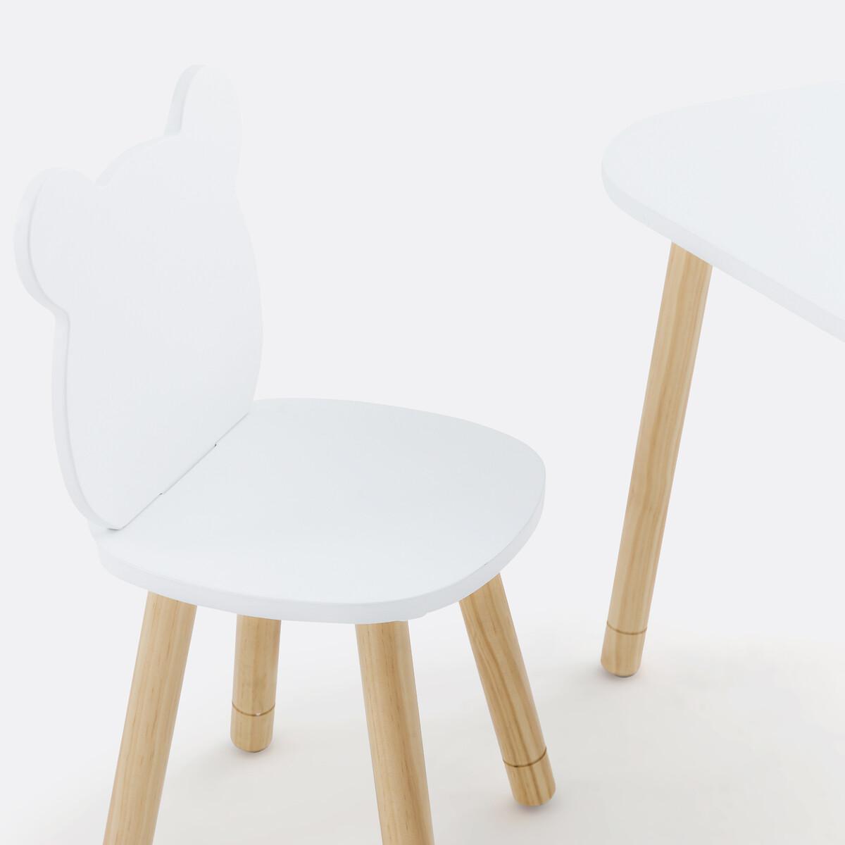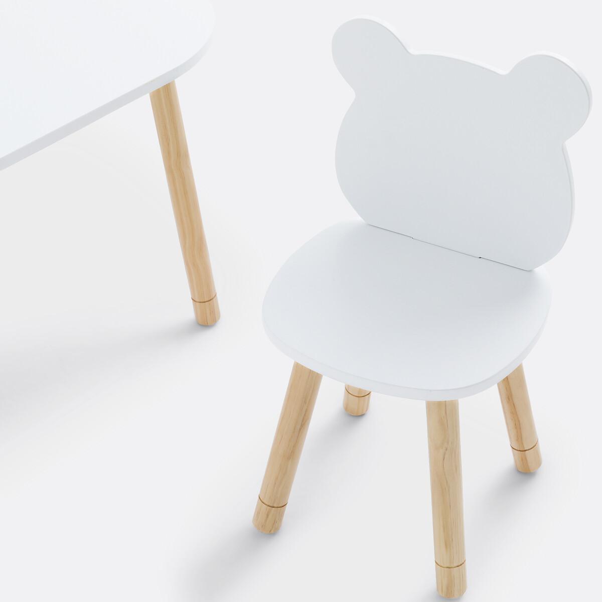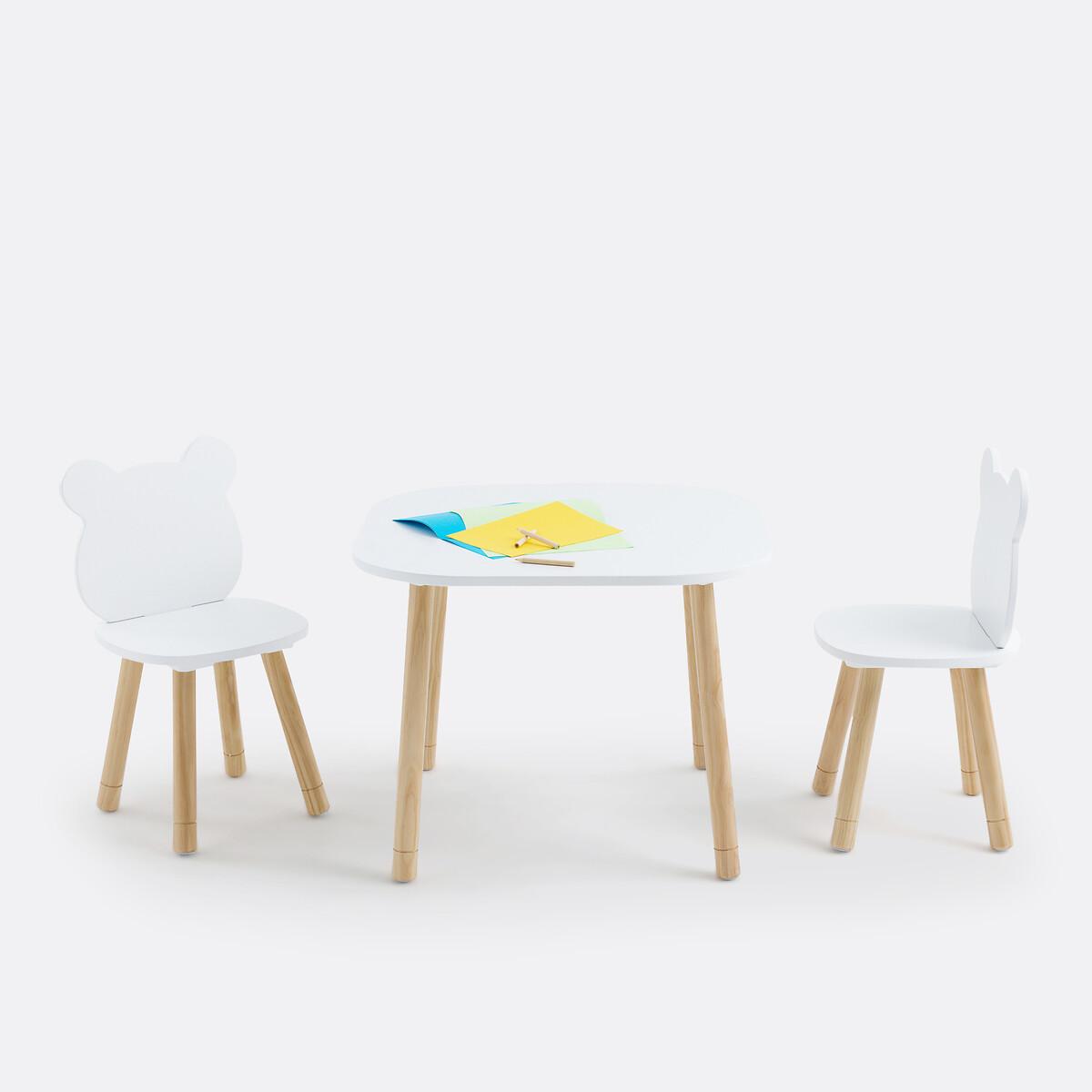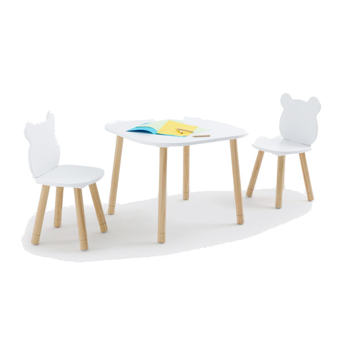 Two chairs with bear-shaped backs and a table suitable for everyday activities... A fun set designed especially for children aged 3 and over. Product Details • Top, seats and backs of chairs in MDF • White water-based paint • Pine legs • Cut-out back in the shape of a teddy bear headDimensions Table • Width: 60cm • Height: 46.3cm • Depth: 60cm • Weight: 4.5kg Chair • Width: 30cm • Height: 56.5cm • Depth: 30cm • Seat: L30 x H30.4 x D30cm • Weight: 4.8kgDelivery:. This product is sold ready to assemble. Note! Please check that all access points are large enough to accommodate your delivery (doors, stairs, lifts). • WOOD FROM SUSTAINABLY MANAGED FORESTS. FSC® certified wood comes from forests that are environmentally, socially and economically well managed.