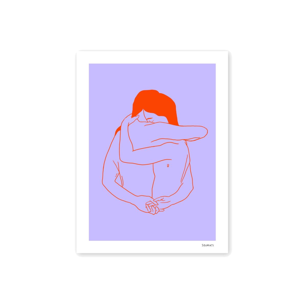 All you need is love habibi. Simple lines, vibrant colours, profound meaning. Feel the comfort and healing power of a loving anchoring hug. Your bodies interlink in the shape of a heart. Time's stopped. Nothing else matters but the now moment. Who would you want to hug right now? Whether it's a lover or friend, this art print is a beautiful meaningful gift. Treat a loved one, treat yourself. PS:The little tattoo on the left reads ‘hob' in Arabic and means love. Hand drawn illustration. High quality giclée print on heavyweight Hahnemühle Archival paper Open edition Giclée fine art print. Printed onto heavyweight and beautifully textured Hahnemühle Museum Etching (350gsm) Sold Unframed. The best care for your print is to frame it and to keep it out of direct sunlight. Printed in London.