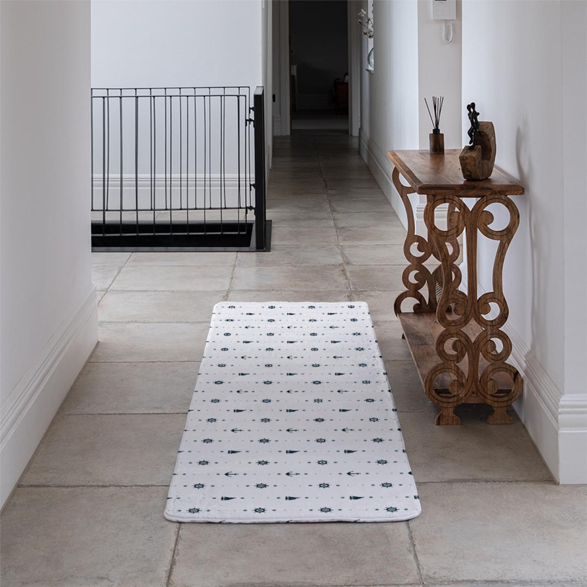 I love this anchor wheel sailboat runner rug for its nautical charm and versatility. It works particularly well in coastal-inspired interiors or casual, seaside-themed spaces, adding a touch of adventure to hallways or kitchen corridors. Its slim profile makes it a great choice for narrow areas, and I recommend layering it over a larger, solid-coloured rug for a more curated look. Practical tips include pairing it with wooden or wicker furniture to enhance the maritime vibe, and keeping it clean with regular vacuuming or spot cleaning to maintain its fresh appearance. This runner is ideal for adding subtle character while also being functional and easy to care for in busy hallways or utilitarian spaces.