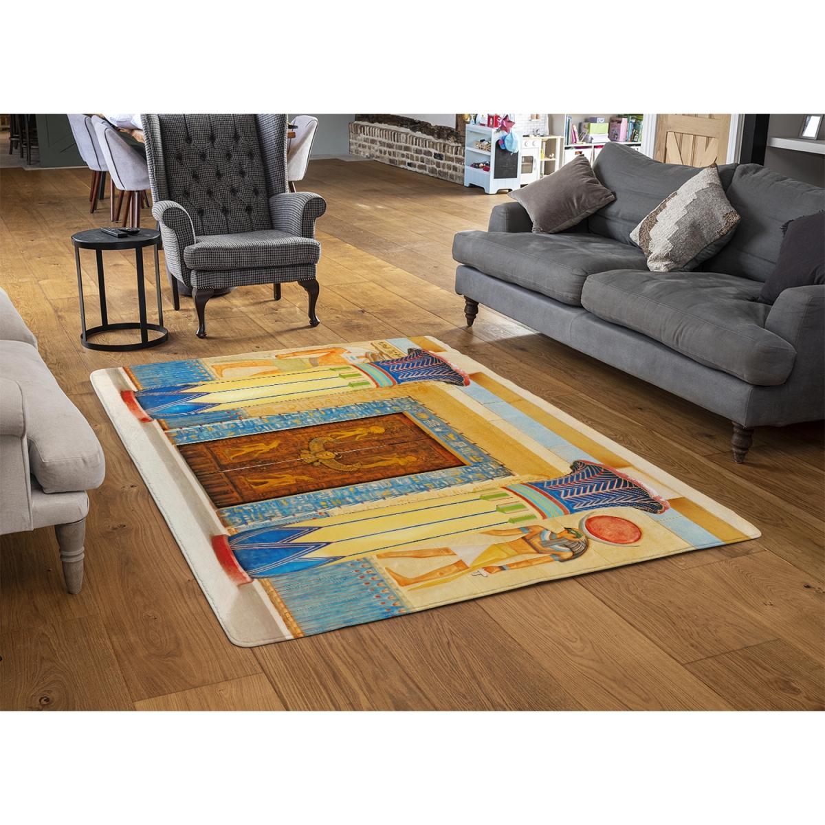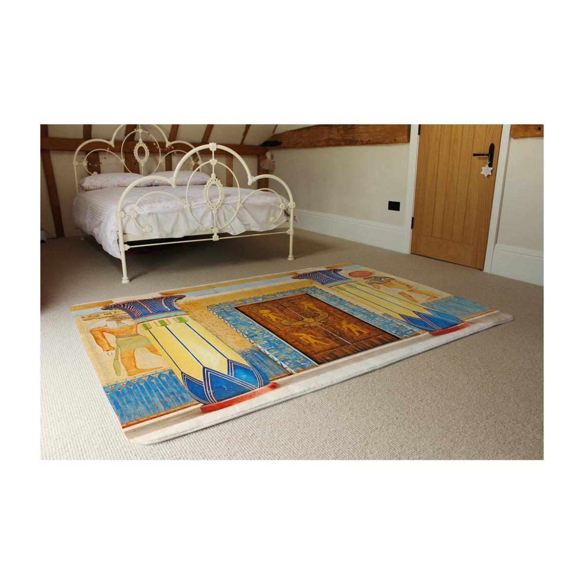 I really like this Egyptian-inspired rug, especially its bold yellow hue, which can add a lively accent to neutral or minimalist interiors. It works well in living rooms or bedrooms where you want to introduce colour without overwhelming the space. For styling tips, consider pairing it with wooden or white furniture to highlight its vibrancy and pattern. Keep accessories simple to let the rug be the focal point, or complement it with other warm-toned textiles for a cohesive look. Its size makes it versatile for various room layouts, providing both visual interest and a tactile foundation underfoot.
