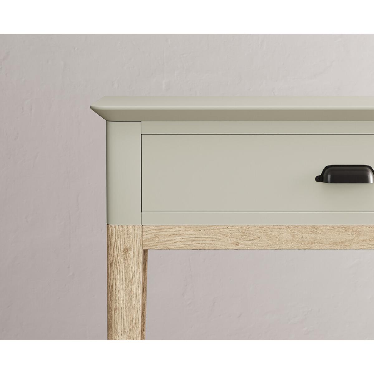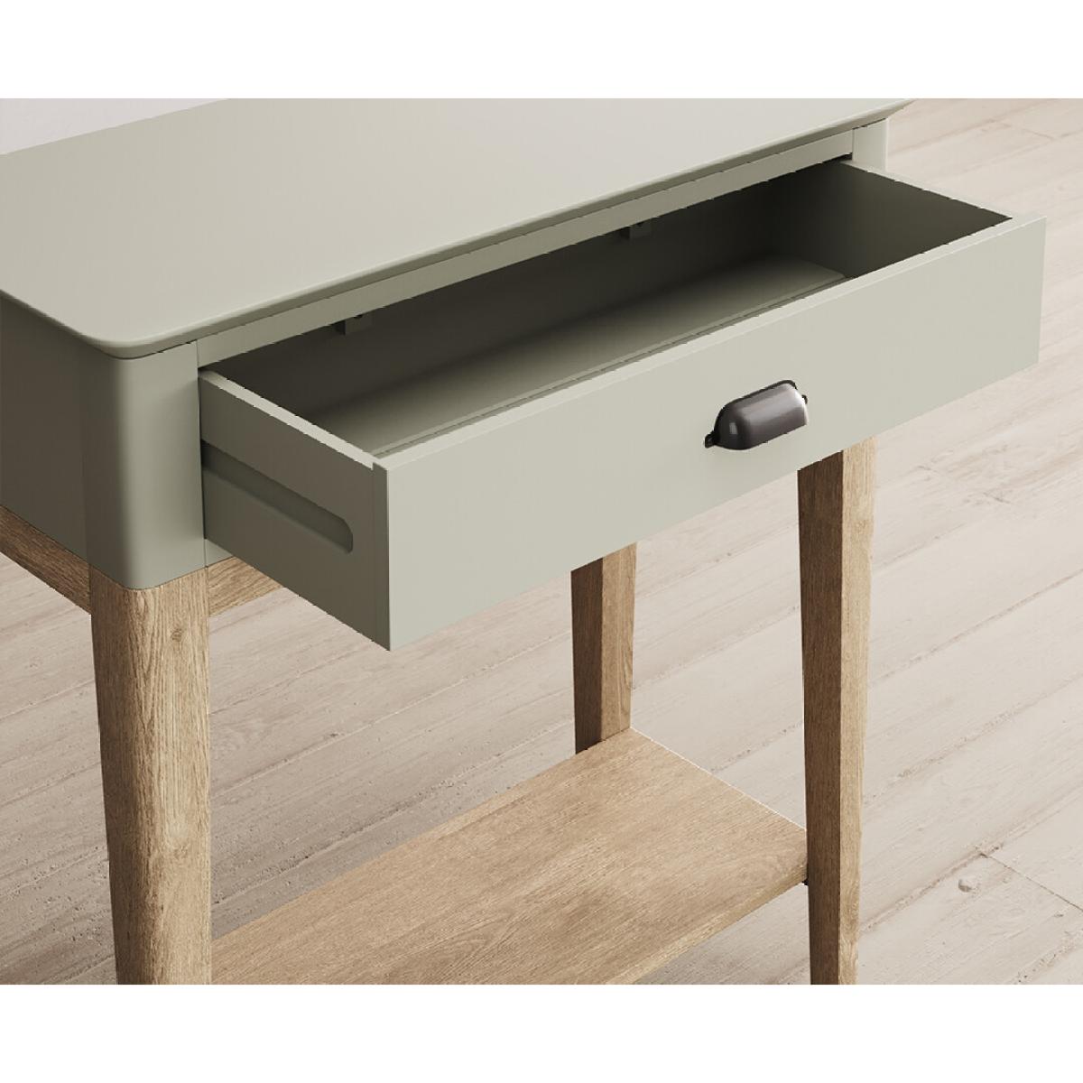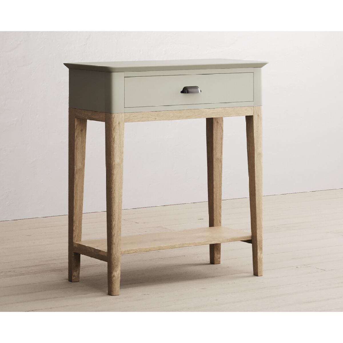 The Ancona Oak and Soft Green Painted Console Table is a green painted solid hardwood and solid oak console table with drawers.