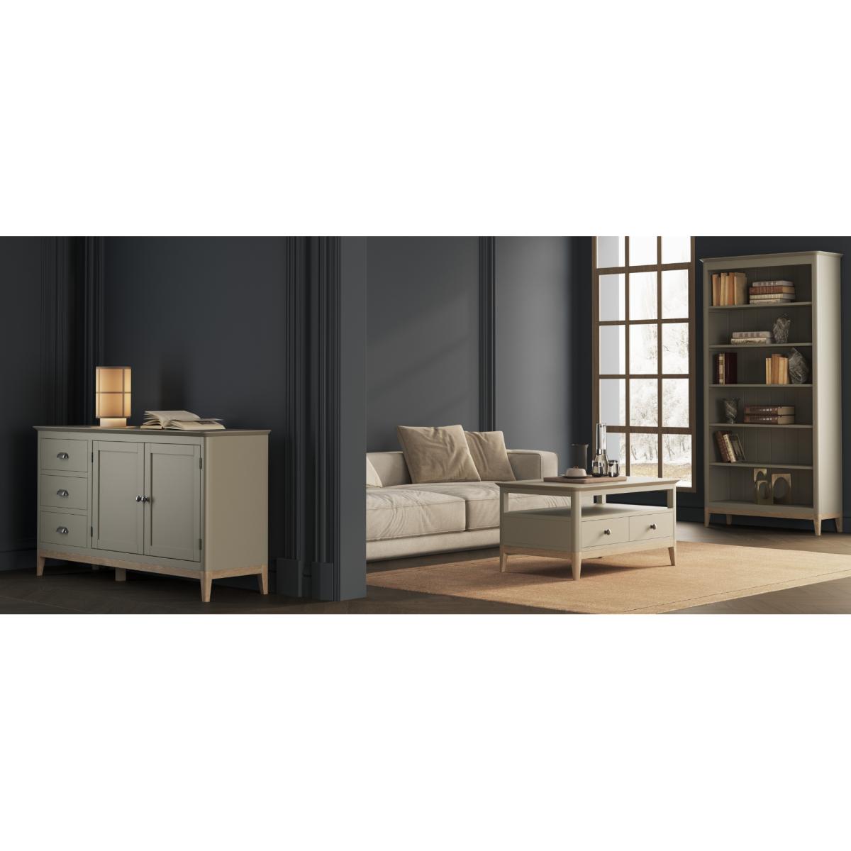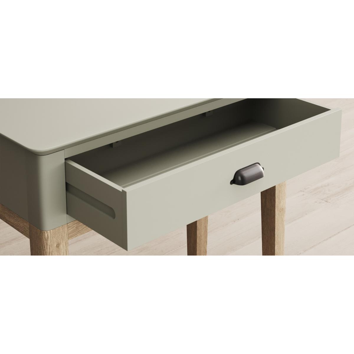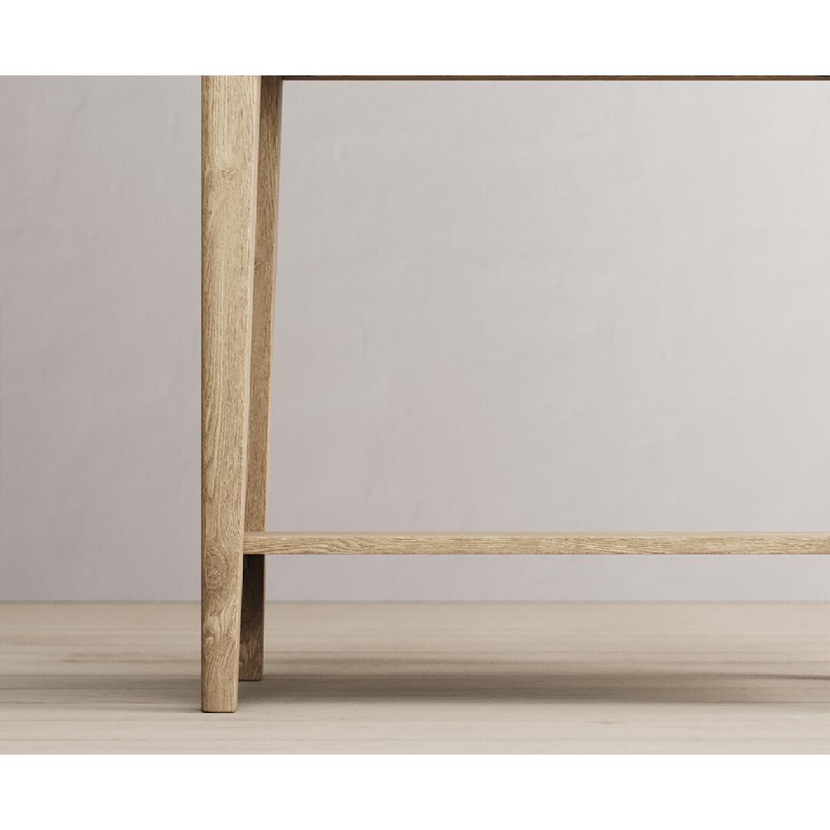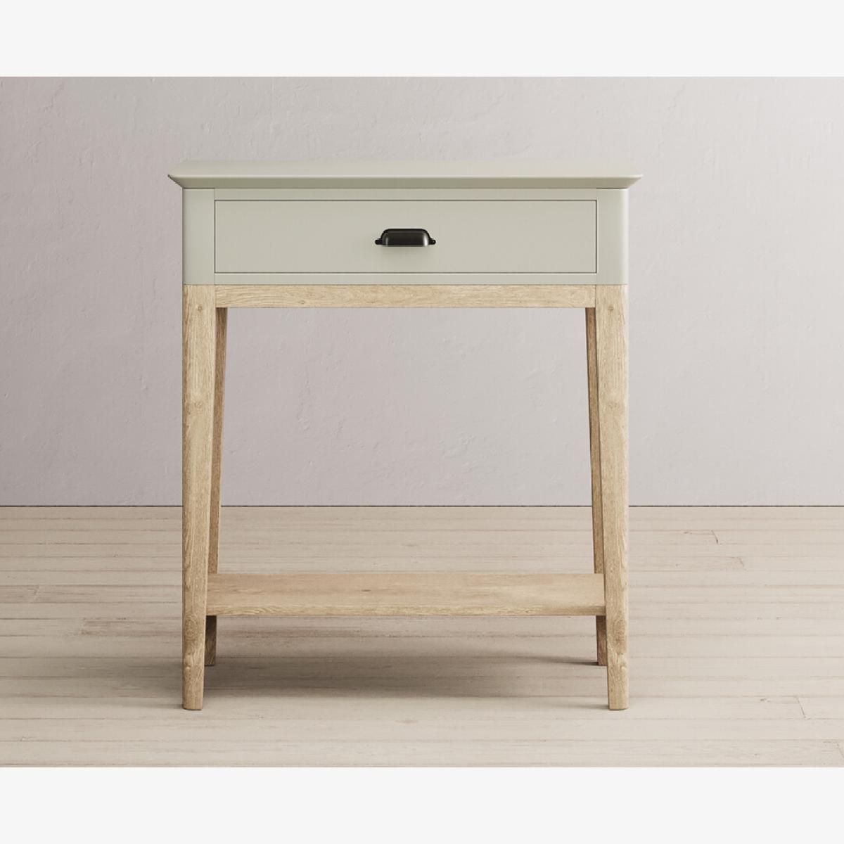 The Ancona Oak and Soft Green Painted Console Table is a green painted solid hardwood and solid oak console table with drawers.
