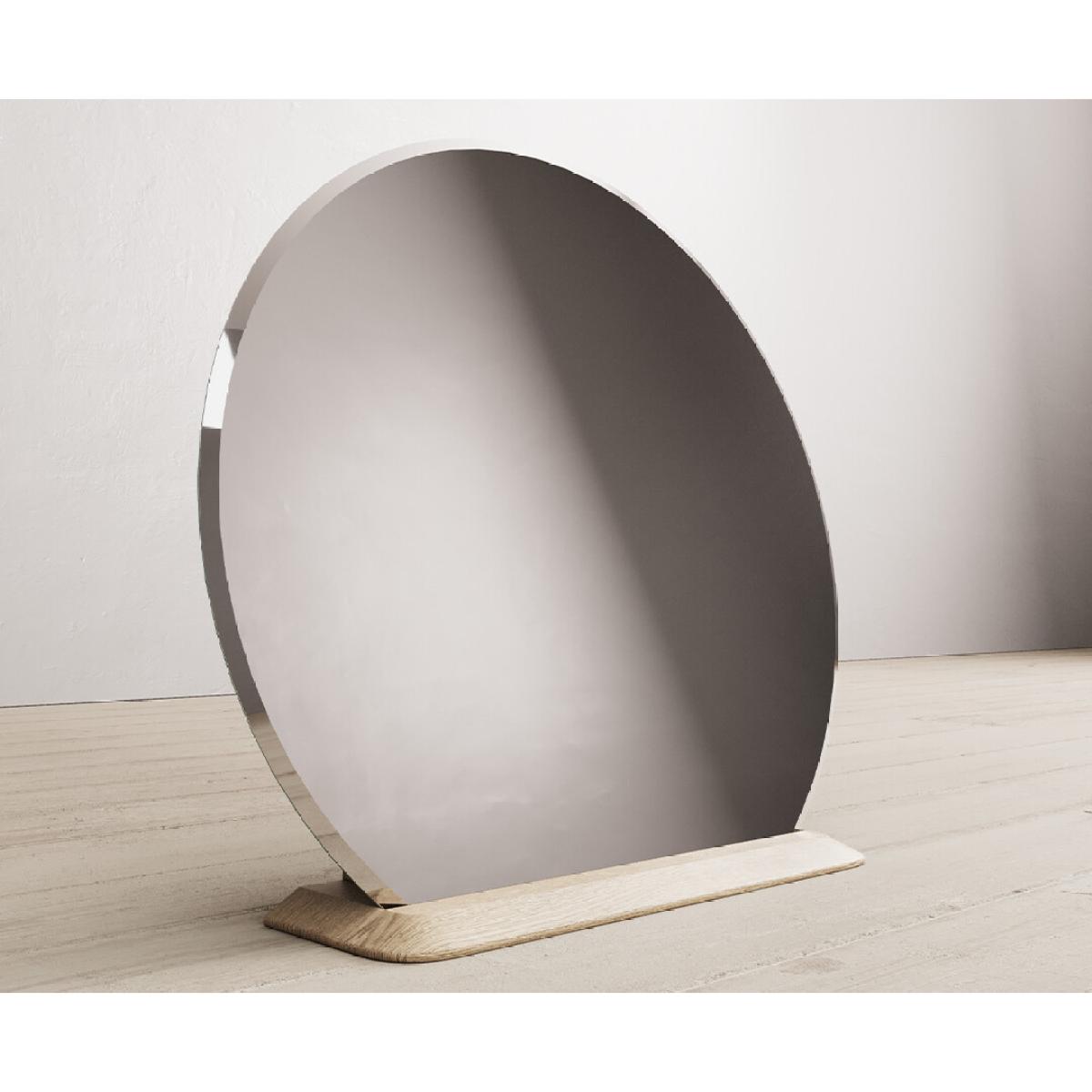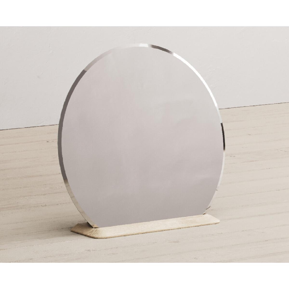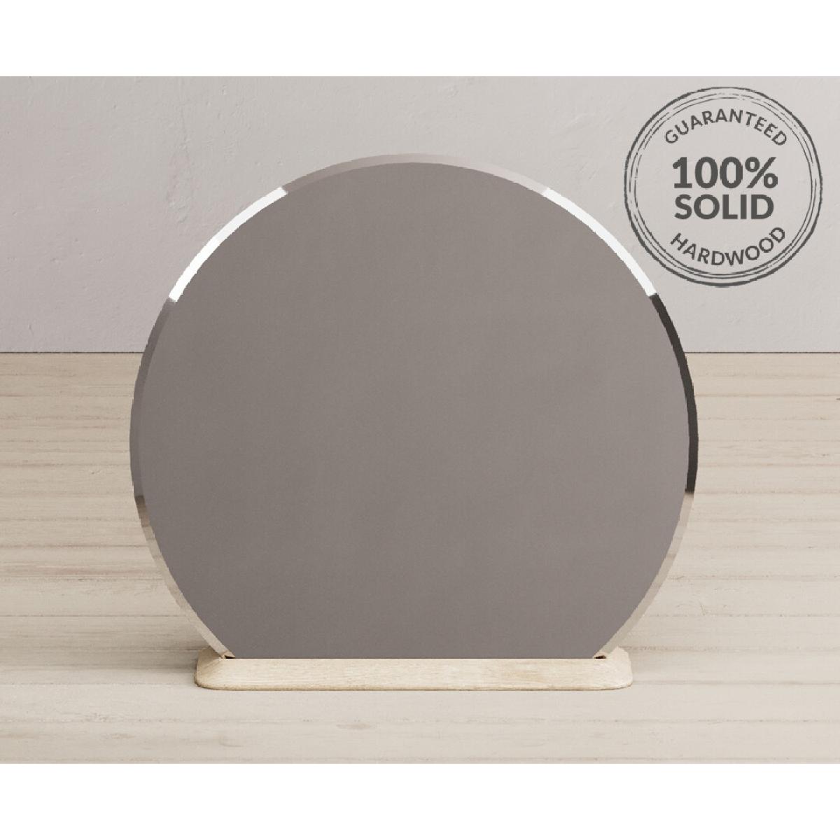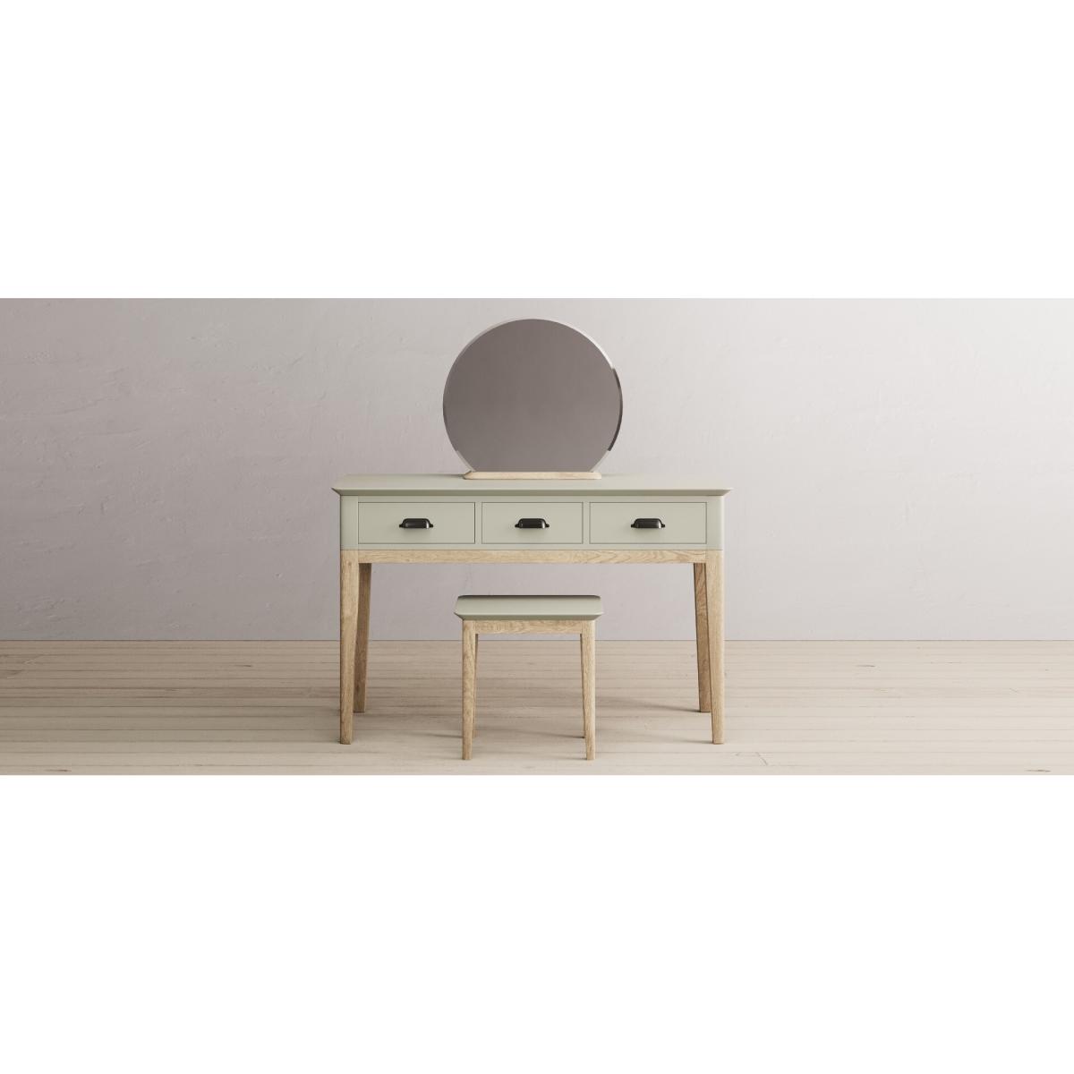 The Ancona Oak and Soft Green Painted Dressing Table Mirror is a round retro style mirror with a sturdy solid oak base.