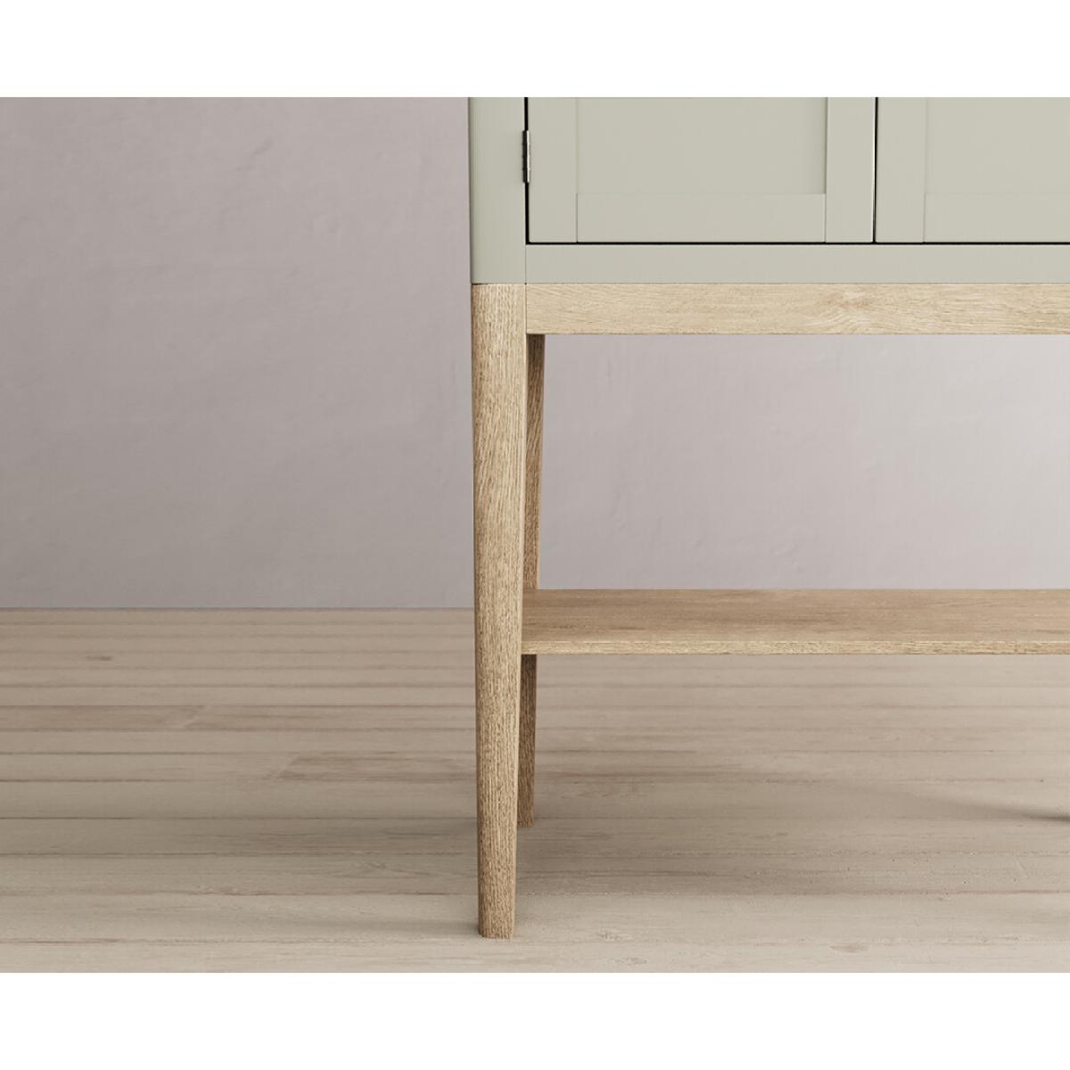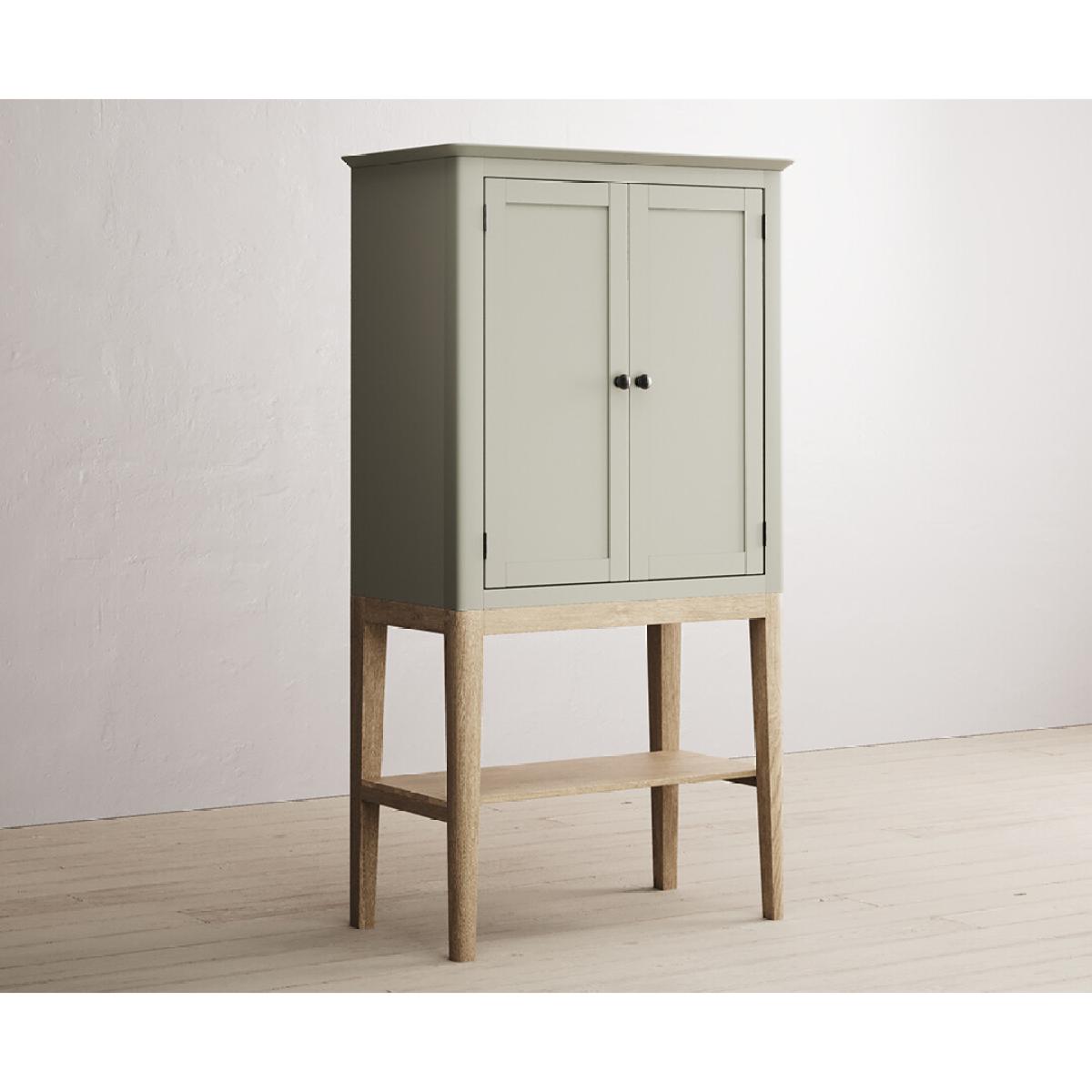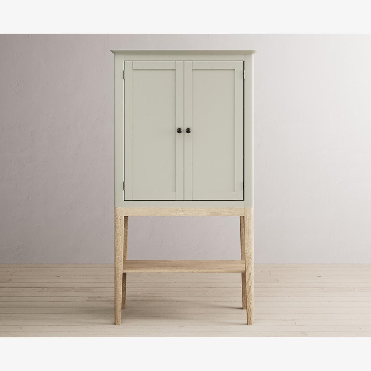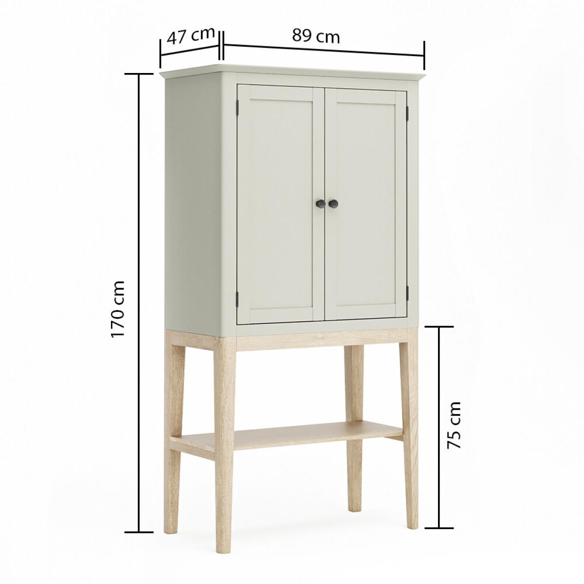 The Ancona Oak and Soft Green Painted Tall Storage Cabinet is a versatile storage cabinet with a green painted frame and solid oak base and legs.