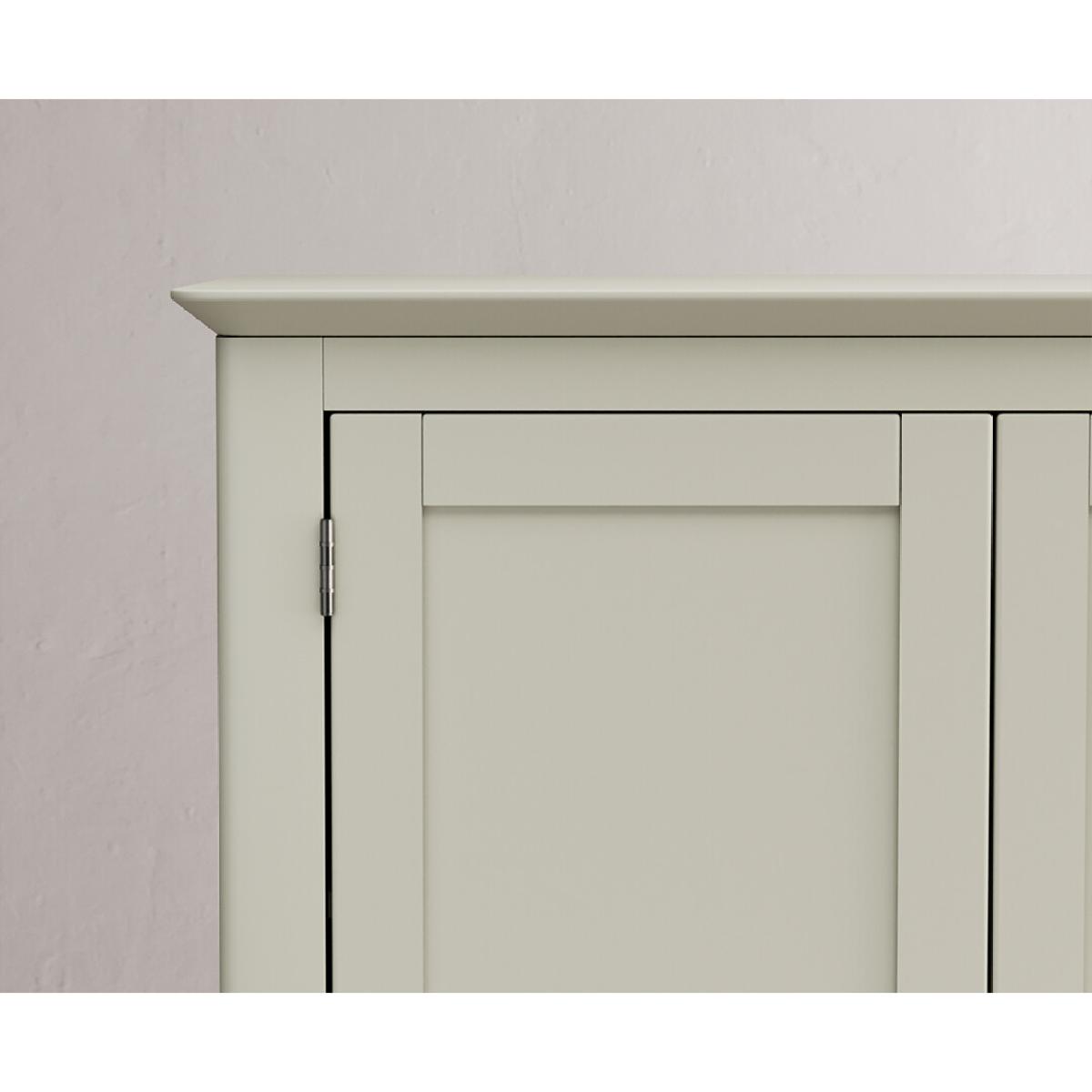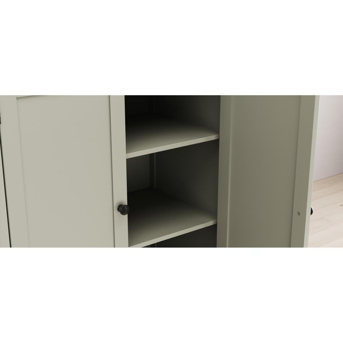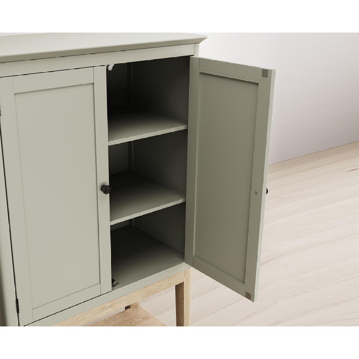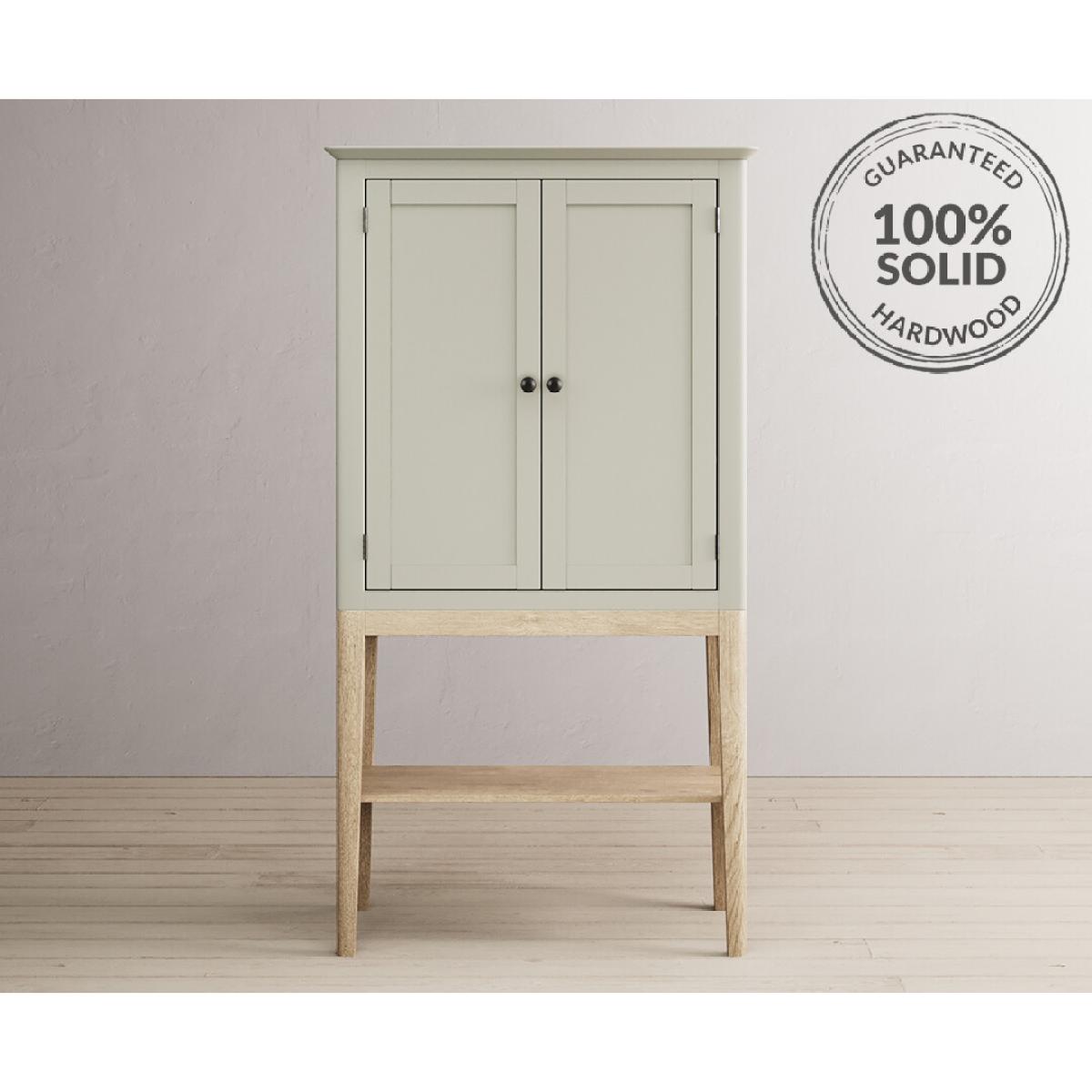 The Ancona Oak and Soft Green Painted Tall Storage Cabinet is a versatile storage cabinet with a green painted frame and solid oak base and legs.