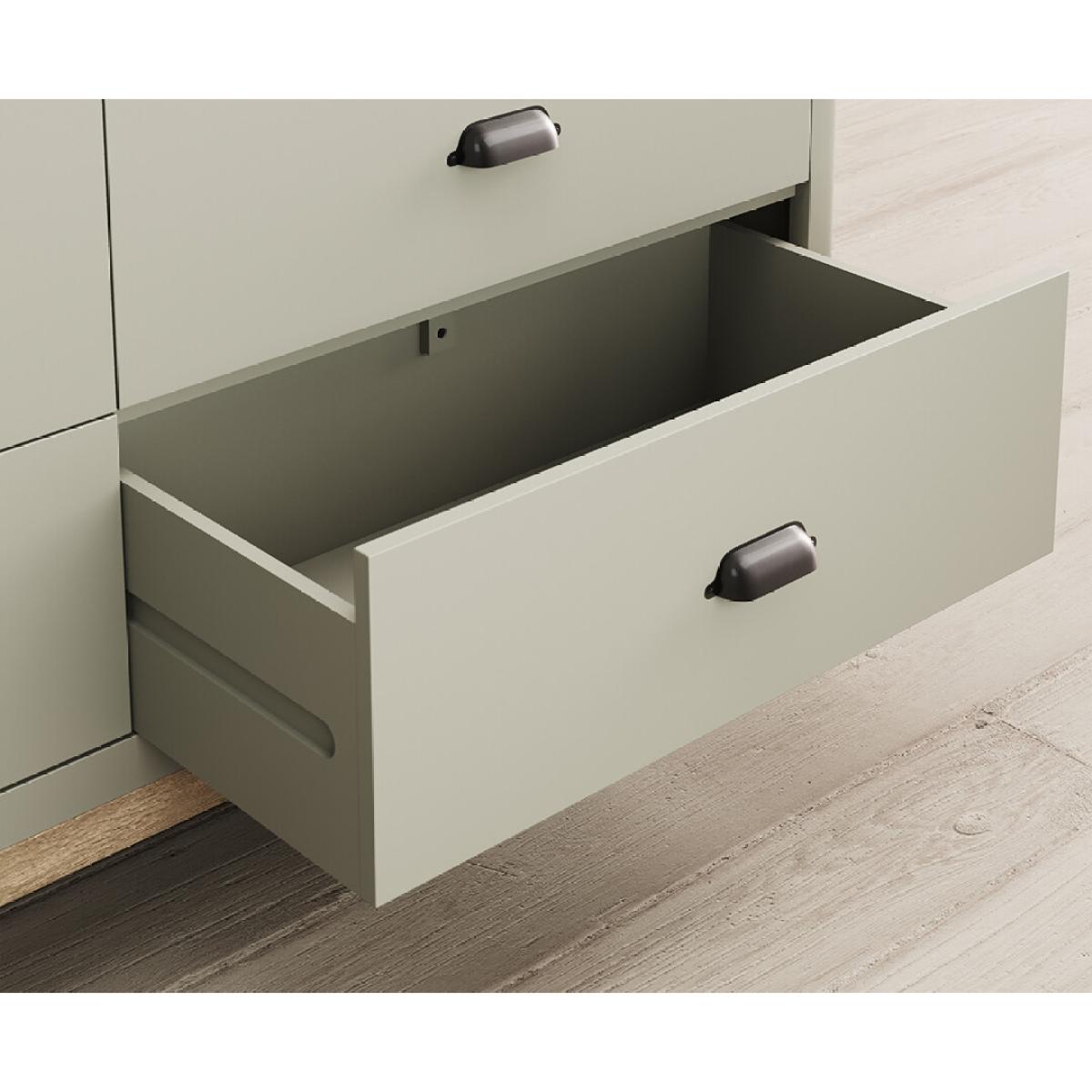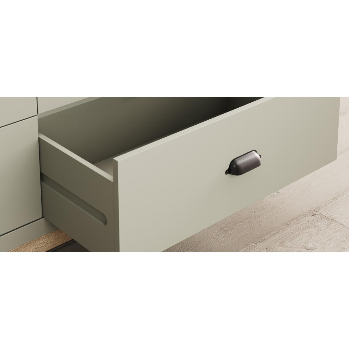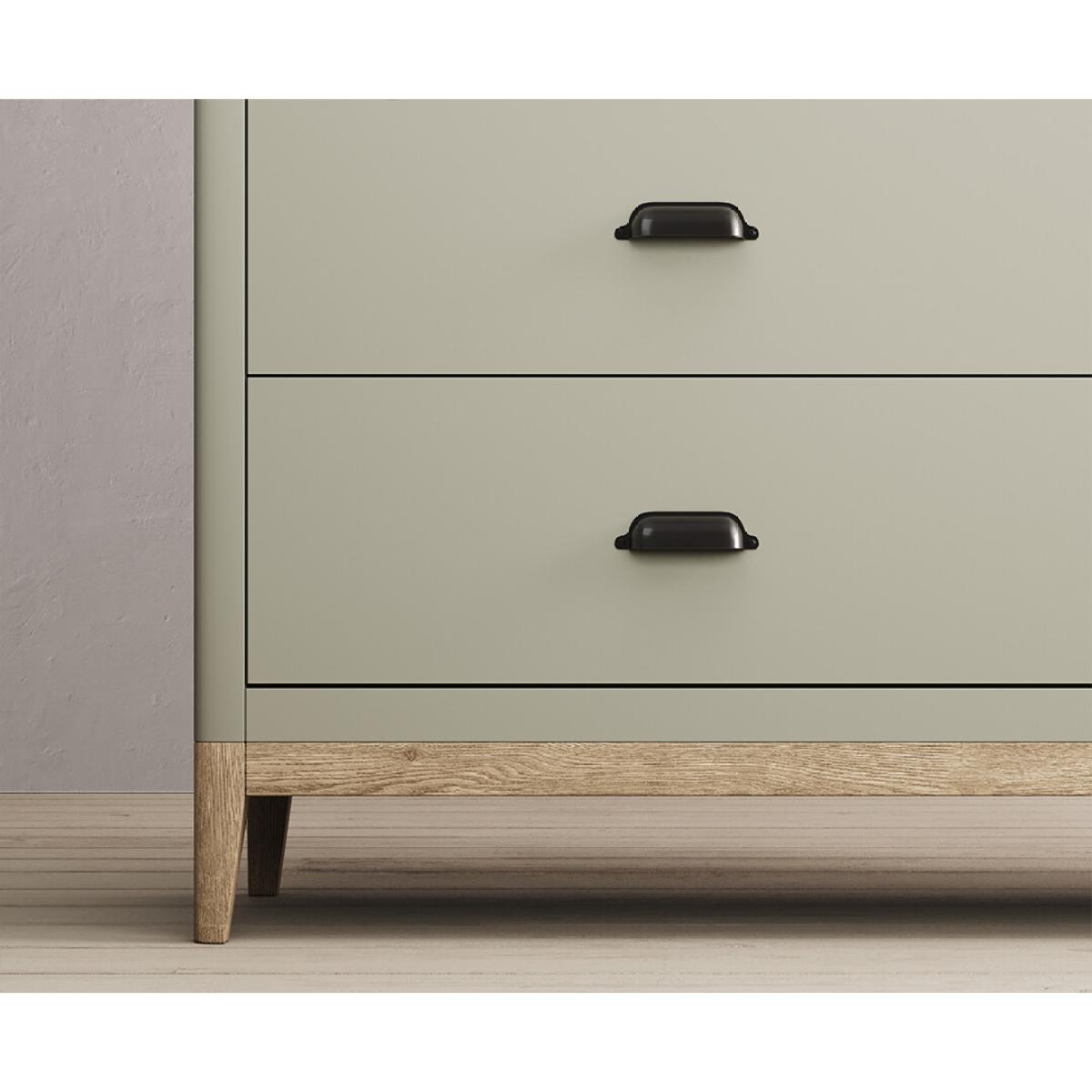 I love this piece for its versatile colour palette and practical design; the soft green painted finish combined with the oak accents makes it a great addition to both modern and traditional interiors. It works well in bedrooms, living rooms, or even hallway spaces, providing ample storage without overwhelming the room. To style it, consider keeping the surface minimal-perhaps a sleek lamp or a few decorative items-to emphasise its clean lines. Adding textured textiles or complementary colours in nearby accessories can help create a balanced, cohesive look. This chest is particularly effective when placed in interiors with a light, airy aesthetic, but can also serve as a statement piece in more eclectic or muted schemes.
