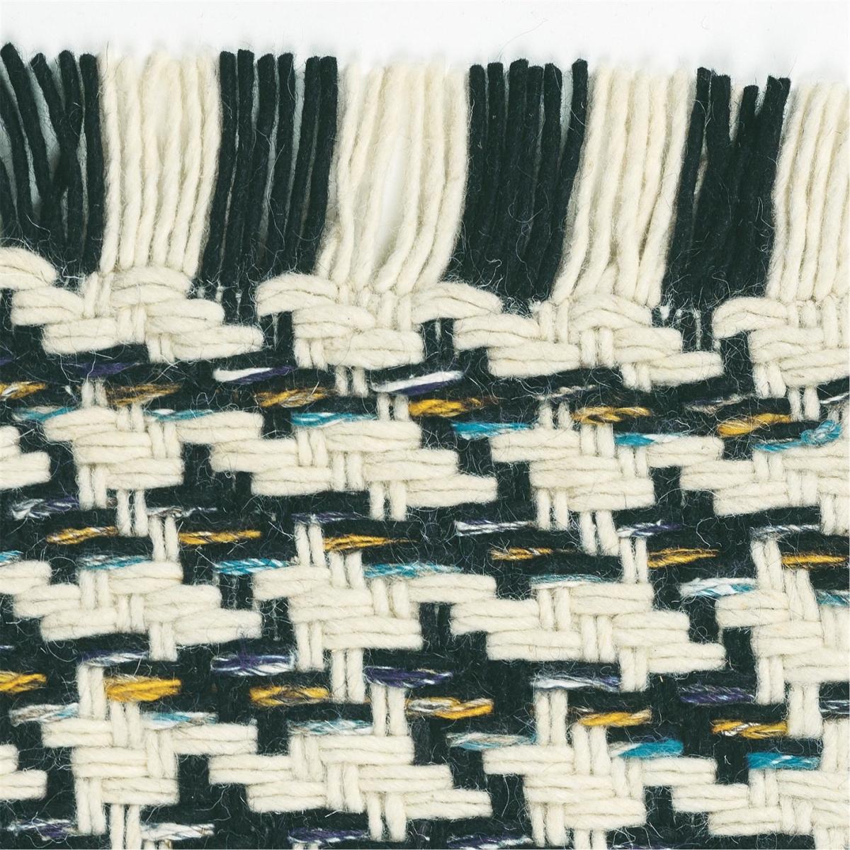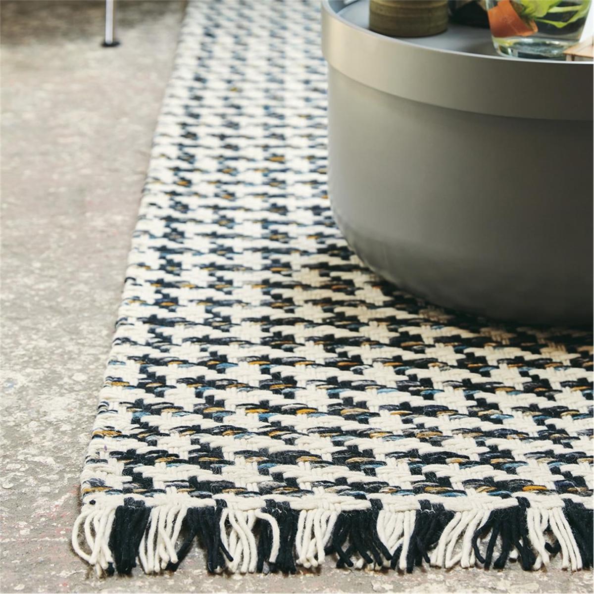 Add bold style to your living room with this Atelier Poule rug from Brink & Campman. Expertly hand crafted from a pure new wool and viscose blend, this rug has a luxuriously thick weave construction. Putting a contemporary twist on traditional Indian Dhurrie rugs, it features a sophisticated hounds tooth design in black and white with blue and yellow yarn subtly woven in. Finished with a fringed edge, this rug is perfect for making a statement in any interior.