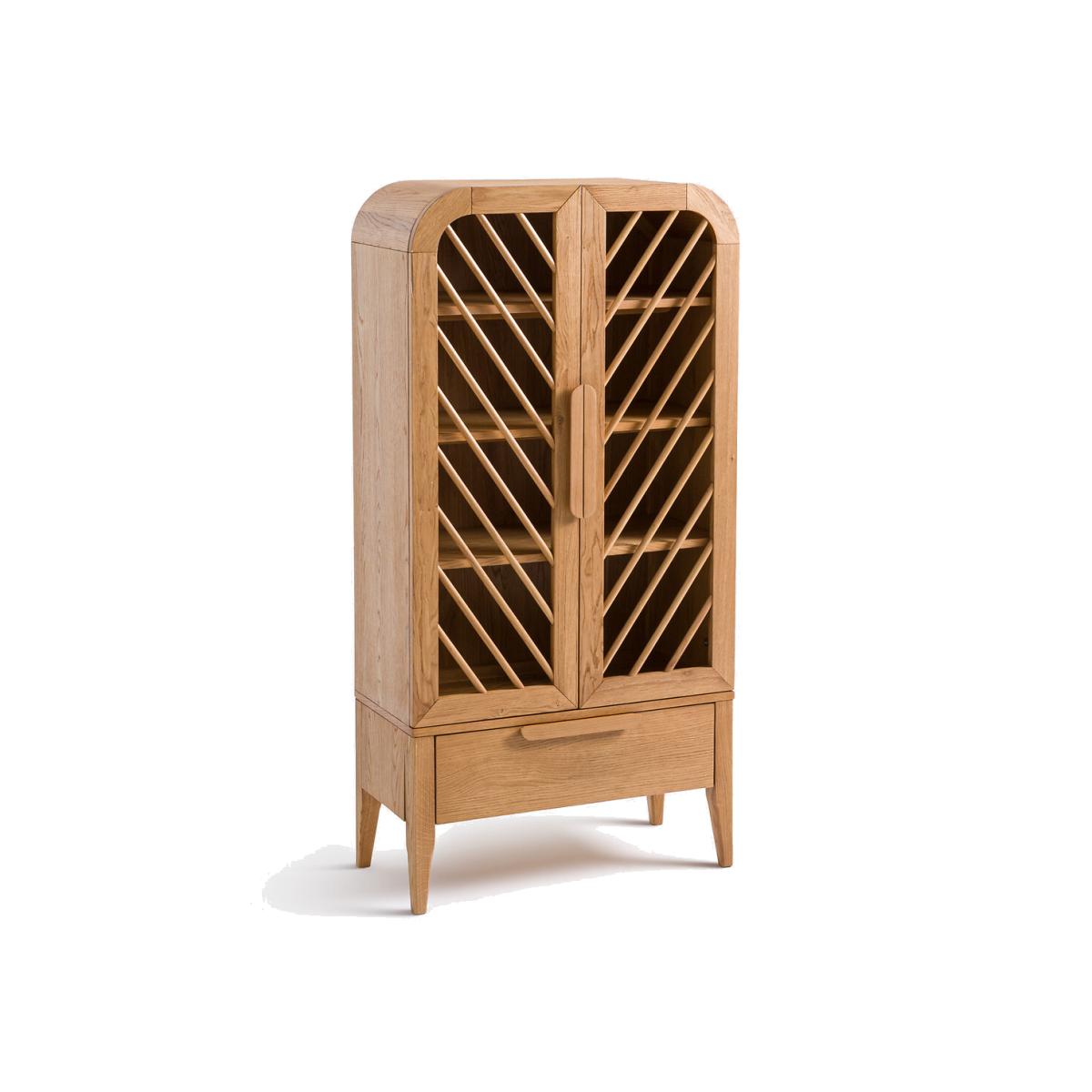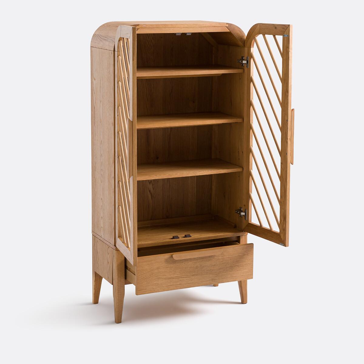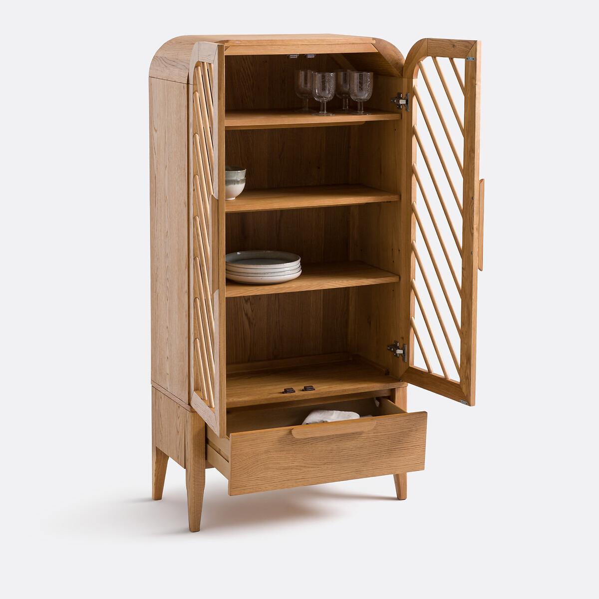 Contemporary design and aesthetics. The Anda high dresser in FSC®-certified oak Mixed. With its rounded curves and tapered feet, it loves contrasts. It has 2 openwork doors, ideal for displaying crockery and knick-knacks. And a full drawer for storing table linen or game boxes. Designed by La Redoute Intérieurs. Product Details • Frame and legs in solid oak, finished in clear nitrocellulose varnish • Drawers in oak veneered MDF with clear nitrocellulose varnish finish • FSC® Mixed certified wood • 2 doors, 1 drawer • 4 interior shelves • People required for assembly: 2Dimensions. Overall • Width: 38cm • Height: 160cm • Length: 80cm • Weight: 59kg. Usable space • Shelf: P34 x thickness. 2cm/1" • Drawer:W70 x H20 x D30cm • Height of legs: 40cm • This product requires assembly. • WOOD FROM MORE SUSTAINABLY MANAGED FORESTS AND CONTROLLED SOURCES. FSC® Mix wood contains at least 70% FSC® certified and/or recycled wood, the remainder being FSC® controlled wood. Dimensions and weight of parcel1 parcel • W88 x H150.5 x D47cm. 68kg
