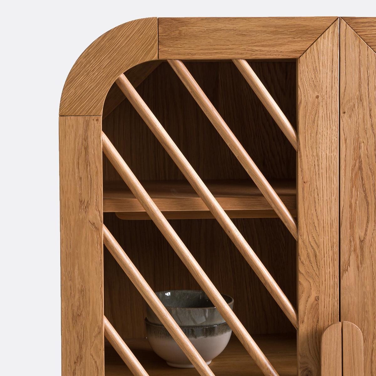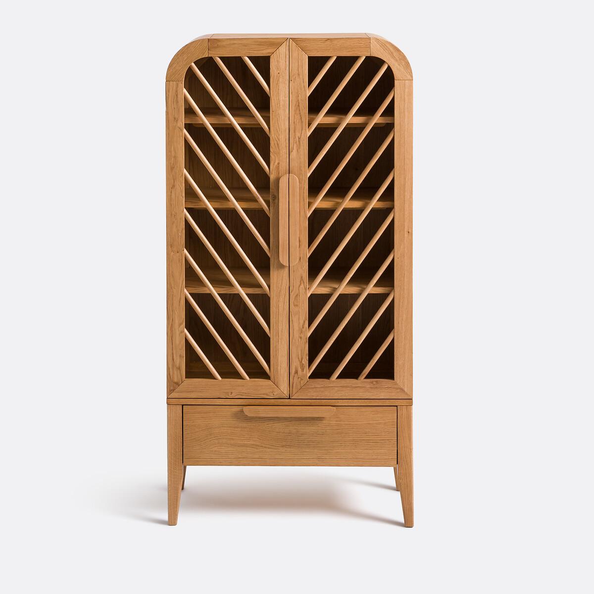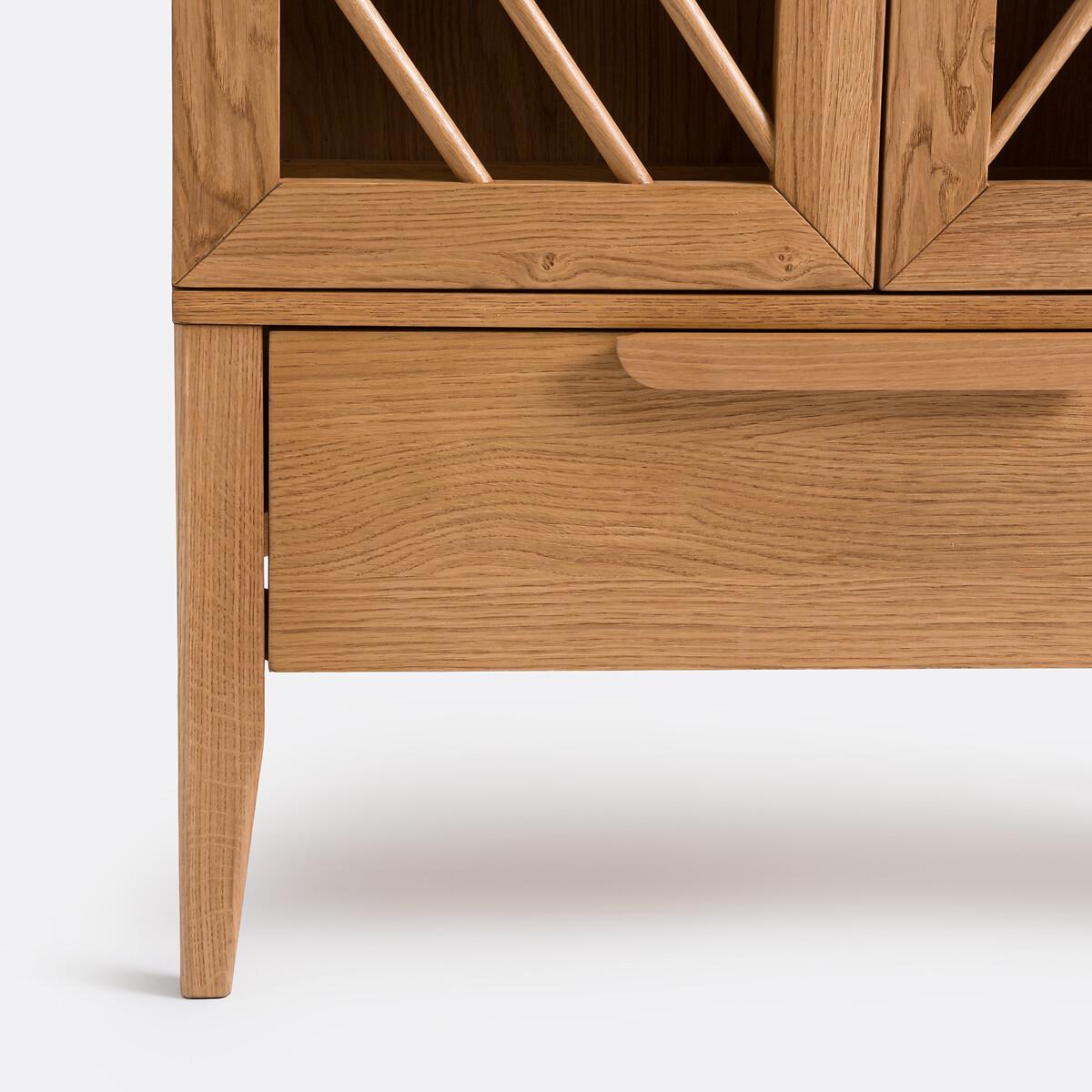 Contemporary design and aesthetics. The Anda high dresser in FSC®-certified oak Mixed. With its rounded curves and tapered feet, it loves contrasts. It has 2 openwork doors, ideal for displaying crockery and knick-knacks. And a full drawer for storing table linen or game boxes. Designed by La Redoute Intérieurs. Product Details • Frame and legs in solid oak, finished in clear nitrocellulose varnish • Drawers in oak veneered MDF with clear nitrocellulose varnish finish • FSC® Mixed certified wood • 2 doors, 1 drawer • 4 interior shelves • People required for assembly: 2Dimensions. Overall • Width: 38cm • Height: 160cm • Length: 80cm • Weight: 59kg. Usable space • Shelf: P34 x thickness. 2cm/1" • Drawer:W70 x H20 x D30cm • Height of legs: 40cm • This product requires assembly. • WOOD FROM MORE SUSTAINABLY MANAGED FORESTS AND CONTROLLED SOURCES. FSC® Mix wood contains at least 70% FSC® certified and/or recycled wood, the remainder being FSC® controlled wood. Dimensions and weight of parcel1 parcel • W88 x H150.5 x D47cm. 68kg