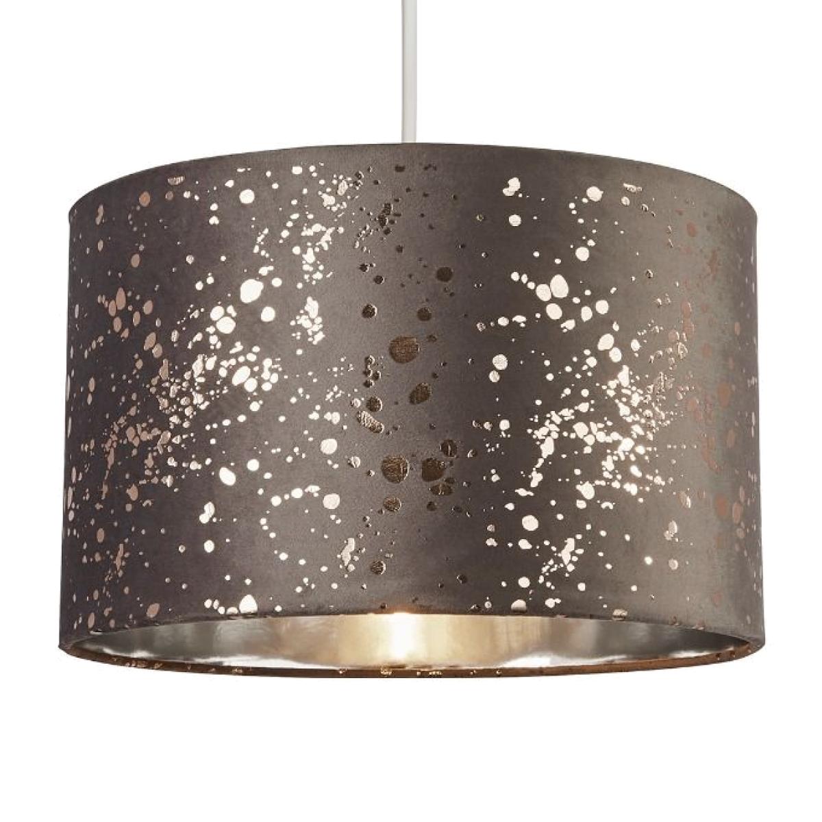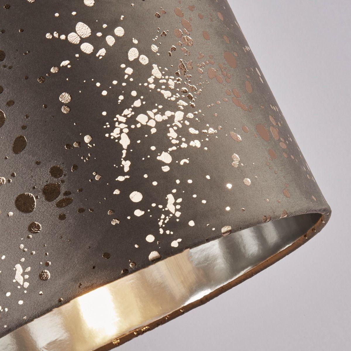 Contemporary grey velvet shade with spot detailing and silver inner  Complete your space with the stunning Ander velvet ceiling shade boasting a luxe velvet finish and metallic spot detailing. Designed with a bright silver inner which reflects the light around the room when lit.  Contemporary grey velvet shade with spot detailing and silver inner  Complete your space with the stunning Ander velvet ceiling shade boasting a luxe velvet finish and metallic spot detailing. Designed with a bright silver inner which reflects the light around the room when lit.