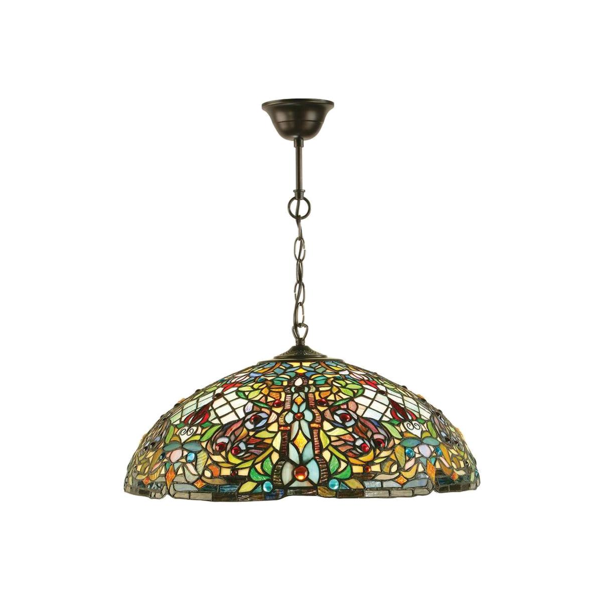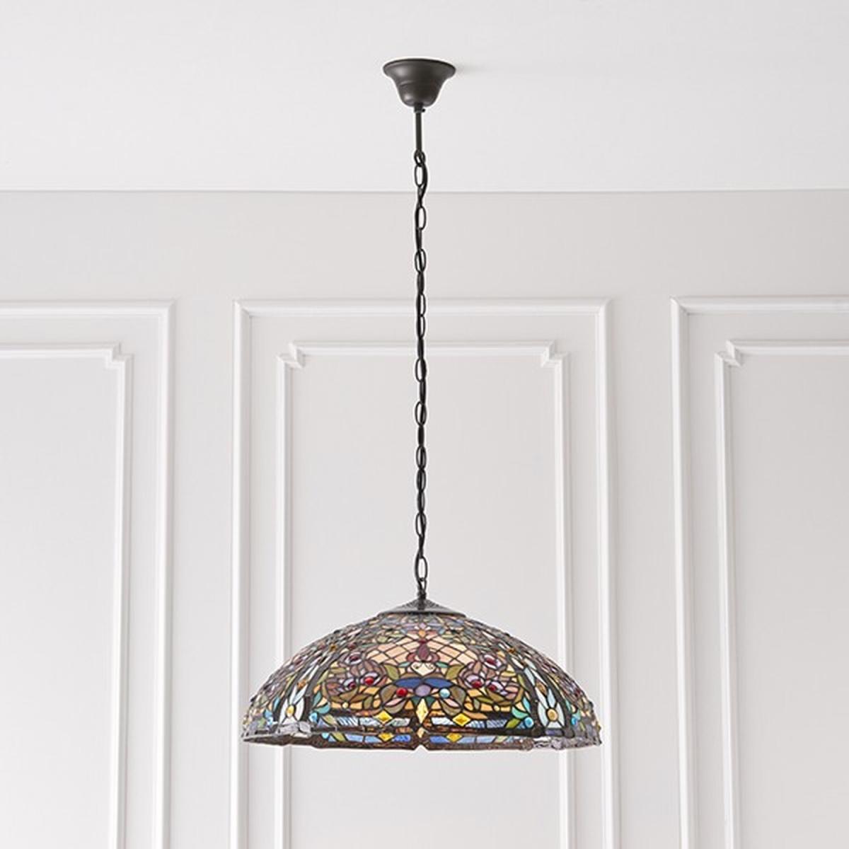 The pendant combines a brightly coloured, traditional American style Tiffany shade, with a dark bronze effect fitting. Matching items available.