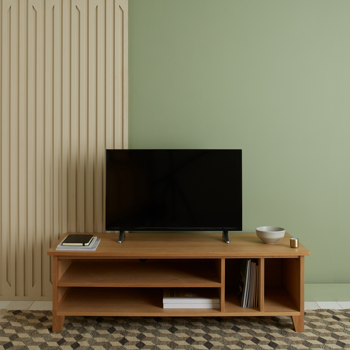 This solid oak TV stand offers a clean, natural aesthetic that works beautifully in both contemporary and rustic interiors. I love its minimal design and generous open shelving, which allows for ample storage and display space without feeling cluttered. It pairs well with neutral tones and can be styled with woven baskets, books, or decorative objects to add warmth. For practical tips, consider placing a few small lamps or LED lights on the shelves to enhance the ambiance and keep the space functional. It’s versatile enough to suit living rooms with a Scandi vibe or more traditional settings, making it a reliable piece that combines practicality with timeless style.